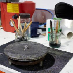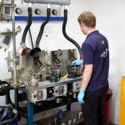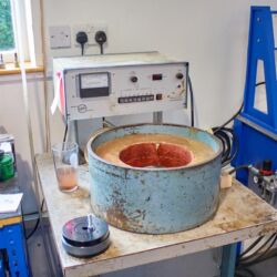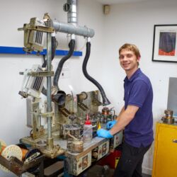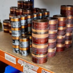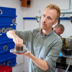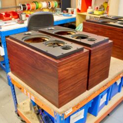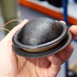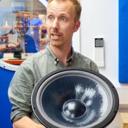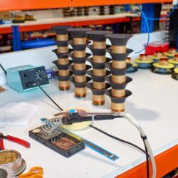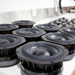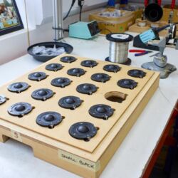 Die Zahl der Mitarbeiter spiegelt ATCs Manufaktur-Anspruch: Abgesehen von Gehäusen, die von einem ortsansässigen Spezialisten geliefert werden, und den Spulenträgern baut der Hersteller alle Bestandteile seiner Produkte selbst. In der kleinen Werkshalle werden wir Zeuge, wie Mitarbeiter/innen Membranen in Form pressen und die Staubkappen einkleben. Einen Raum weiter steht eine archaische Maschine, die den Schwingspulendraht plättet. Auf die Weise lassen sich 20 Prozent mehr Kupfer um den Träger wickeln, was die Antriebskraft pusht. In der großen Halle nimmt derweil ein Angestellter kreisrunde Eisenstücke von einem Rollwagen und verwandelt sie in einem aus den Urzeiten des Unternehmens stammenden Ungetüm in Permanentmagneten. An einem knappen halben Dutzend Arbeitsplätze werden die Einzelteile schließlich zu fertigen Chassis verheiratet.