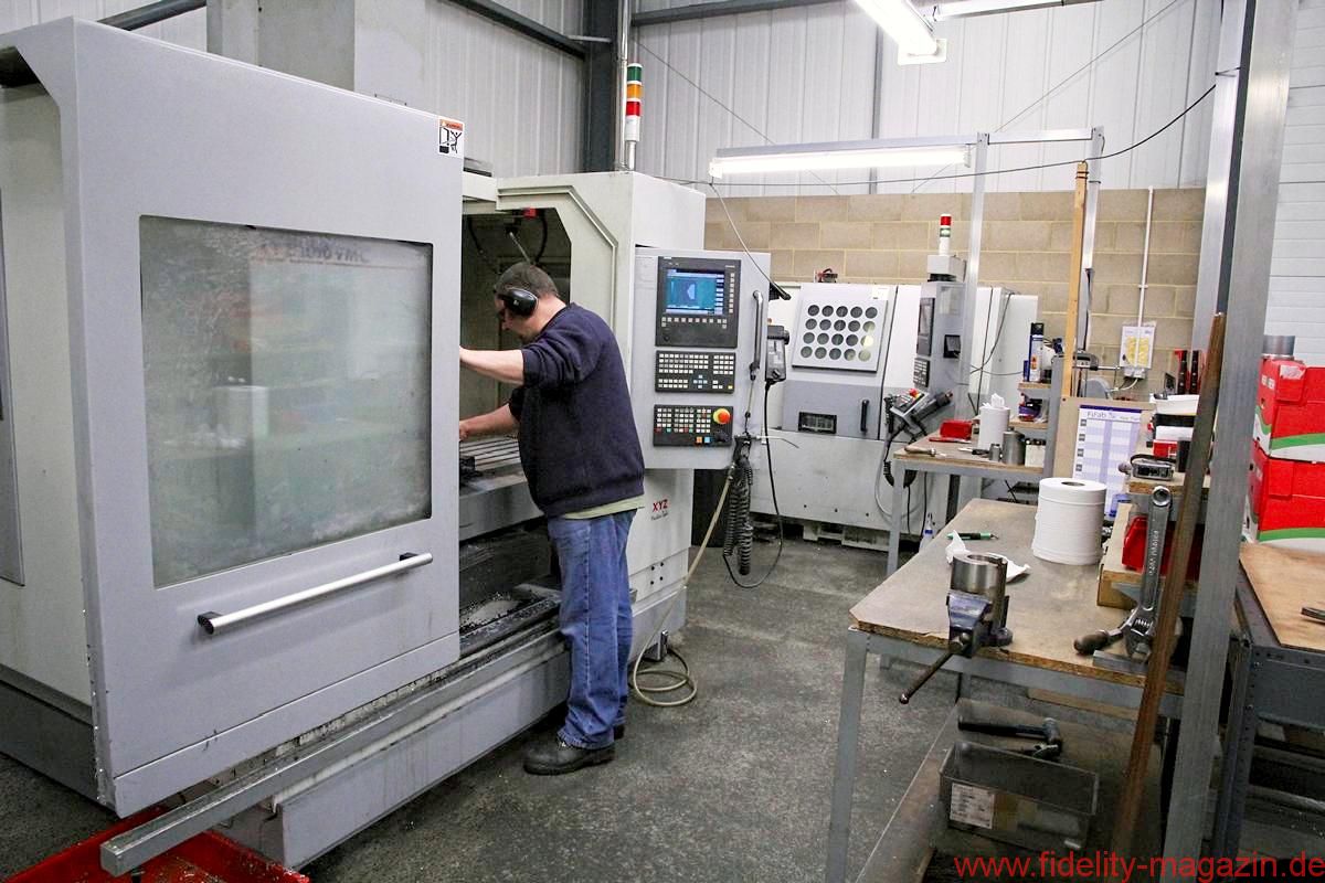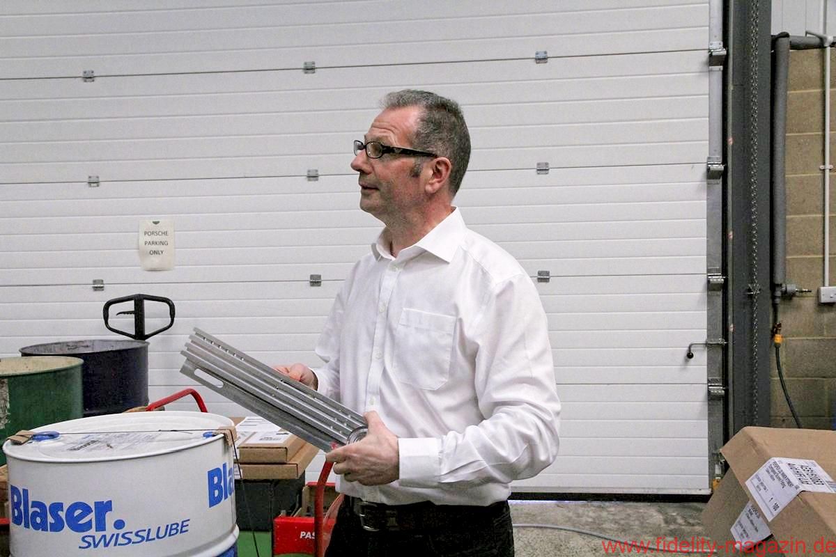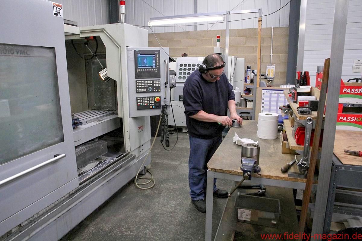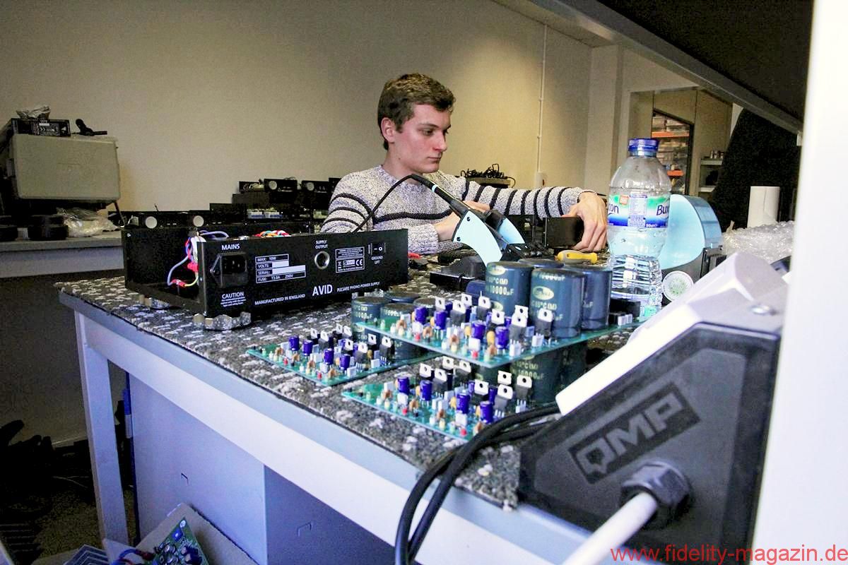 Spannend ist aber auch das, was all die feinen Maschinen produzieren, die wir nun in der großen Halle besuchen werden. Herrscher des Maschinenparks ist Gary Cooper, der nicht die geringste Ähnlichkeit mit dem gleichnamigen Hollywoodstar aufweist (sondern eher mit dem jungen John Belushi). Gary trägt Schutzbrille und Gehörschutz und genießt den Ruf eines ebenso schweigsamen wie hochtalentierten Meisters des Setups. Er war zuvor unter anderem bei QUAD, die nur wenige Kilometer entfernt residieren, als Produktionsleiter tätig und wirkt, als könne ihn grundsätzlich nichts aus der Ruhe bringen. Ebenfalls schweigsam und konzentriert sitzt im Nebenraum ein junger Mann an seinem Tageswerk. George Brydon lötet und baut heute eine Kleinserie von Phonoentzerrern zusammen, da wollen wir nicht lange stören und verdrücken uns wieder, schlängeln uns zwischen Schwerlastregalen voller Netzteile und einer zweiten Werkbank hindurch; es geht zurück in die Halle. Dort umrunden wir diverse Lagen von IsoTek-Frontplatten – auch die Netzfilterexperten lassen bei AVID Teile fertigen – und beäugen frisch gefräste Werkstücke, die bis zum endgültigen Edel-Finish noch ordentlich poliert werden müssen. Jetzt noch kurz eine Treppe hinauf, an weiteren gut gefüllten Lagerregalen vorbei, und quasi durch die Hintertür kehren wir zurück zu den leeren Kaffeetassen im Besprechungsraum.