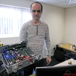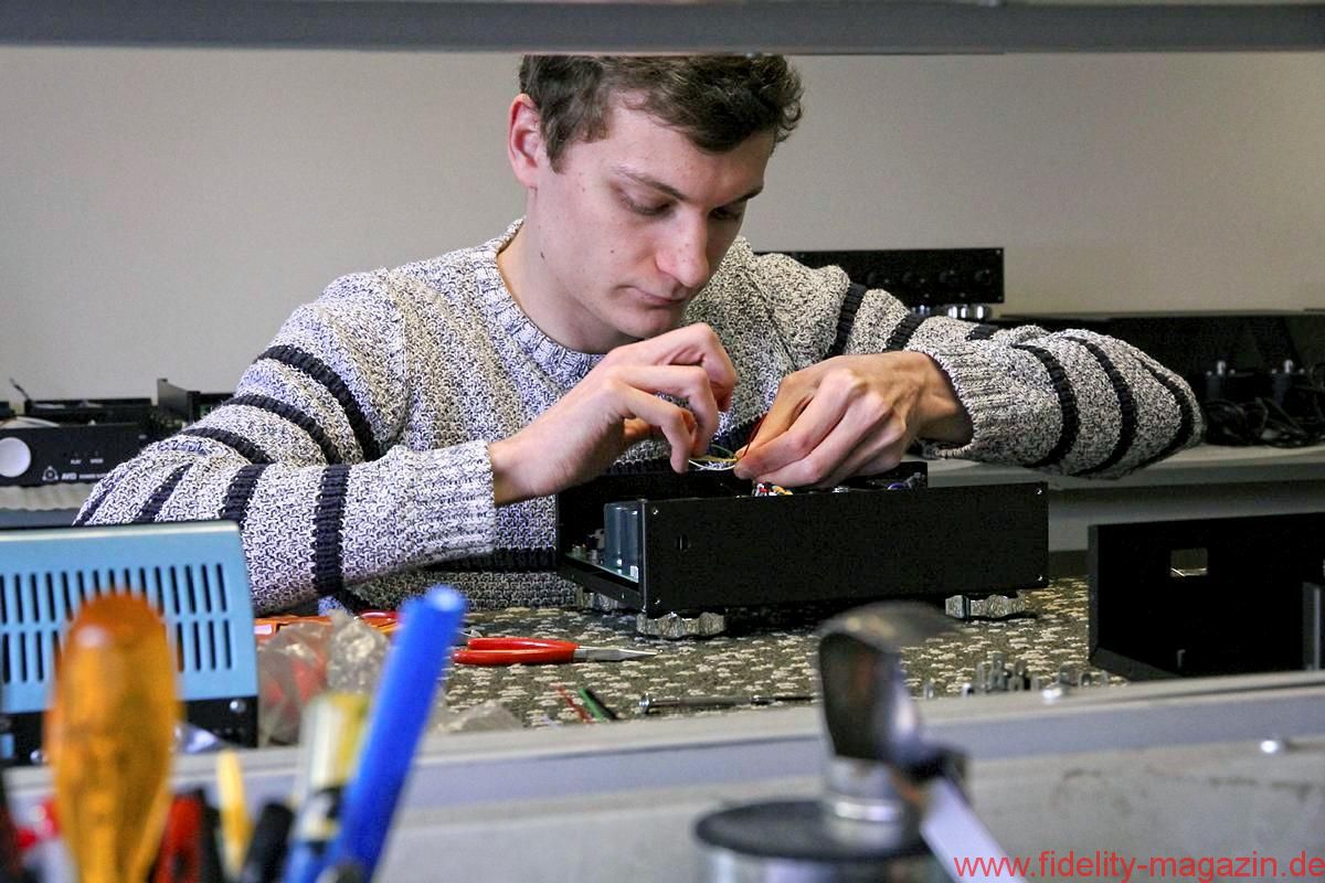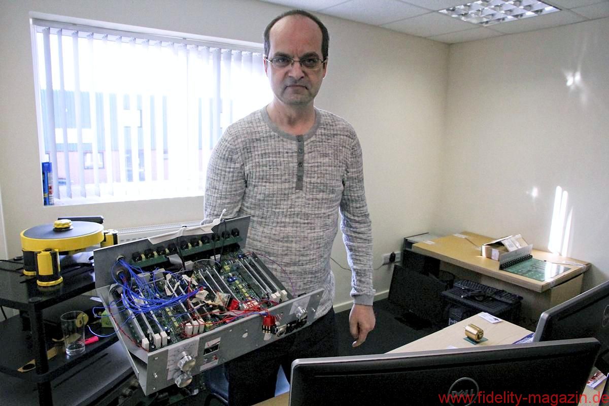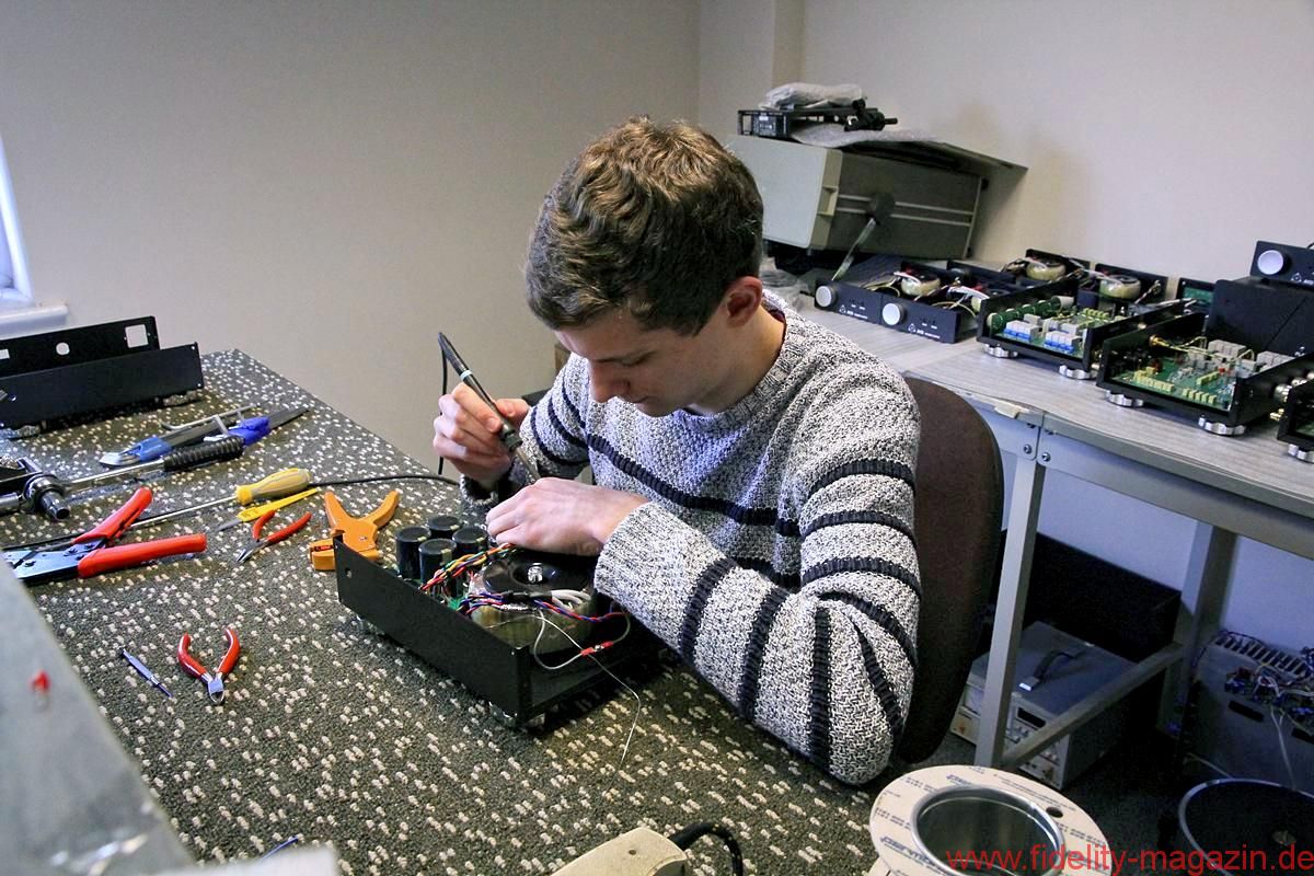 Spannend ist aber auch das, was all die feinen Maschinen produzieren, die wir nun in der großen Halle besuchen werden. Herrscher des Maschinenparks ist Gary Cooper, der nicht die geringste Ähnlichkeit mit dem gleichnamigen Hollywoodstar aufweist (sondern eher mit dem jungen John Belushi). Gary trägt Schutzbrille und Gehörschutz und genießt den Ruf eines ebenso schweigsamen wie hochtalentierten Meisters des Setups. Er war zuvor unter anderem bei QUAD, die nur wenige Kilometer entfernt residieren, als Produktionsleiter tätig und wirkt, als könne ihn grundsätzlich nichts aus der Ruhe bringen. Ebenfalls schweigsam und konzentriert sitzt im Nebenraum ein junger Mann an seinem Tageswerk. George Brydon lötet und baut heute eine Kleinserie von Phonoentzerrern zusammen, da wollen wir nicht lange stören und verdrücken uns wieder, schlängeln uns zwischen Schwerlastregalen voller Netzteile und einer zweiten Werkbank hindurch; es geht zurück in die Halle. Dort umrunden wir diverse Lagen von IsoTek-Frontplatten – auch die Netzfilterexperten lassen bei AVID Teile fertigen – und beäugen frisch gefräste Werkstücke, die bis zum endgültigen Edel-Finish noch ordentlich poliert werden müssen. Jetzt noch kurz eine Treppe hinauf, an weiteren gut gefüllten Lagerregalen vorbei, und quasi durch die Hintertür kehren wir zurück zu den leeren Kaffeetassen im Besprechungsraum.