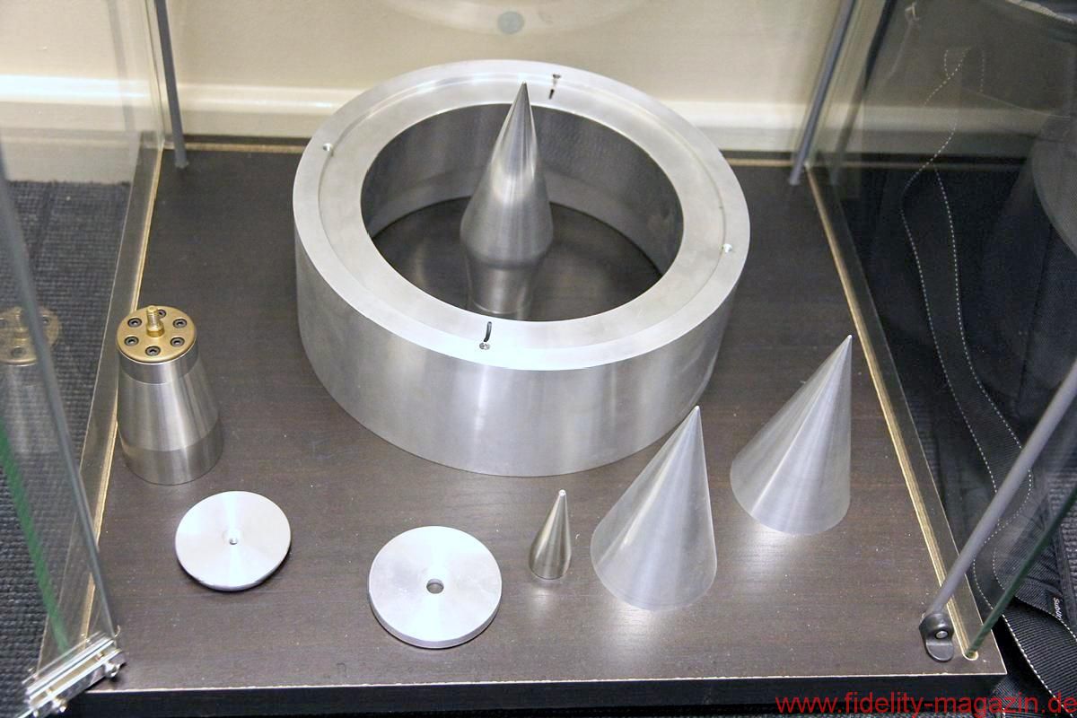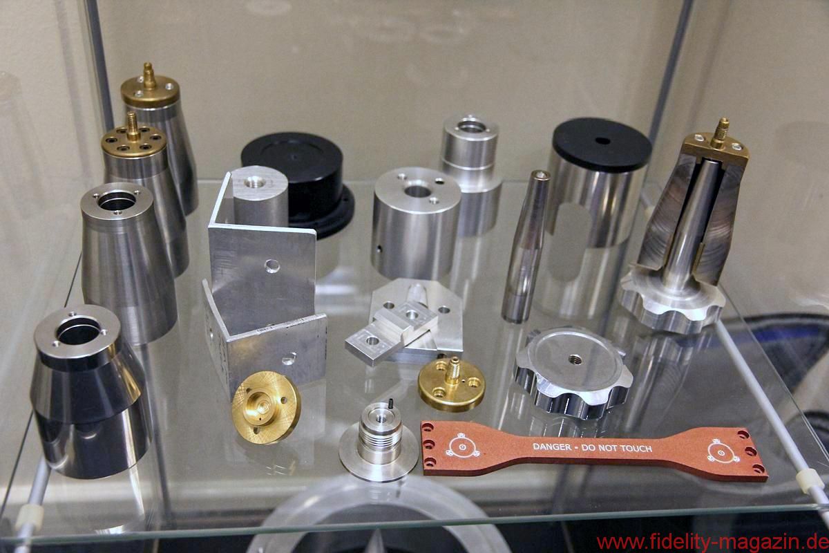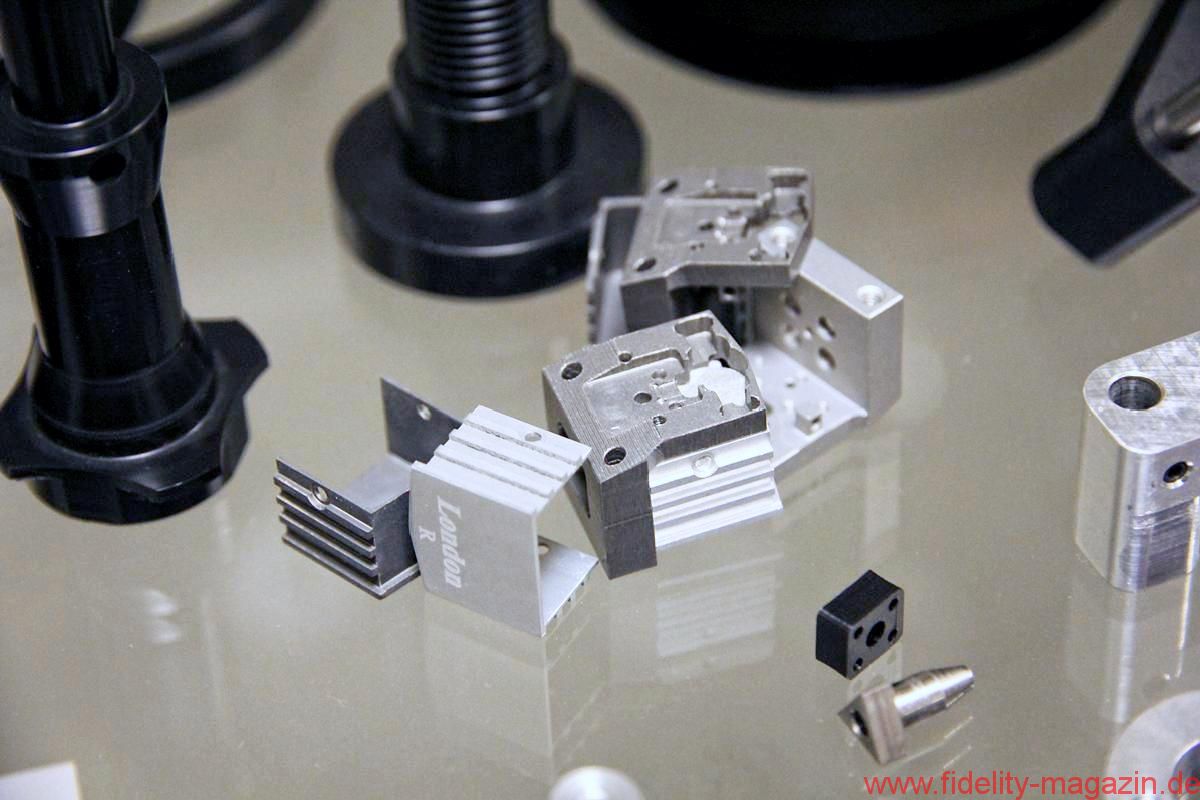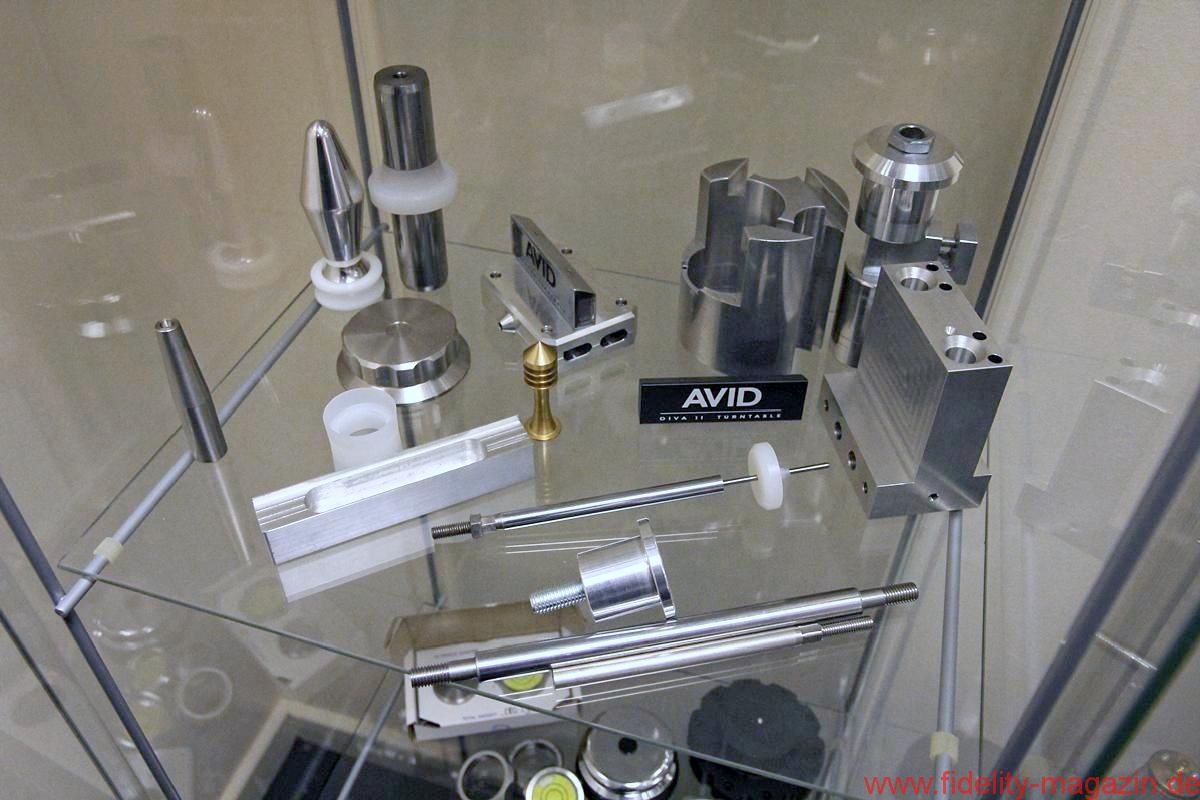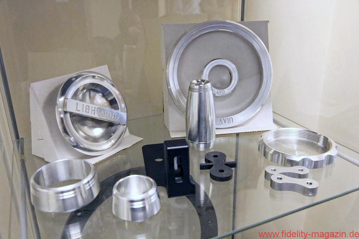 An der ausgeprägten Dienstleistungsmentalität hat sich bis heute nichts geändert: Nach wie vor entwickelt, produziert und veredelt AVID Präzisionsteile für Unternehmen aus der Medizin- und Militärtechnik, für Highend-Audio- und Automobilfirmen. Das zehnköpfige Team war zuvor auch schon für Musical Fidelity, QUAD und Wharfedale tätig. AVID hat Canon und Nikon mit Zubehörteilen beliefert, aber auch einen Tonarmschlitten für den Naim Audio Aro im Programm, den „Naim Slide“. Man fertigt zudem das Topmodell der Decca/London-Tonabnehmerserie, das „Reference“, komplett; lediglich die winzigen Spulen werden zugeliefert. Man ist mit diversen Spezialteilen an einem elektrischen Supersportwagen-Konzept namens Lightning GT beteiligt, baut aber auch ein nahezu komplettes Hornlautsprechersystem, über das man nicht konkret sprechen darf. Und dann thront da noch ein knallgelbes AVID-Laufwerk auf einem hauseigenen Isorak-Möbel, das im Zuge eines kurzzeitigen Kooperationsangebots durch Aston Martin entstand. Zwei Glasvitrinen im anderen Zimmereck zeigen viele weitere Delikatessen der Feinmechanik, Teile von Wünschelruten und Klebepistolen etwa, aber auch die vielgerühmten Plattenklemmen für die hauseigenen Laufwerke.