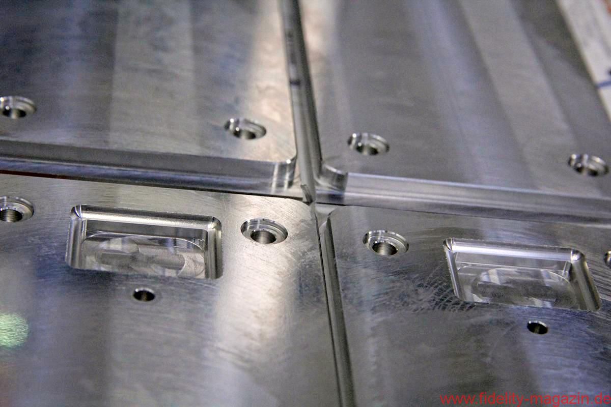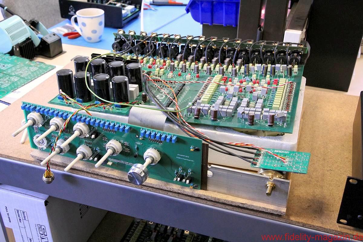 Die im nächsten Raum zu sehen ist. Oder auch nicht. Denn eine tolle Platine und einige superexklusive Bauteile lassen noch kein bildhaftes 3D-Modell vor dem geistigen Auge entstehen; das wird erst später als Rendering im typischen AVID-Design auf einem Monitor sichtbar. Zumindest aber wird klar, dass AVID nach der erfolgreichen Erweiterung seiner Präzisionsmechanik (Laufwerke, Phonomöbel) um adäquate Elektronik (Plattenspielernetzteile, Phonoentzerrer) diese Linie weiter ausbauen wird. Die erste Kombination aus Vor- und Endstufe steht unmittelbar vor der Tür. Wie bei AVID üblich, feiert man die Premiere eines neuen Gerätetyps mit Cost-no-Object-Produkten, die ohne jeden Kostendruck schlicht „das Beste des Weltmarktes“ bieten sollen.