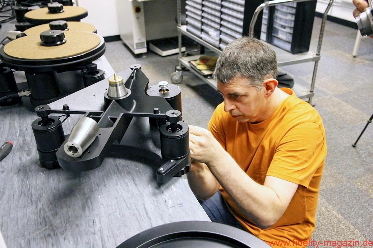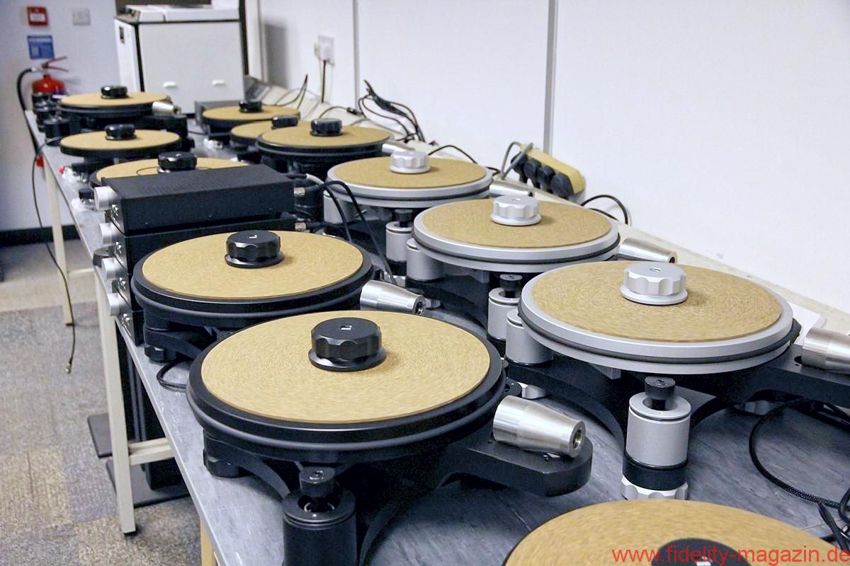 Wie ein solcher Traumwert in der Praxis entsteht, können wir nun bei einem kleinen Rundgang erfahren. Wir huschen rasch beim „Boss“ Sharon vorbei und über die Treppe hinab ins Erdgeschoss, und schon stehen wir in einem mittelgroßen Raum zwischen einer Charge auslieferungsreifer Laufwerke im Probelauf, einem Bestückungsautomaten und Bauteilregalen mit offenbar sauber sortiertem Inhalt. Hier treffen wir auch auf Bill „Golden Ears“ Clare, dessen Spitzname nicht von ungefähr kommt: Er ist der bevorzugte Kollege, wenn Conrad Mas betriebsintern zum kritischen Hören und Beurteilen einlädt. Bill erklärt und demonstriert mit der Ruhe des Könners, wie man die unterschiedlichen Laufwerke in Nullkommanix auf den Punkt justierten kann, warum in allen Modellen das identische, nicht weiter optimierbare Tellerlager steckt und dass er eigentlich gerade an der AVID-Zukunft schraubt.