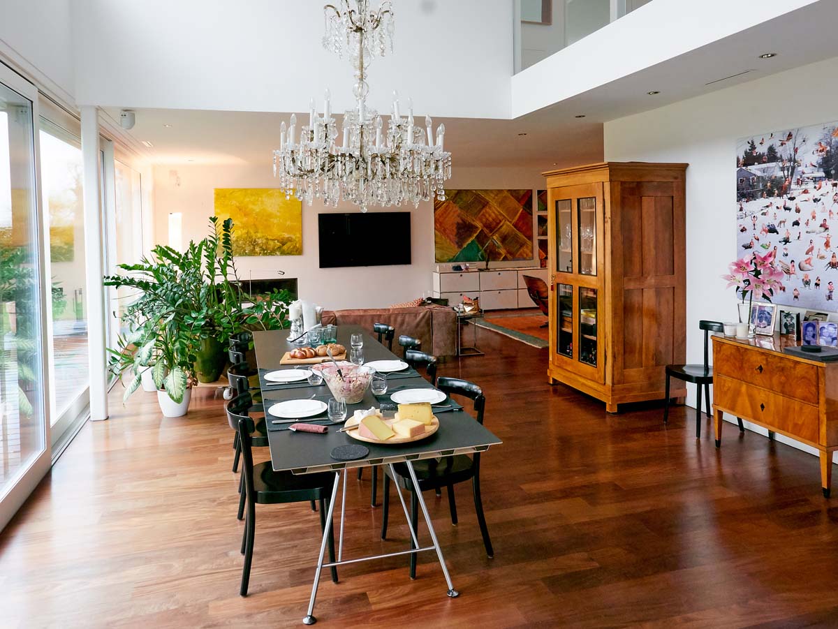 Man könnte das System extrem nennen, zumal die Basshörner aktiv sind und ihre Wattleistung von je einem Kilowatt noch hinzuaddieren. Allerdings bevorzugt Herr P. den Begriff Leidenschaft, denn: „HiFi bestimmt unseren Alltag“, erklärt er, während wir uns am Esstisch niederlassen, um eine Käseplatte nebst Wurstsalat in Augenschein zu nehmen, die seine Frau für uns zubereitet hat. Bei der Suche nach ihrem neuen Domizil in der Schweiz war es eine zwingende Voraussetzung, dass die Immobilie klanglich mit der Anlage harmoniert. Das ist den P.s gelungen, wie ich zu diesem Zeitpunkt bereits weiß.