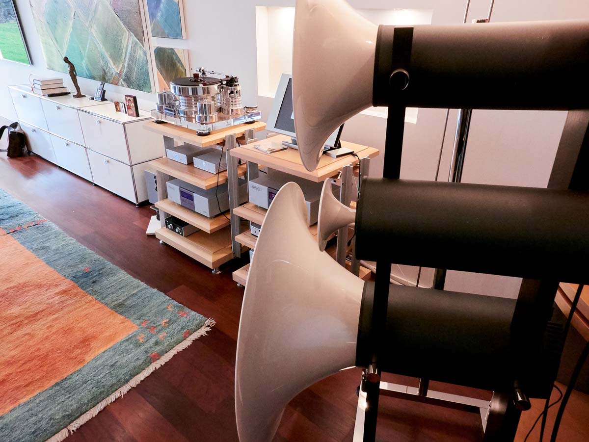Der HiFi-Enthusiast war schnell angefixt vom Klang seiner Trio und wollte unbedingt wissen, was da noch geht. Am Anfang lief das Hörnchen im einsamen Solobetrieb an einem Accuphase-Verstärker. Ein hervorragendes System, wie sich Herr P. erinnert, es hat jedoch nicht viel gemeinsam mit der Anlage, die mich nun aus ihren weit aufgezogenen Horntrichtern anblickt. Seine aktuelle Trio „Luxury Edition“ ist über den Umweg der Trio G2 bereits das dritte Modell in seinem Besitz. Hinzu gesellten sich über die Jahre zunächst vier Basshörner, die mittlerweile zum Sextett aufgestockt wurden – ein 2.6-System also. Vor dieser hoch aufgetürmten Basslandschaft (Gesamthöhe um 2,2 Meter) wirken die beiden 167 Zentimeter großen Lautsprecher fast ein wenig zierlich.