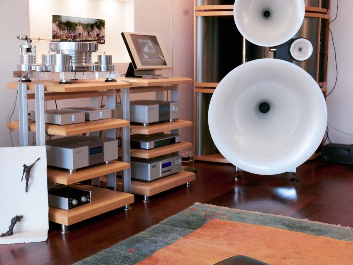 Den Kern der kapitalen Anlage bildet ein komplexes Hornsystem um Avantgarde Acoustics Spitzenmodell Trio. Zu der habe ihm eine schicksalhafte Mischung aus Zufall und am Schopf ergriffener Gelegenheit verholfen, wie mir der stolze Hausherr erklärt. Er lebte damals, vor über zwanzig Jahren, mit seiner Frau in der Umgebung von Frankfurt am Main. Gerade wollten sie eine Flugreise antreten, als es geschah: Darüber gestolpert sei er, mit seinen Augen daran hängen geblieben – eine ältere Version seiner jetzigen Box stand dort, auf dem Flughafen, in einem der zahllosen Schaukästen. Wer bereits von Deutschlands größtem Airport in die weite Welt abgehoben ist, dürfte die übermannshohen Glasboxen auf dem Weg zu den Gates kennen.