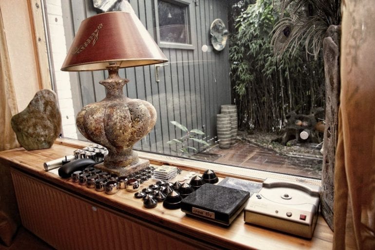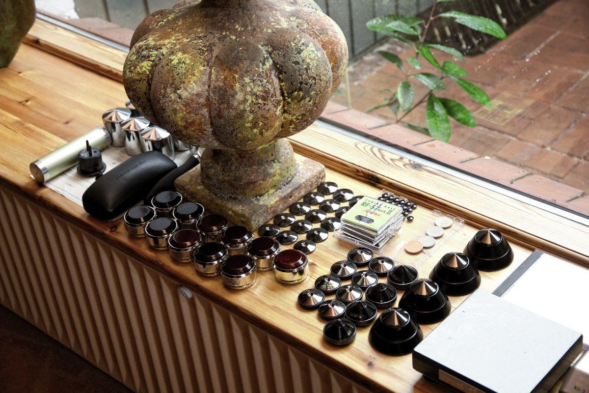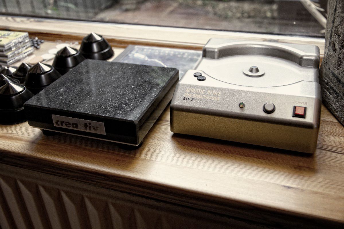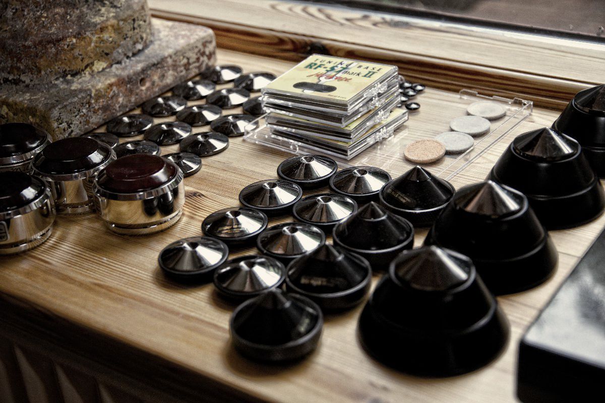 Von den vielen kleineren, dunklen Klebepunkten ist da noch gar nicht die Rede. Von denen sind hier noch viel mehr im Einsatz, beispielsweise am, auf und im Lautsprecher. Richtig gelesen: im Lautsprecher, etwa auf Chassiskörben und Frequenzweichen. Die Ktema etwa ist mit rund 250 (!) dieser Punkte ausgestattet … Gleichwohl ist Herr H. auch weiterhin „ready for tuning“, wie das rechte Fensterbrett beweist. Dort hat sich eine stattliche Sammlung an noch nicht (oder nicht mehr) benutzten Spezialfüßen und Spezialspikes und Klebepunkten und Entmagnetisierern und Aktivatoren etcetera. pp. zu einer Art „Tuningparadies“ gruppiert.