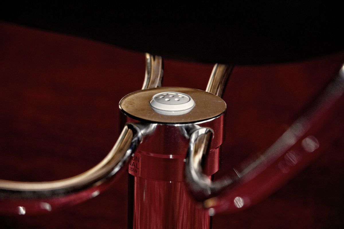 Obwohl das Wohnzimmer farblich in allen zarten bis kräftigen Rot- und Orange-Schattierungen schimmert, ist mein HiFi-Blick natürlich sofort auf die hochglanzschwarzen, elegant geschwungenen Lautsprecher gefallen. Die „Ktema“ von Franco Serblin, dem kürzlich verstorbenen Sonus-Faber-Gründer, will ich unbedingt einmal in Ruhe hören, werde sie zuvor aber ein bisschen näher in Augenschein nehmen … „Oh, bitte aufpassen“, sagt Herr H. freundlich, aber bestimmt – und deutet auf eine Besonderheit seines Fußbodens: In der Auslegware rund um den dicken roten Teppich sind vereinzelte weiße Pucks eingearbeitet, auf die ich besser nicht drauftreten sollte. Kenne ich diese Pucks nicht von irgendwoher? Na klar: Das sind kleine „resonanzabgestimmte Klebepunkte“ von Harmonix, die mich vor Jahren schon einmal ziemlich verblüfft haben. Weil man ihre Wirkung messtechnisch kaum erfassen kann, weil man sich angesichts des Preises auch schon mal an die Stirm tippt – und weil man trotzdem eine eindeutig positive Wirkung erlebt.