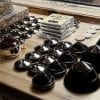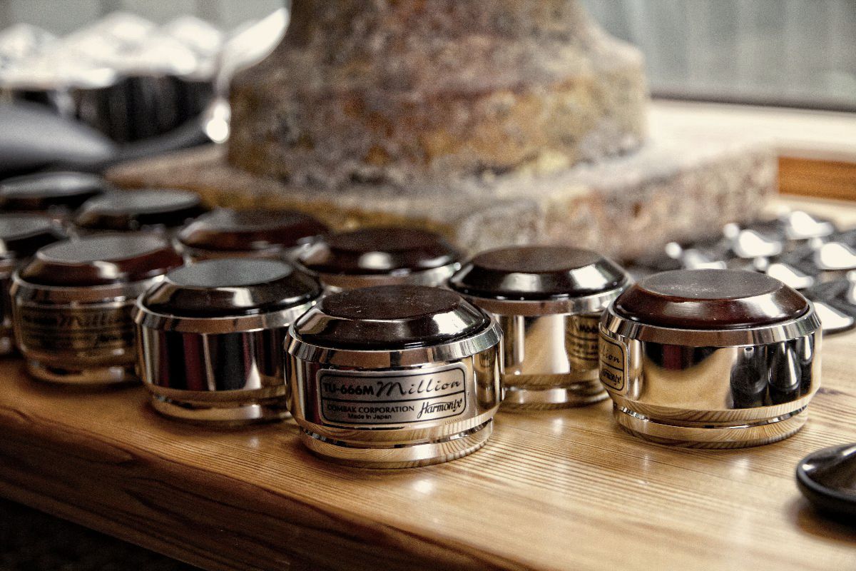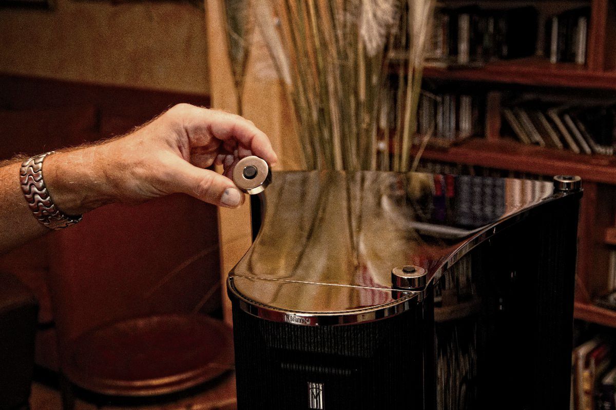 Doch selbst wenn ich mich lange und ganz genau umschaute, ist sich der Hausherr sicher, würde ich vermutlich nicht alle „tuning devices“ entdecken. Tatsächlich sind derart viele Punkte in diesem Raum und auch nebenan im Kaminzimmer strategisch verteilt, dass selbst Herr H. keine exakte Zahl (mehr) nennen kann. Nach einer wahren „Fachhändler- und Geräte-Odyssee“ sowie etlichen unbefriedigenden Versuchen, die Raumakustik zu optimieren, hat er vor ein paar Jahren Harmonix für sich als die klanglich herausragende Lösung erkannt. Seither stattet Herr H. seinen Hörraum konsequent mit den Produkten des japanischen Spezialisten Kazuo Kiuchi aus. Mittlerweile seien wohl „rund ein Dutzend“ der weißen Pucks im Einsatz. Zwölf Sets, wohlgemerkt. Ein Set besteht aus achtzehn Pucks. Und das sind nur die weißen, größeren Klebepunkte namens RFA-7800.