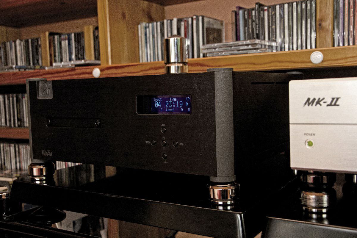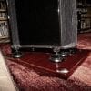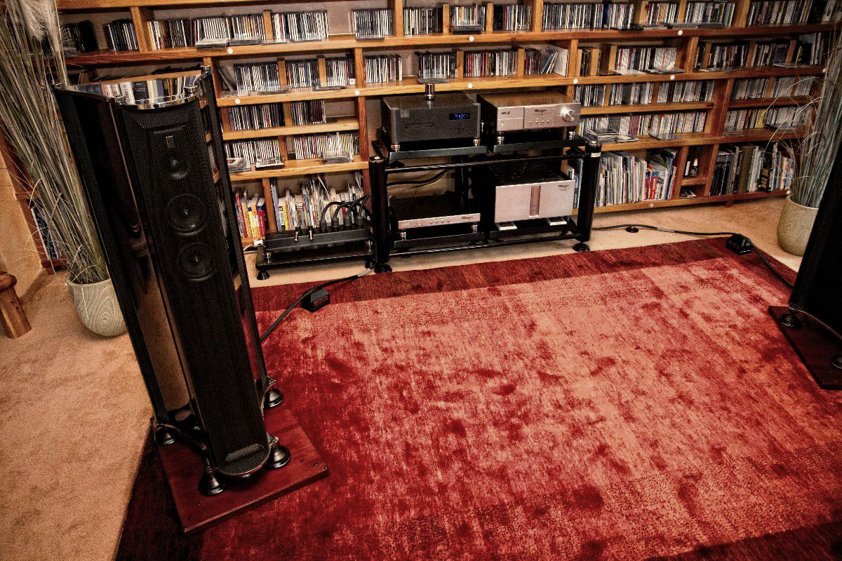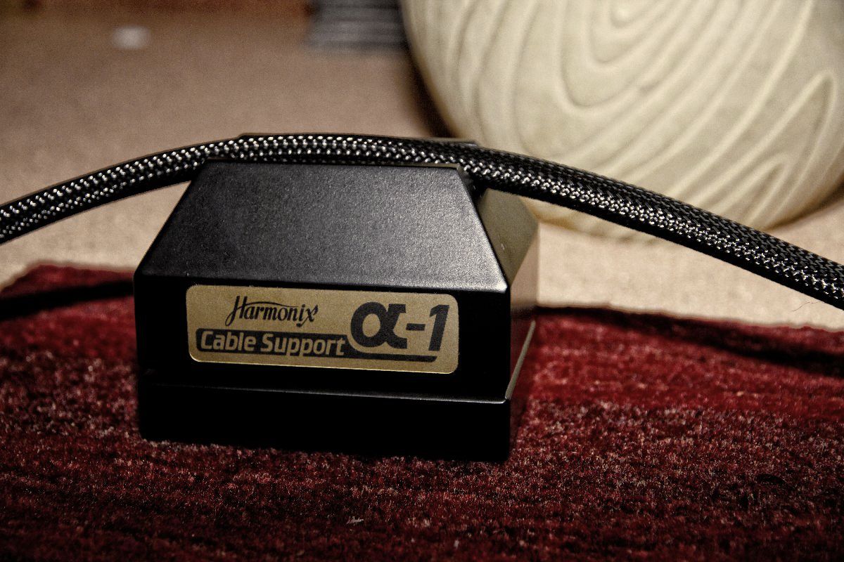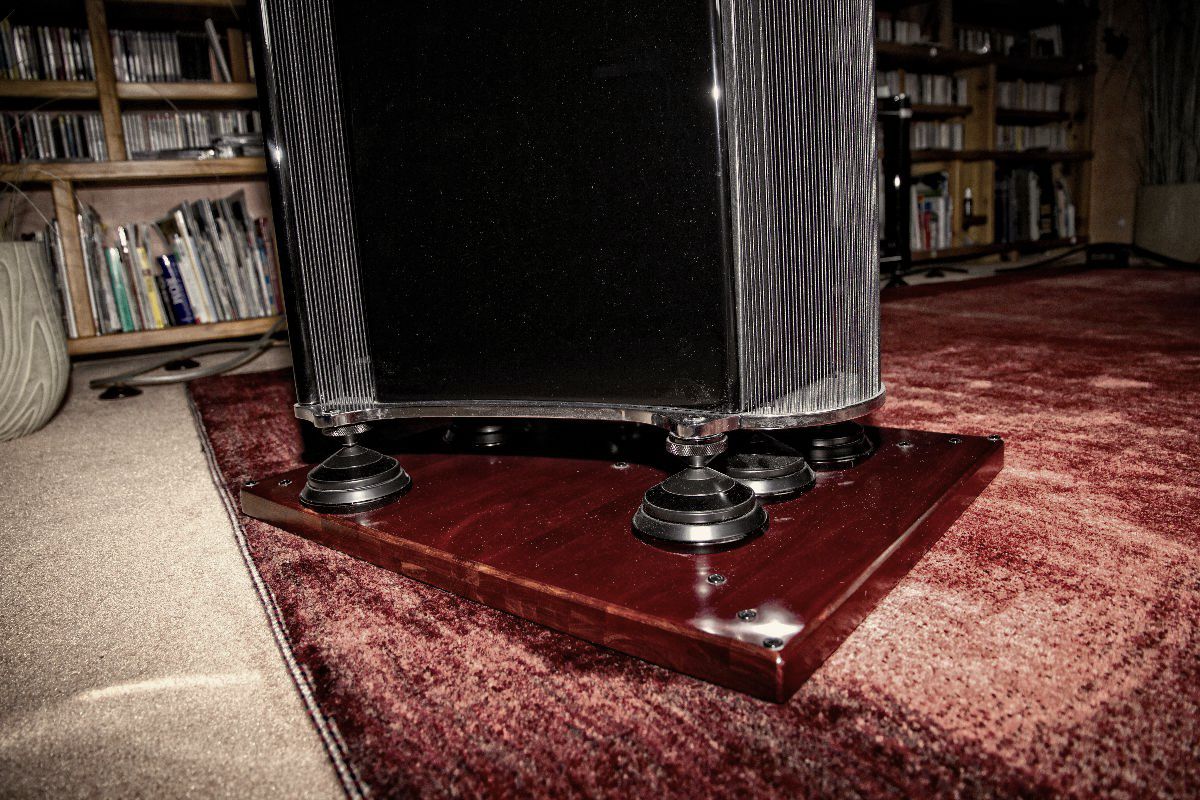 Für seine Elektronik scheint Herr H. bereits perfekt funktionierende „Support“-Lösungen gefunden zu haben. Sein Wadia-CD-Player 781i, aber auch die drei Reimyo-Komponenten (999x ltd., CAT 777 Mk II, KAP 777) stehen selbstredend nicht einfach direkt auf dem bleischweren Copulare-Rack, sondern werden jeweils von einem respektablen Mix verschiedener Harmonix-Produkte „bedient“: Füße, Spikes, Basen – das ganze Programm. Konsequenterweise sind auch die Lautsprecherkabel, die wie alle Verbinder von Harmonix stammen, speziell entkoppelt …