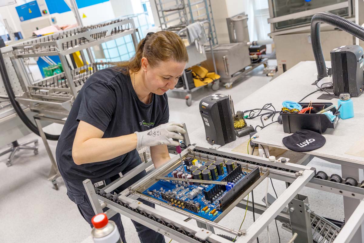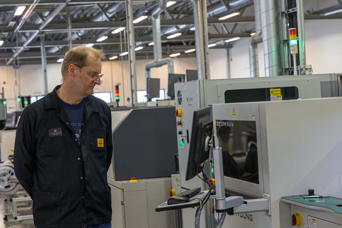 Beim anschließenden Gang durch die Westcontrol-Fertigung staunen wir über die Effizienz, mit der das Unternehmen an vielen unterschiedlichen Produkten gleichzeitig arbeitet. Den Anfang macht ein riesiges Teilelager, in dem wir unzählige Bauteile und kleine Rollen mit „Komponentenbändern“ entdecken. Gerade laufen Hauptplatinen des Vollverstärkermodells ECI 6 DX MKII durch eine der minutiös abgestimmten Bestückungsstraßen. Mit winzigen Mechaniken, Elektromagneten und Lasern werden Bauteile auf die Platinen gesetzt und verbacken, die ich mit bloßem Auge nicht erkennen kann. Erst danach sind „grobe“ Strukturen an der Reihe. Wir werden Zeugen, wie ein Team von Mitarbeiterinnen Elkos und Spulen auf den ECI-Platinen positioniert, ehe diese durch eine Lötmaschine fahren. Am Ende ist die Qualitätskontrolle an der Reihe. In einem Parcours aus optischer Kontrolle und messtechnischem Check werden die fertigen Platinen auf Hertz und Nieren geprüft. Weil Westcontrol es ganz genau nimmt, legte sich der Konzern ein riesiges Röntgengerät mit geradezu aberwitziger Vergrößerungsfunktion zu. Fertigungsleiter Torfinn Fiskå zeigt uns feinste Strukturen auf einem der Monitore und erklärt, dass die Abbildung Leiterbahnen eines Prozessors im D/A-Wandler des ECI 6 DX zeige.