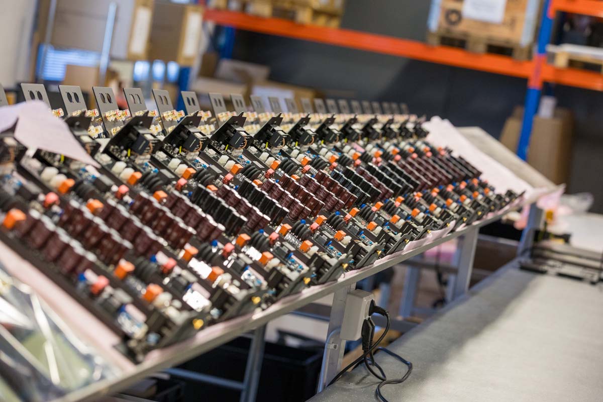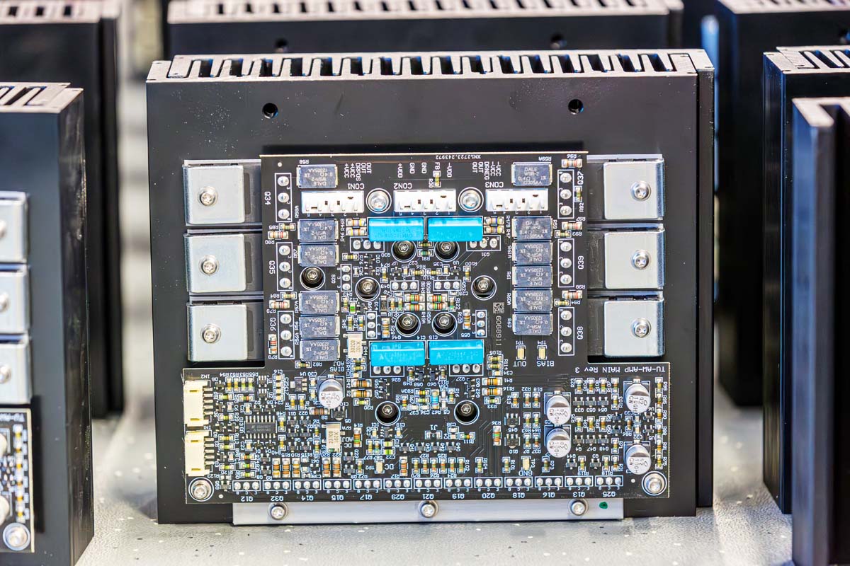Zuletzt besuchten wir eine kleine Werkshalle, in der dutzende Verstärkermodule auf ihre Montage warten; es handelt sich hier um die AW-300-Endstufen. Die Module müssen mit ihren langen Steckkontakten im Grunde genommen nur noch in die vorgefertigten Gehäuse gesteckt werden, die bereits samt Netzteilen und Trafos bereitstehen. Vielleicht ist darunter ja auch ein Pärchen, das wir unbedingt mal in unserem Hörraum ausprobieren sollten …