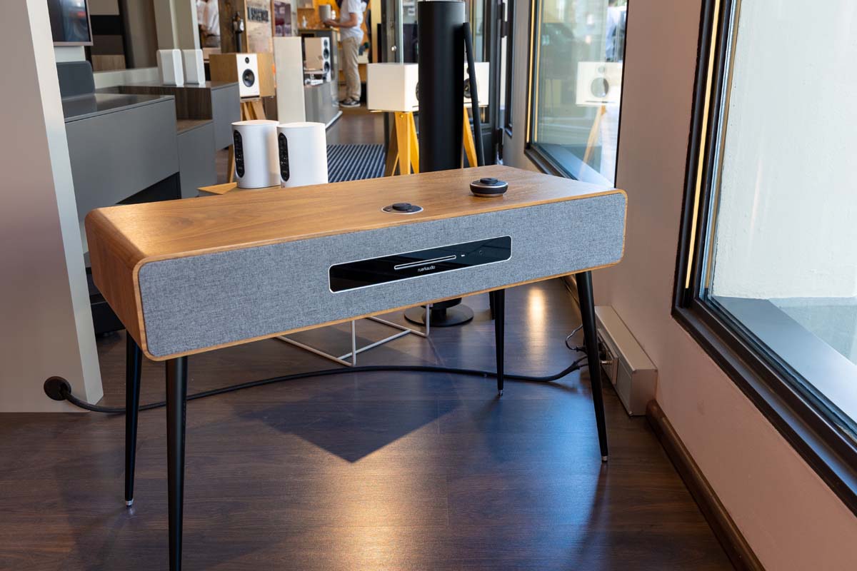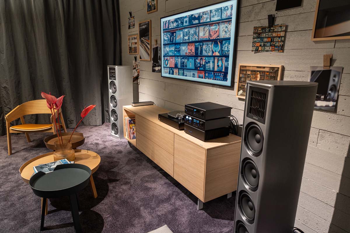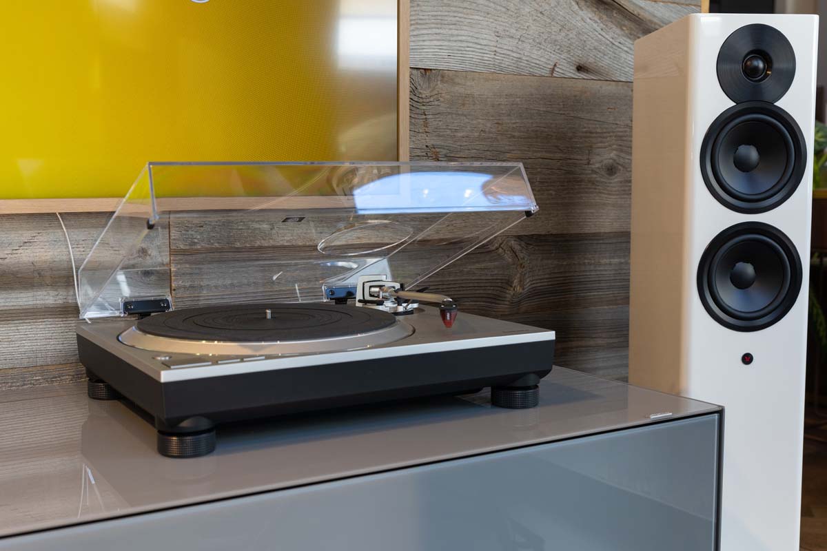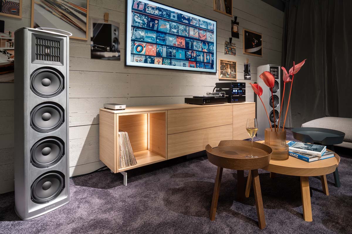 Nur Augenblicke später befinden wir uns mitten in einer Wolke aus Klängen. Gewohnt souverän präsentiert Piegas Schwergewicht eine geradezu atemberaubende Bühne mit samtigen Mitten und Höhen. Das hervorragende Bändchen der Schweizer dürfte entscheidenden Anteil an der Natürlichkeit des Lautsprechers haben. Der Bass ist autoritär, wirkt in der bedämpften Akustik des Raums knochentrocken und kontrolliert. Wir hören Musik via Qobuz-Stream, sollten Kunden es wünschen, sind aber auch der CD-Spieler des MP 200 und der nebenstehende Plattenspieler startklar. Auf dem gemütlichen Sofa dämmert uns, was die beiden Betreiber mit dem „Wohnzimmer“ meinten. In der ruhigen und herrlich entspannten Atmosphäre des Raums möchte man gern den einen oder anderen Musik- oder Filmabend verbringen.