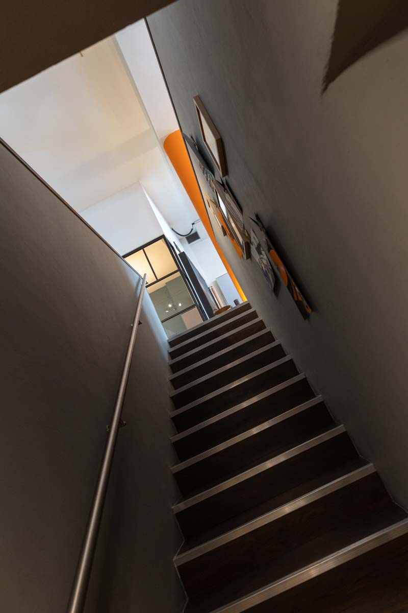 Aber kehren wir zurück zum eingangs erwähnten Studiokonzept. Nach der Begrüßung und einem Plausch über die erfrischend neuen Ansätze des HiFi Concept LIVING bitten uns die beiden hinunter in ihre „HighEnd-Lounge“ beziehungsweise in ihr „Wohnzimmer“, wie sie es schmunzelnd nennen. Der Raum im Untergeschoss wurde erst wenige Tage vor unserem Besuch fertiggestellt, wie wir erfahren. Man erreicht ihn über eine Treppe, die mitten im Laden liegt, die uns interessanterweise aber erst auffällt, als Christian und Alexander Heisig darauf hinweisen. Der Effekt könnte kaum beeindruckender sein: Nach einigen Stufen macht der mit zahllosen Bildern dekorierte Abstieg einen Bogen nach links, und unvermittelt steht man im gemütlich ausgeleuchteten Wohnraum. Da man beim ersten Blick in das Hörzimmer noch einige Stufen oberhalb des Raums auf einem Absatz steht, gewinnt man sofort einen Überblick. Und der illustriert, dass sich selbst Boxen-Großkaliber harmonisch ins Ambiente integrieren lassen. Die Anlage beherrscht das Zimmer, ohne es zu erdrücken.