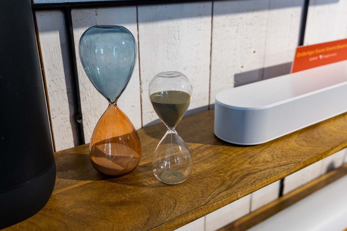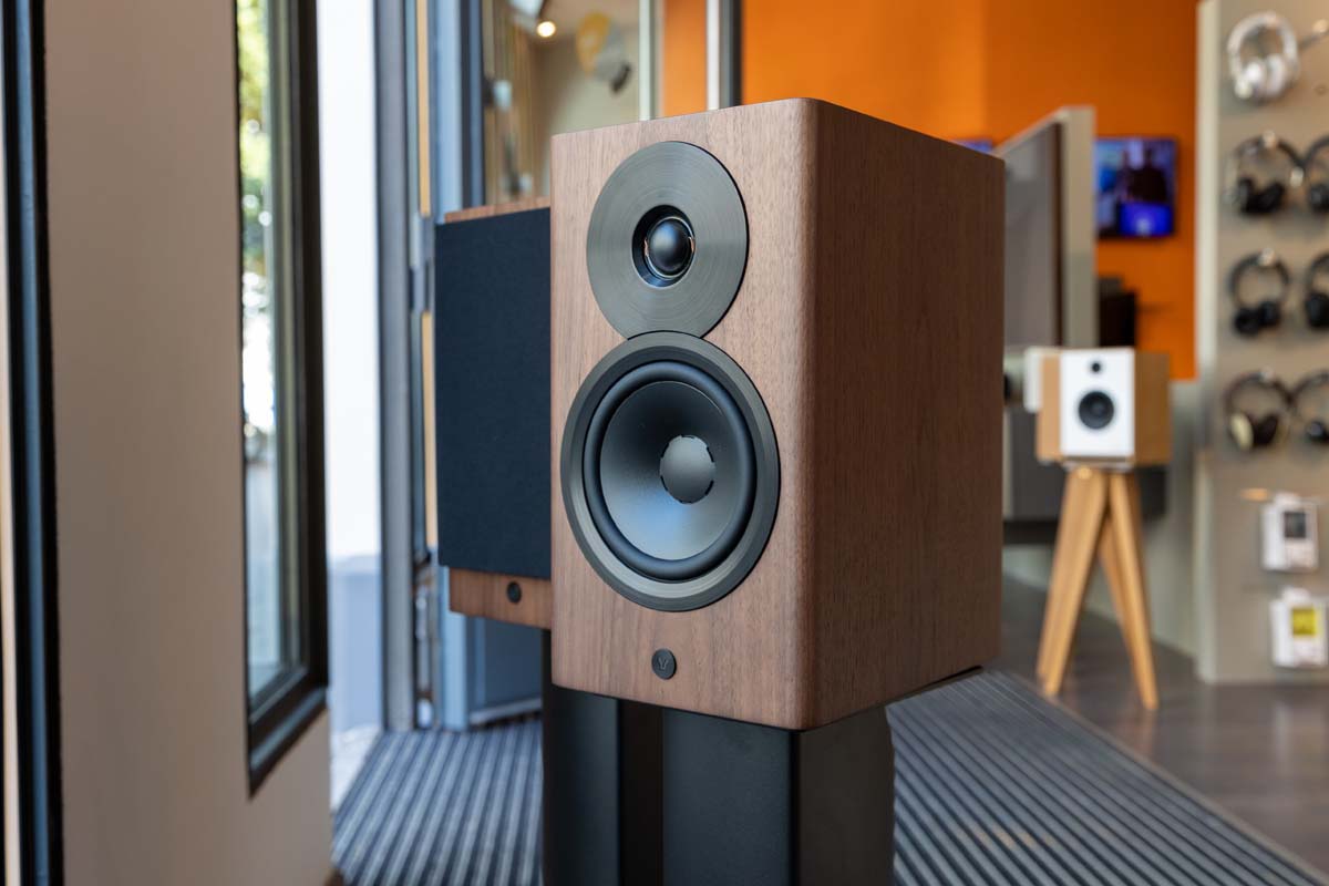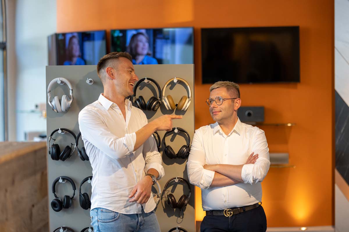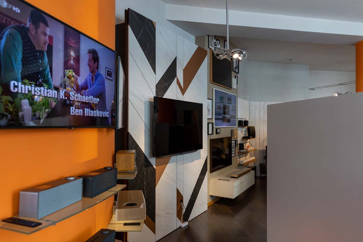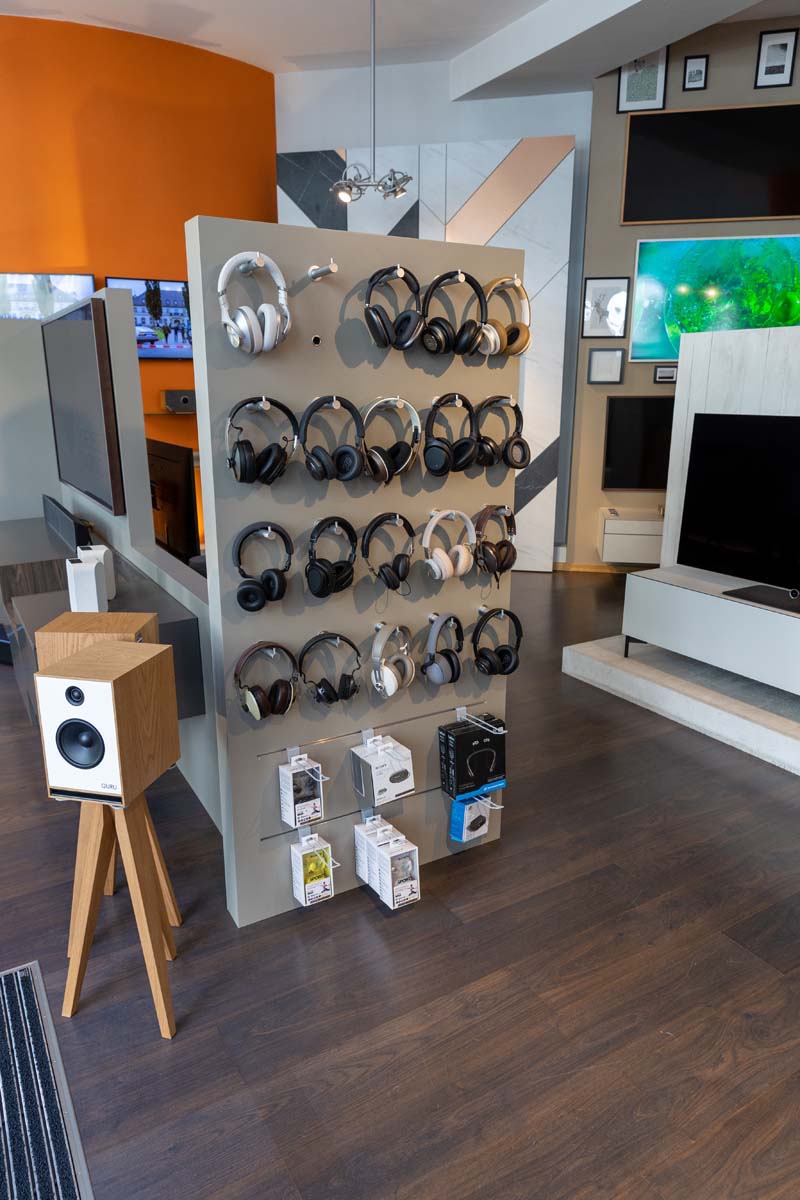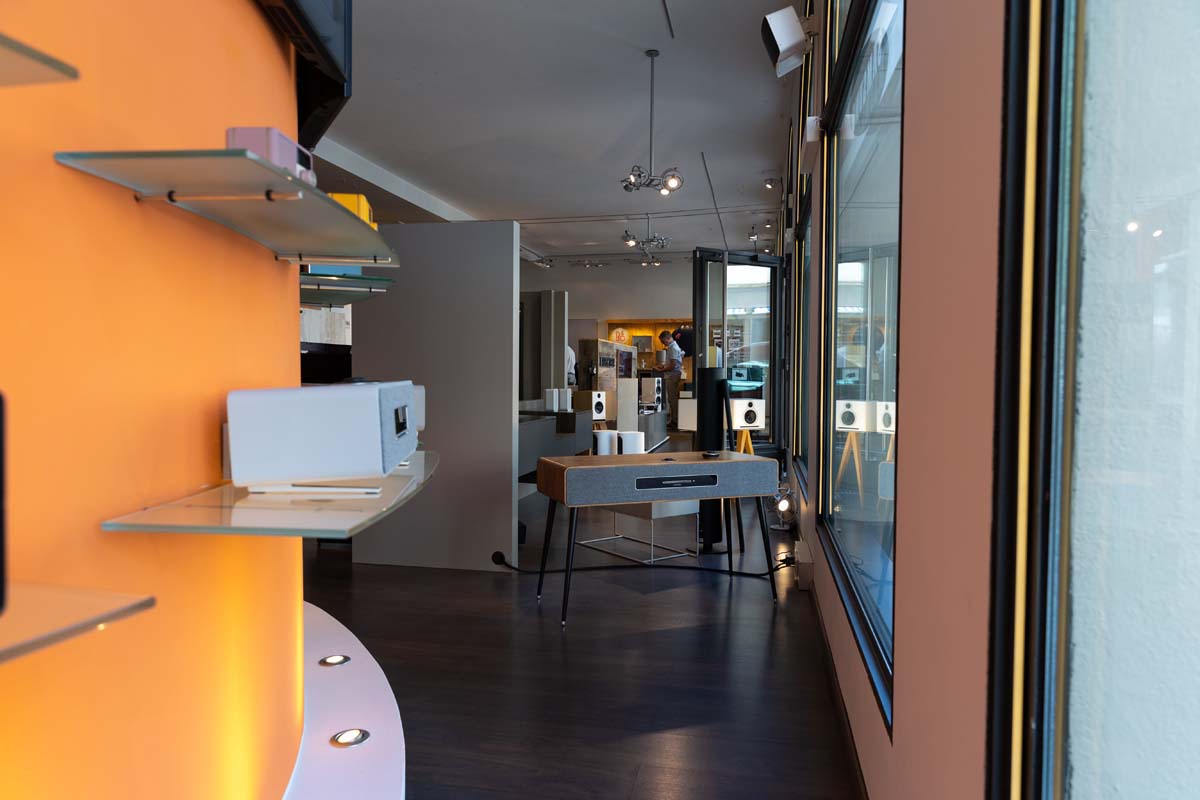 Auf den ersten Blick wirkt das Geschäft wie ein klassischer – wenn auch modern ausgerichteter – HiFi-Handel. Die Betreiber Christian und Alexander Heisig haben sich dem Konzept des „jungen Hörens“ verschrieben, wie man es vor einigen Jahren nannte: Ihre Kunden haben keine Berührungsängste mit Smart Devices oder Streaming-Musik, und sie legen mindestens so viel Wert auf Wohnlichkeit wie auf guten Klang. Neben Aktivlautsprechern von Dynaudio, Bluesound oder Sonos entdecken wir stylische All-in-one-Systeme und Soundbars von Marken wie B&O oder Ruark sowie eine ganze Wand voller Schnurlos-Kopfhörer. In Form einiger Plattenspieler (Clearaudio, T+A und Technics) ist freilich auch ein Mindestmaß an klassischem HiFi vertreten – genau wie es heute sein muss. An einer auffällig orange gestrichenen Wand, die den gesamten Laden in warmes Licht taucht, hängt eine Auswahl großkalibriger Flachbildfernseher. Da TV-Bildschirme zum modernen Home Entertainment gehören, nicht selten sogar die Medienzentrale bilden, haben die Heisigs Modelle von Samsung und Loewe in ihr Sortiment aufgenommen.