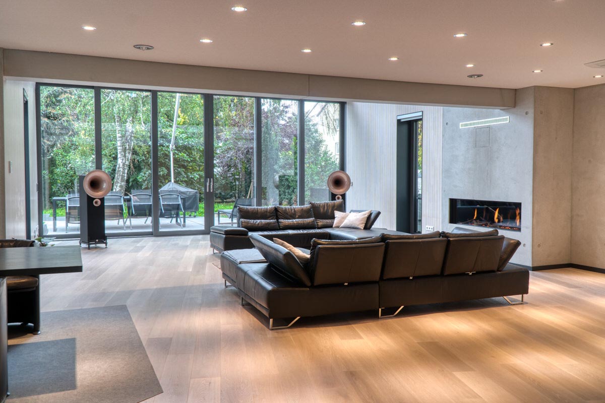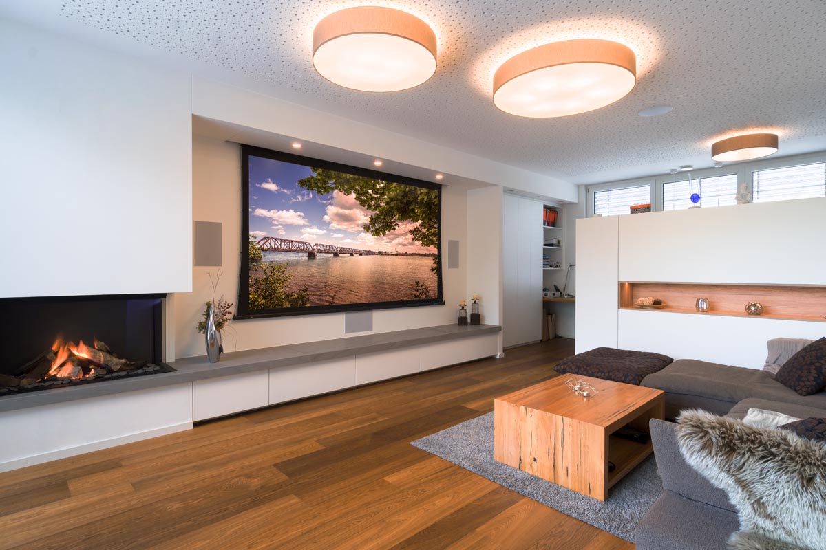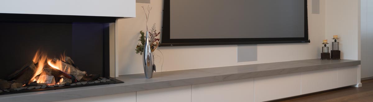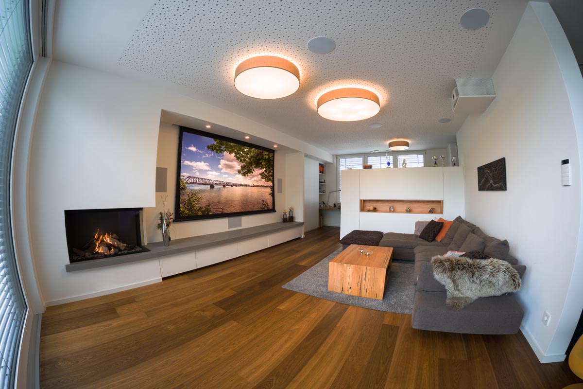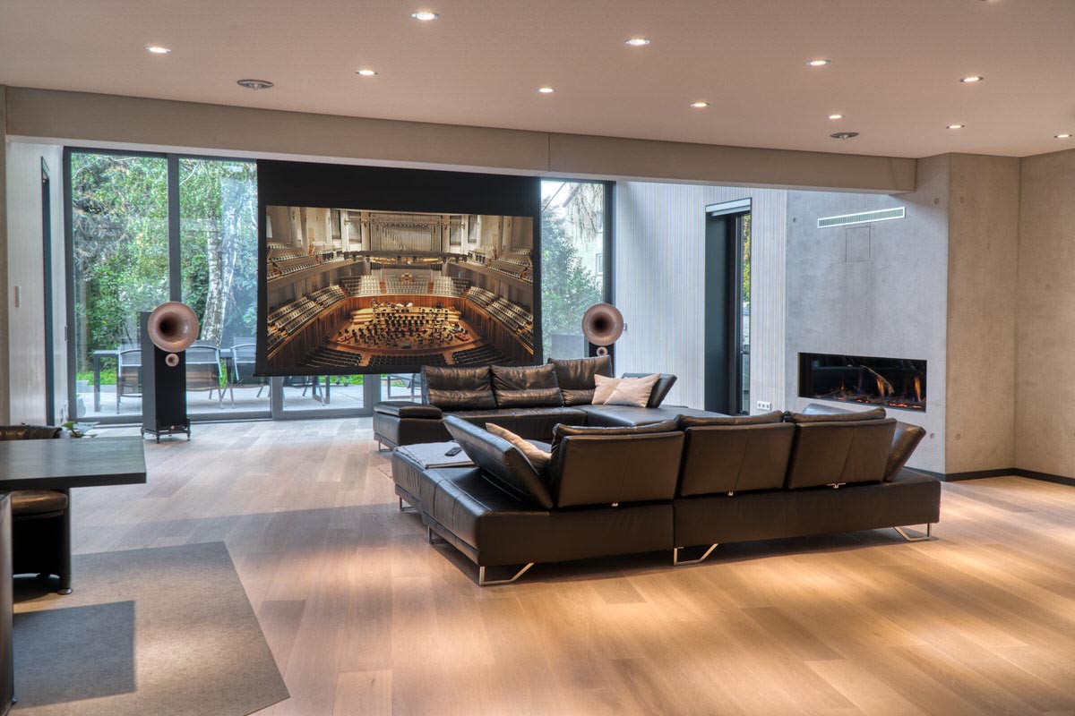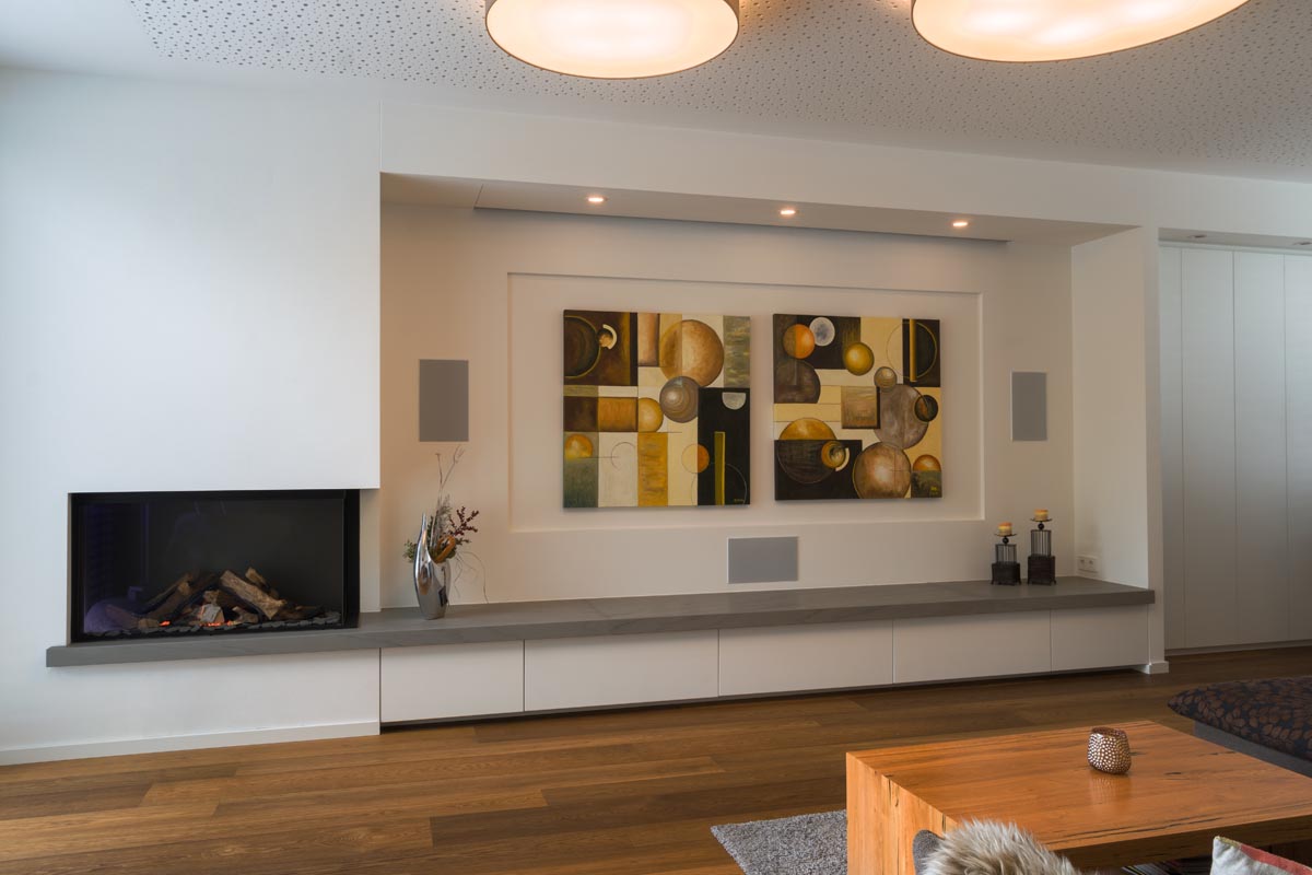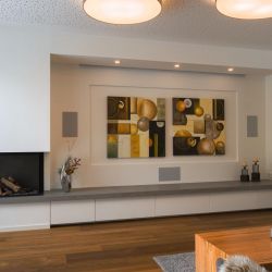 In einem dritten Objekt ging es um die dezente Integration eines komplexen AV-Systems in ein langgestrecktes Wandboard, in dem auch der Kamin untergebracht war. Eine wahrhaft tückische Herausforderung, an dieser „Firewall“ die versteckte Elektronik nebst Lautsprecher so zu verbauen und zu „belüften“, dass die Wärme des Kamins sie nicht beeinträchtigten oder gar beschädigen kann! In anderen Planungen wurden derweil mehr oder weniger unsichtbare HiFi-Systeme um Lautsprecher von Avantgarde Acoustic, Burmester oder Piega herum konstruiert.
