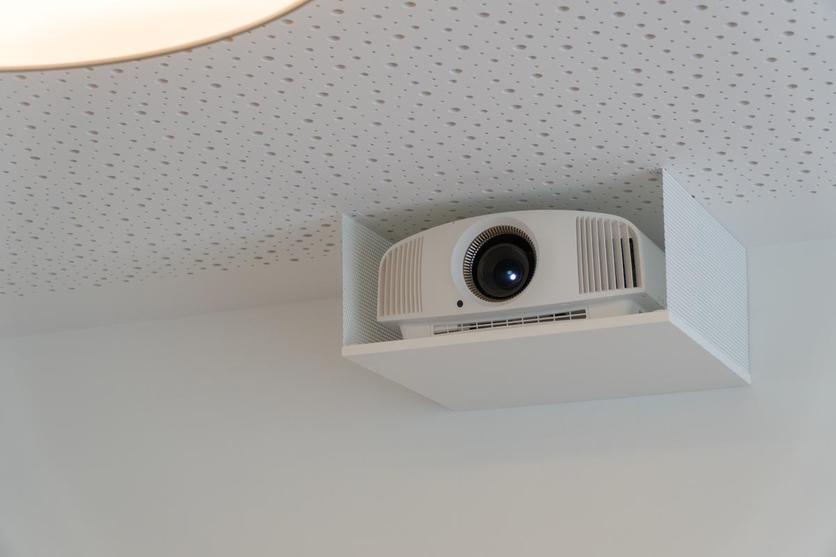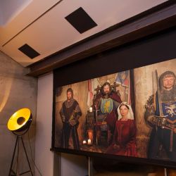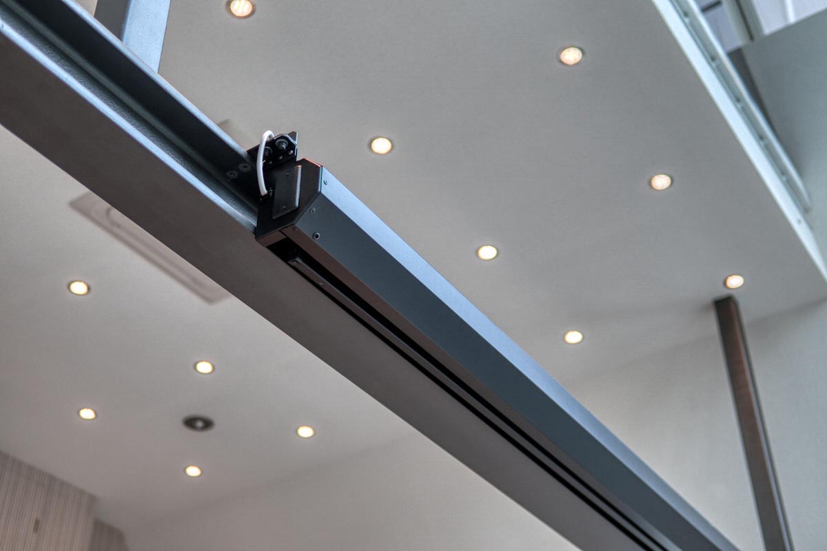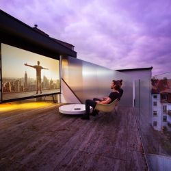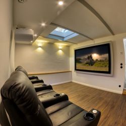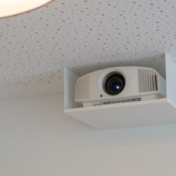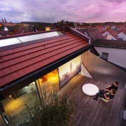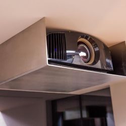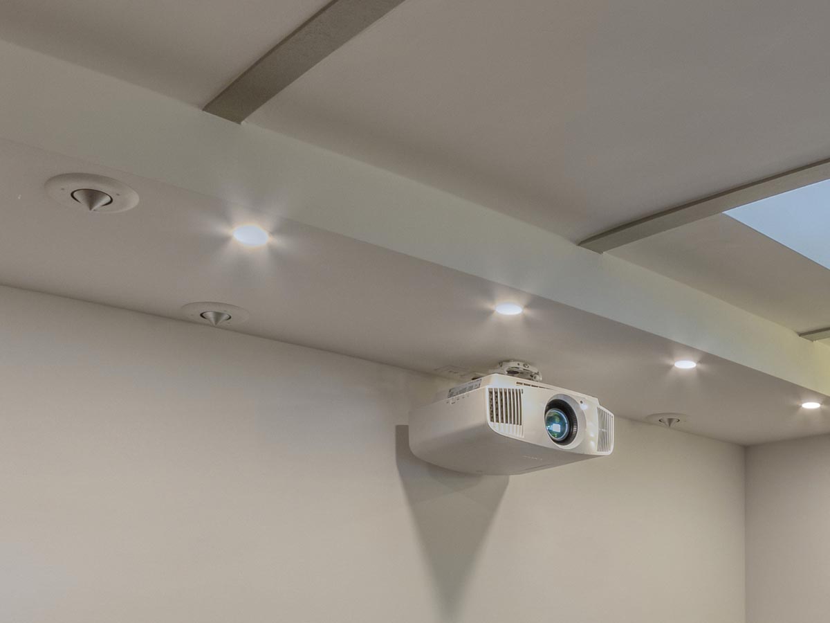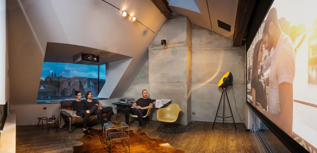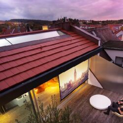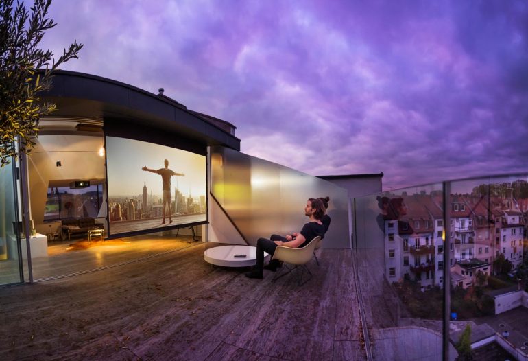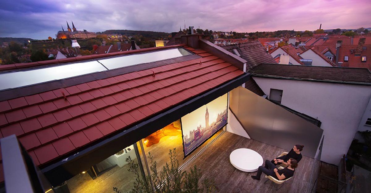 Wenig später sitzen wir in seinem Büro und betrachten auf einem großen Fernseher farbenprächtige Bilder seiner jüngsten Installationen, anhand derer er uns die Tiefe und Vielfältigkeit seiner Arbeit illustriert. So konnte das HiFi Forum kürzlich ein exklusives Dachgeschoss in der Bamberger Innenstadt mitgestalten. Die Fotografien dokumentieren einzelne Bauabschnitte und offenbaren, dass Neuendörfer von Anfang an in die Kernsanierung der kompakten, aber sensationell gelegenen Wohnung involviert war. Die Eigentümer wünschten sich eine einfach zu steuernde Möglichkeit, um ihr neues Heimkino auch auf der großzügigen Dachterrasse nutzen zu können. Für lauschige Sommerabende entwarfen die Baiersdorfer eine Outdoor-Projektionsfläche nebst versteckten Lautsprechern, die Bild und Ton der Haupanlage im Wohnzimmer nach draußen übertragen. Da das komplexe System die Wohnlichkeit des kleinen Lofts nicht beeinträchtigen sollte, griffen die Planer zu einer einfahrbaren Leinwand, die nach abgeschlossenem Filmabend im großen Fensterrahmen verschwindet. Da es für derart ausgefallene Ideen keine Lösungen von der Stange gibt, musste sich das HiFi Forum nicht nur um die grundsätzliche Planung kümmern, sondern auch Details wie die Allwettertauglichkeit der Außeninstallationen berücksichtigen.