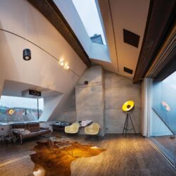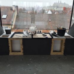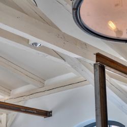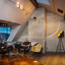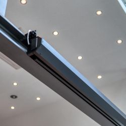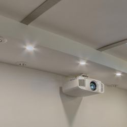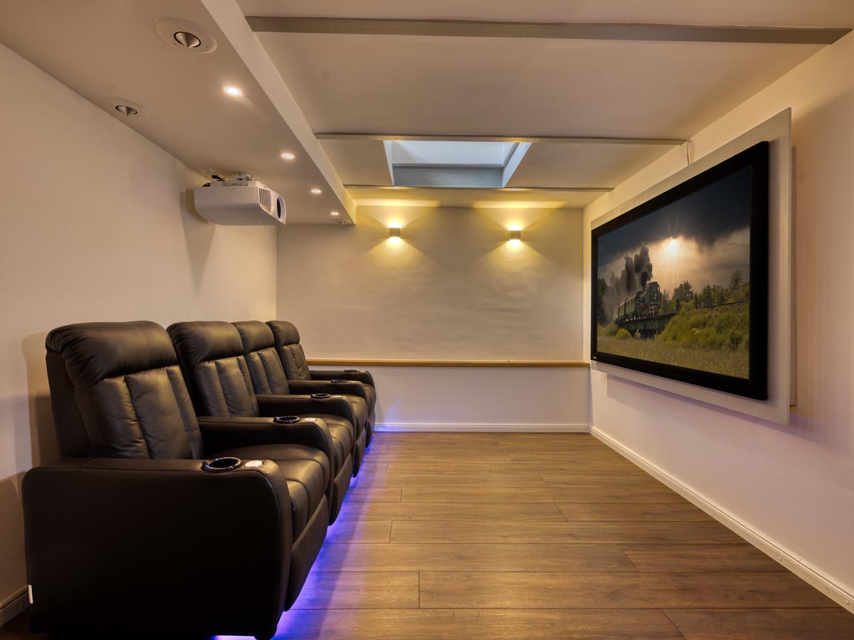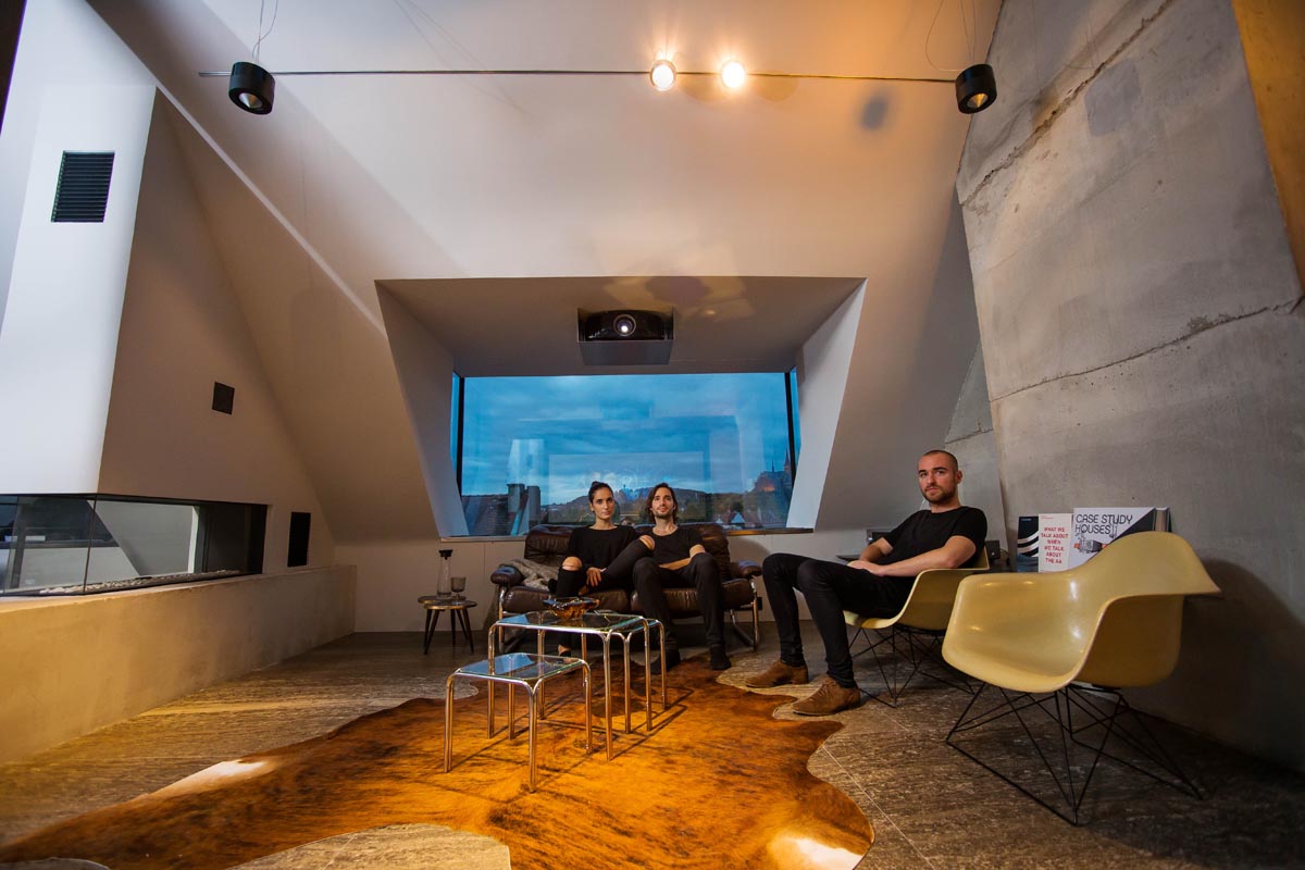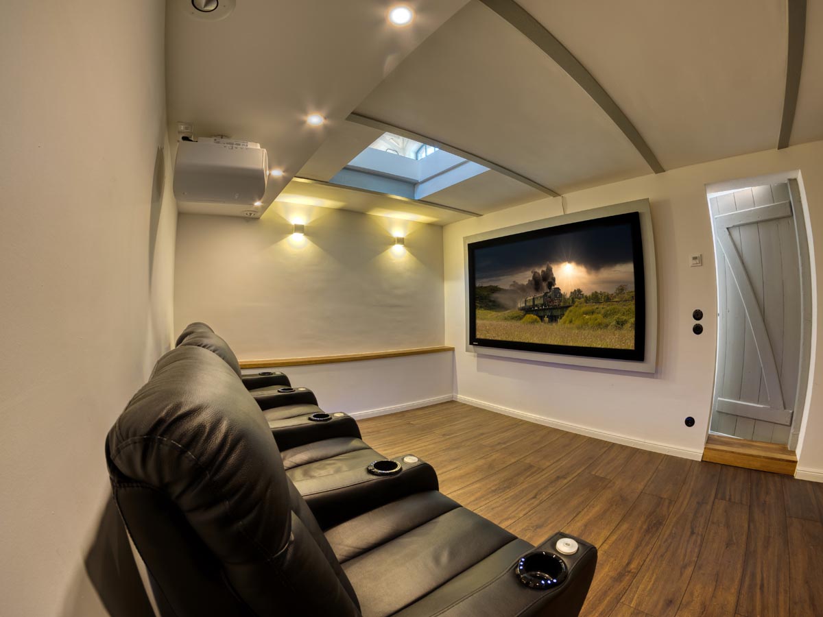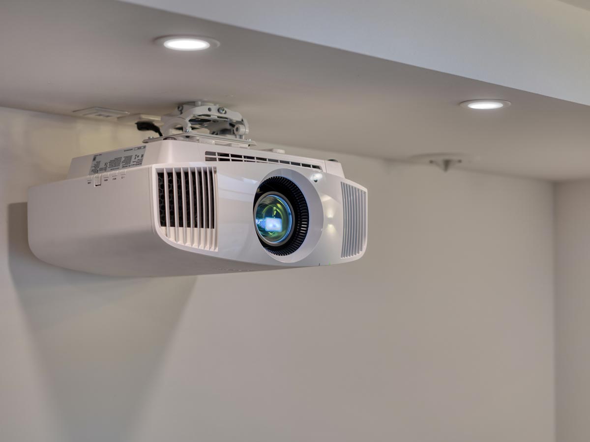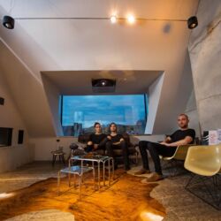 Wenig später sitzen wir in seinem Büro und betrachten auf einem großen Fernseher farbenprächtige Bilder seiner jüngsten Installationen, anhand derer er uns die Tiefe und Vielfältigkeit seiner Arbeit illustriert. So konnte das HiFi Forum kürzlich ein exklusives Dachgeschoss in der Bamberger Innenstadt mitgestalten. Die Fotografien dokumentieren einzelne Bauabschnitte und offenbaren, dass Neuendörfer von Anfang an in die Kernsanierung der kompakten, aber sensationell gelegenen Wohnung involviert war. Die Eigentümer wünschten sich eine einfach zu steuernde Möglichkeit, um ihr neues Heimkino auch auf der großzügigen Dachterrasse nutzen zu können. Für lauschige Sommerabende entwarfen die Baiersdorfer eine Outdoor-Projektionsfläche nebst versteckten Lautsprechern, die Bild und Ton der Haupanlage im Wohnzimmer nach draußen übertragen. Da das komplexe System die Wohnlichkeit des kleinen Lofts nicht beeinträchtigen sollte, griffen die Planer zu einer einfahrbaren Leinwand, die nach abgeschlossenem Filmabend im großen Fensterrahmen verschwindet. Da es für derart ausgefallene Ideen keine Lösungen von der Stange gibt, musste sich das HiFi Forum nicht nur um die grundsätzliche Planung kümmern, sondern auch Details wie die Allwettertauglichkeit der Außeninstallationen berücksichtigen.