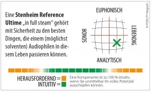Am nächsten Vormittag führen wir in verkleinerter Runde das Gipfeltreffen der besonderen Art fort. „Musik soll über Stenheim-Lautsprecher live und natürlich“ klingen, resümiert Jean-Pascal Panchard kurz die Erlebnisse vom Abend zuvor, „mit einer realistischen, praktisch unbeschränkten Dynamik, um die Verhältnisse von Livemusik mühelos widerspiegeln zu können.“ Exakt diese Art der Performance kann ich nun auch am zweiten Tag über die Reference Ultime eindrucksvoll erleben. Mittelprächtige Aufnahmen wirken keineswegs schlapp, sondern erblühen mit maximal möglicher Pracht, sind trotz mühelos detektierbarer Schwächen des Tonträgers wirklich genießbar, ohne sich dabei euphonisch anzubiedern. Herausragende Produktionen erfassen den Zuhörer ganzkörperlich und mit ansatzloser, gnadenloser, kompressionsloser Dynamik. Ein Fest für Birne, Bauch und Bottom, wenn Sie mir diese saloppe Dreifaltigkeit bitte kurz erlauben wollen.