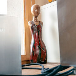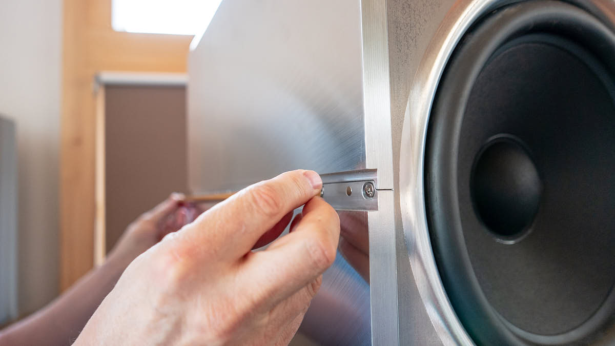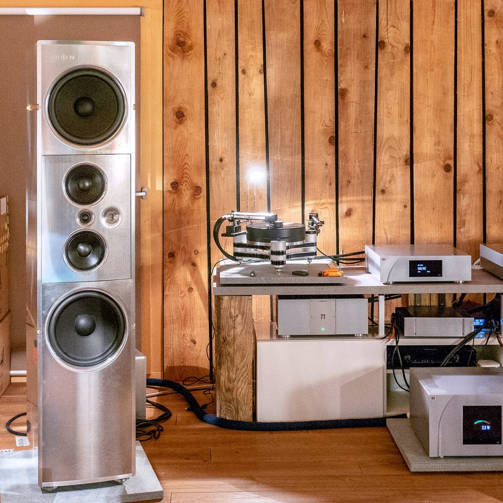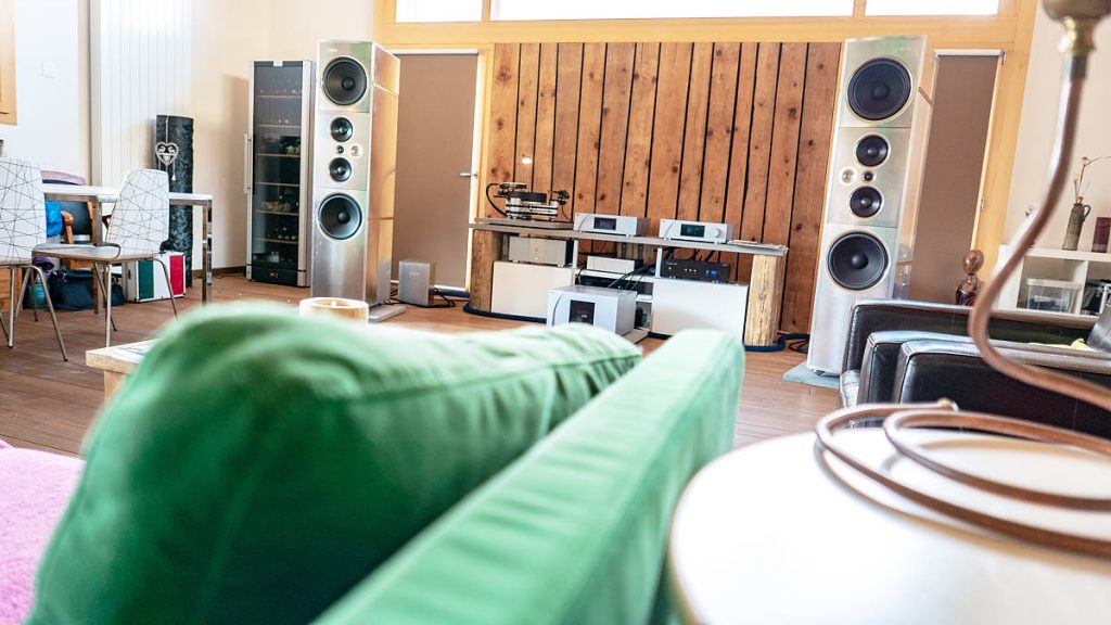 Schon kurz nach meiner Ankunft bei Jean-Pascal und seiner charmanten Frau Pascale haben zwei große Aluminiumsäulen mit Stenheim-Logo meine Aufmerksamkeit gewonnen – ohne dass überhaupt Musik läuft. Während ich fasziniert um die Skulpturen herumschleiche, treffen zwei weitere Musikliebhaber ein, die unsere heutige Runde komplettieren: Melanie Groetsch vom Clearaudio-Serviceteam sowie Yves Coppey, der Architekt dieser audiophilen Ex-Scheune. JPP hat beide als zusätzliche Experten eingeladen, falls es später noch Details zu klären gibt. Damit hat sich ganz schön viel Musik- und Technikbegeisterung in diesen Räumlichkeiten versammelt. Und meinetwegen kann es nun auch losgehen mit der Performance.