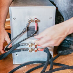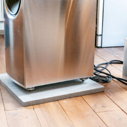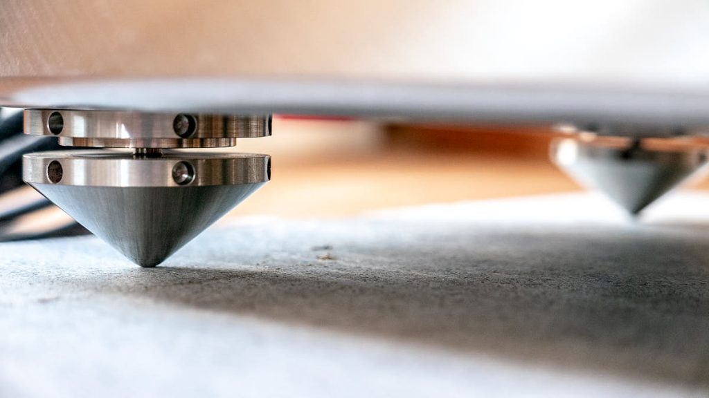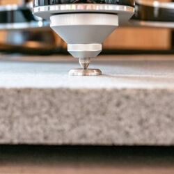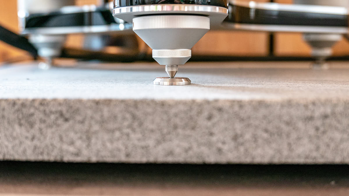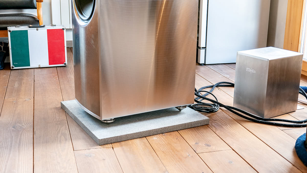 Übrigens verzichtet Jean-Pascal bei sich im Wohnzimmer darauf, die motorisch betriebenen Mittelhochton-Module der Ultime auf den Hörplatz einzuwinkeln. Die korrekte Einwinkelung hat er bereits bei der Aufstellung erledigt; die 240-Kilo-Lautsprecher ruhen mit ihren „gerundeten Spikes“ auf hochbelastbaren Steinbasen im exakt richtigen Winkel zum Sweetspot. Der Klangeindruck ist entsprechend: groß und ausgedehnt, präzise fokussierend und in allen Dimensionen ohne hörbare Limits. Sehr praktisch für einen Hörtest, wenn alles schon so perfekt vorbereitet ist.