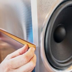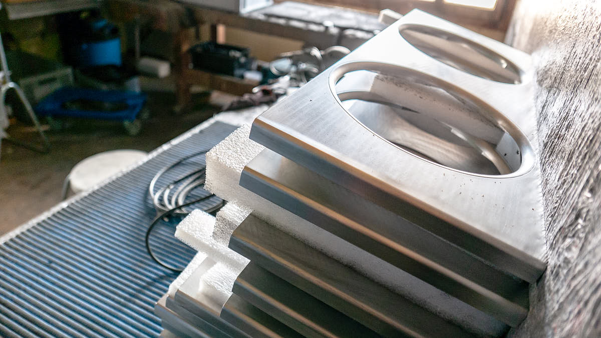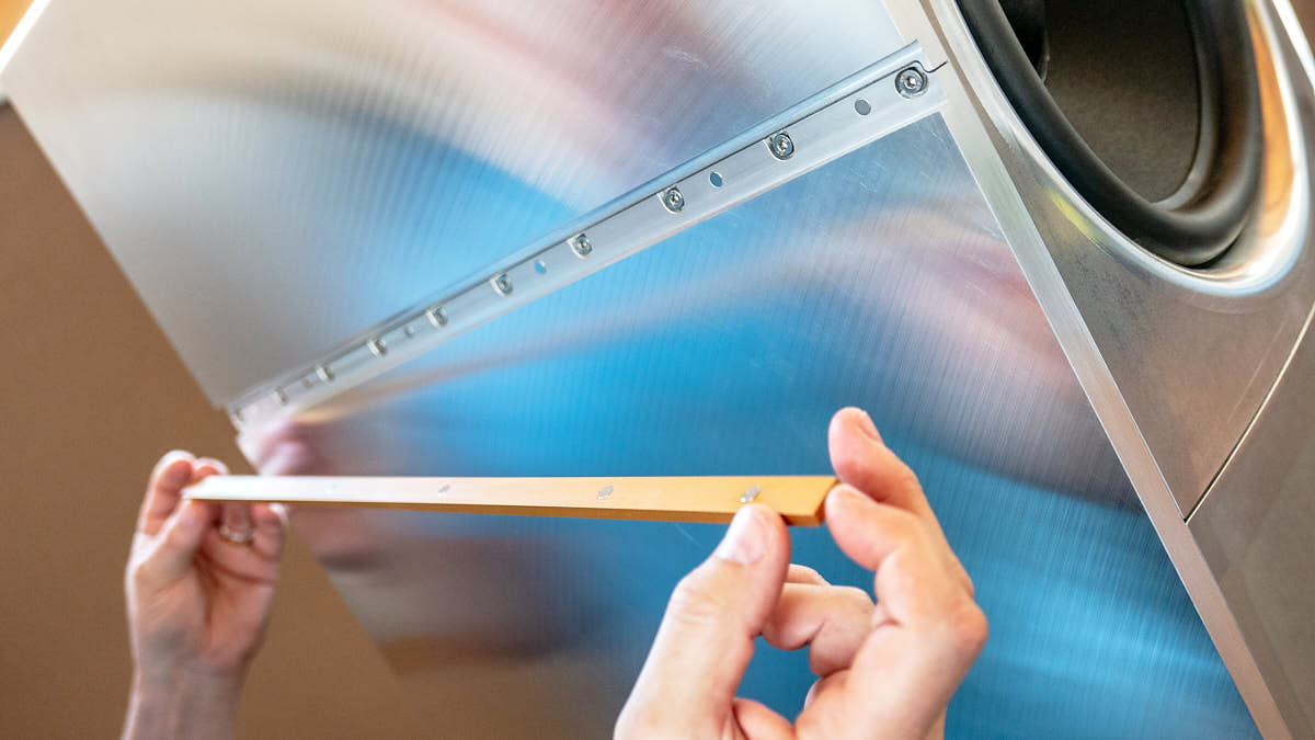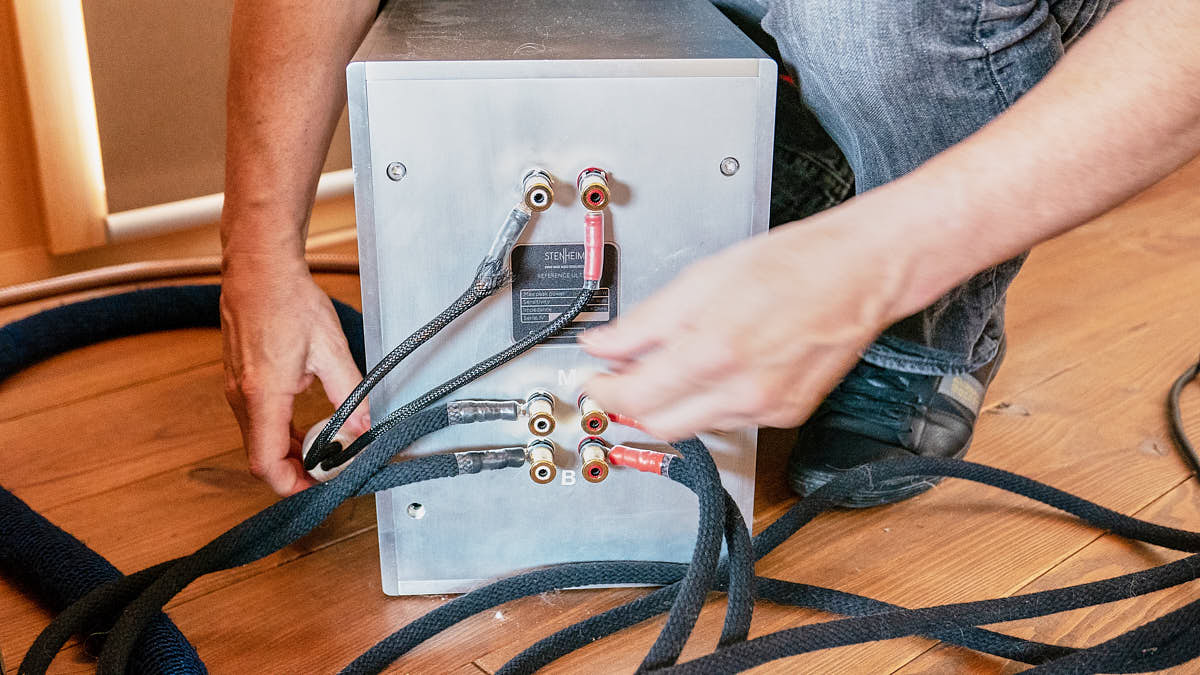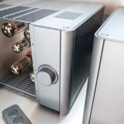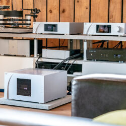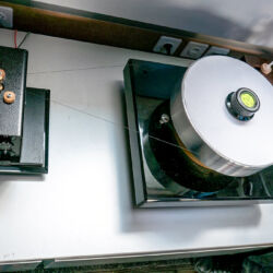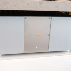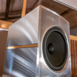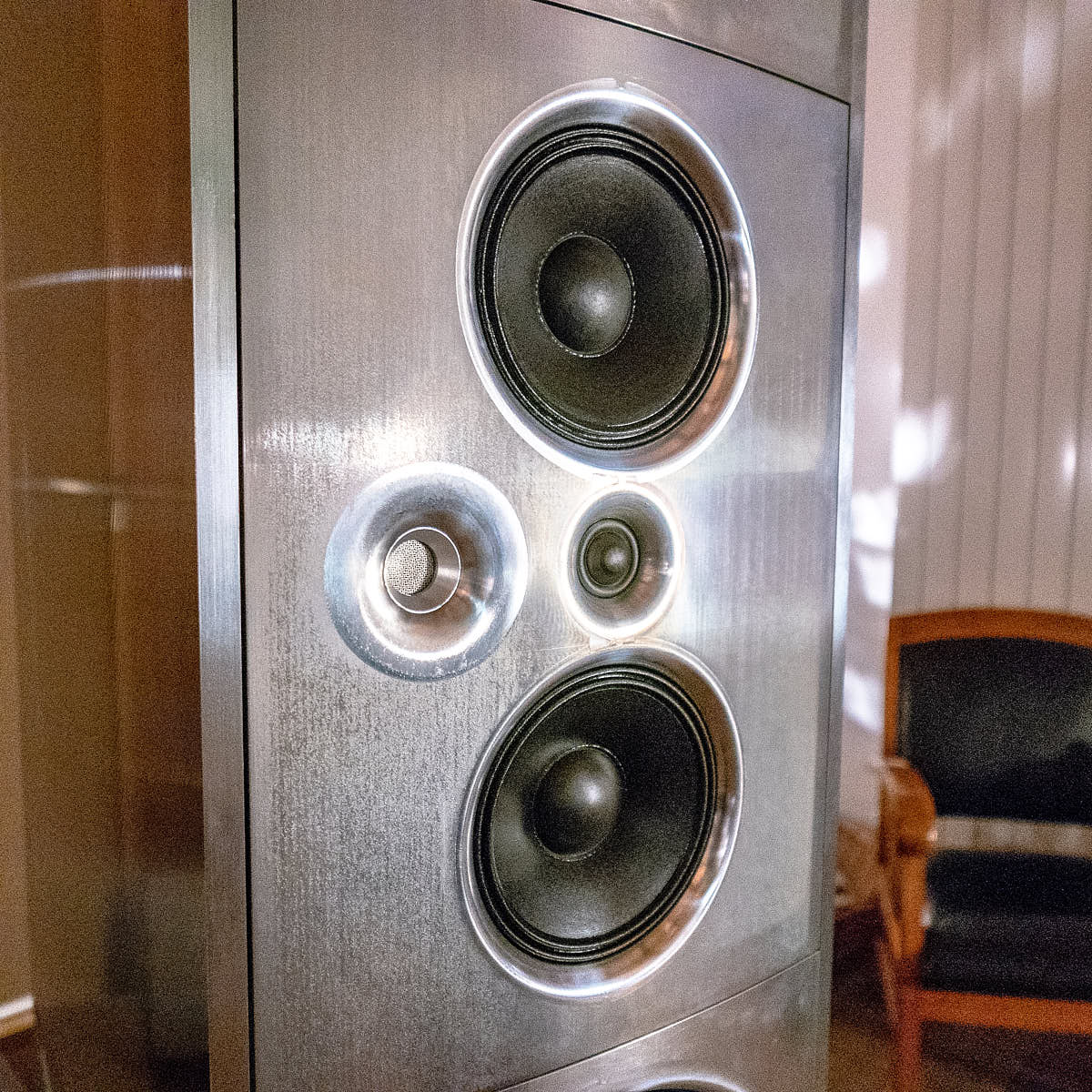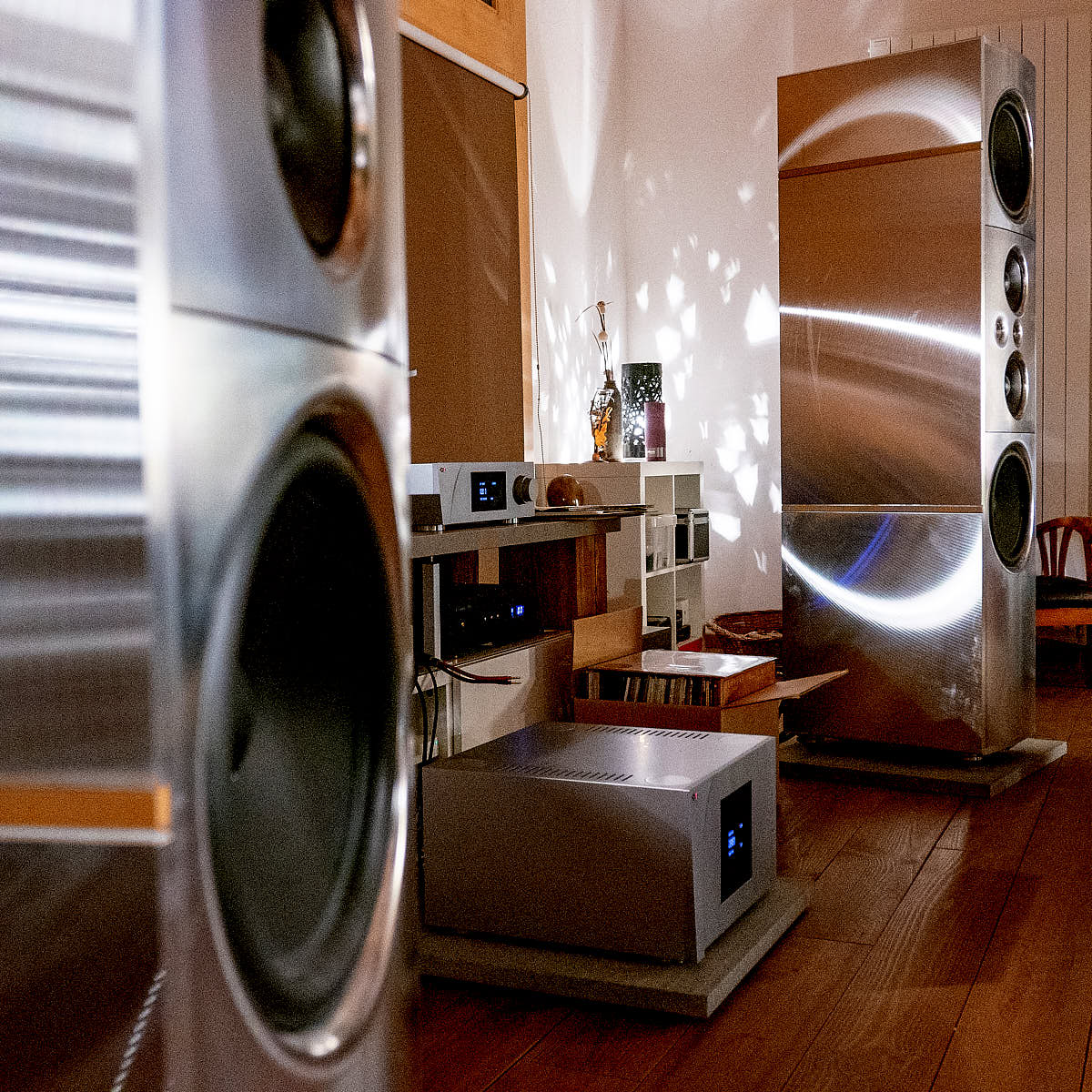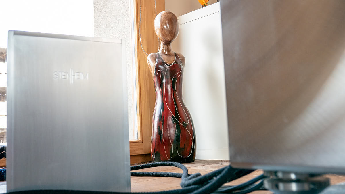 Bei den Schallwandlern handelt es sich, wie zuvor schon erwähnt, um das Modell Ultime aus der Reference Line, das von Stenheim serienmäßig in einer „passiv-aktiven“ Ausführung angeboten wird. Zur Standardausstattung des gewaltigen Vierwege-Systems im geschlossenen Aluminiumgehäuse gehören externe Frequenzweichen, die firmentypisch ebenfalls in einem massiven Aluminiumblock untergebracht sind. Abweichend vom üblichen Stenheim-Farbcodex – schließlich darf man beim Chef zu Hause stets ein Sondermodell oder einen kleinen Beta-Test erwarten – ist hingegen die faszinierende „roh geschliffene“ Oberfläche der Aluminiumgehäuse. „Es gibt Ausführungen,“ sagt JPP mit einem kleinen Augenzwinkern, „die weniger Obacht und Maintenance erfordern. Und zwar jede andere, wenn ich ehrlich bin.“ Der Stenheim-Chef bevorzugt eigentlich die matteren eloxierten Oberflächen für die Ultime, mit standardmäßigen Farbvariationen für den motorisch einwinkelbaren Mittelhochton-Teil. Bei dieser Sonderanfertigung, deren Gehäuse wie „frisch aus der Fräse“ wirken, beschränken sich die farbigen Elemente auf je zwei zarte Seitenleisten.