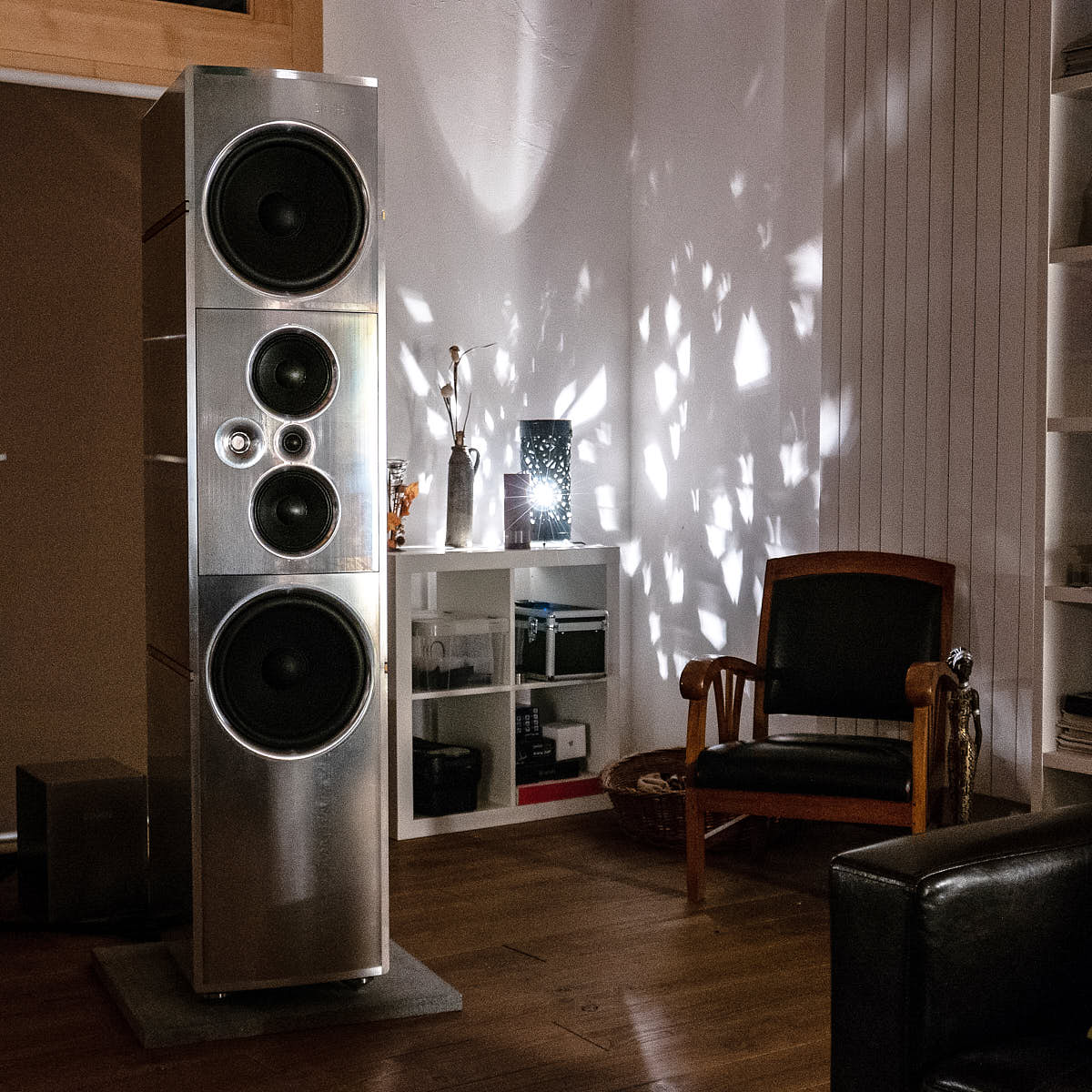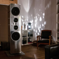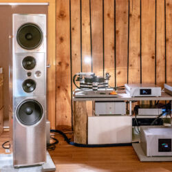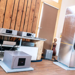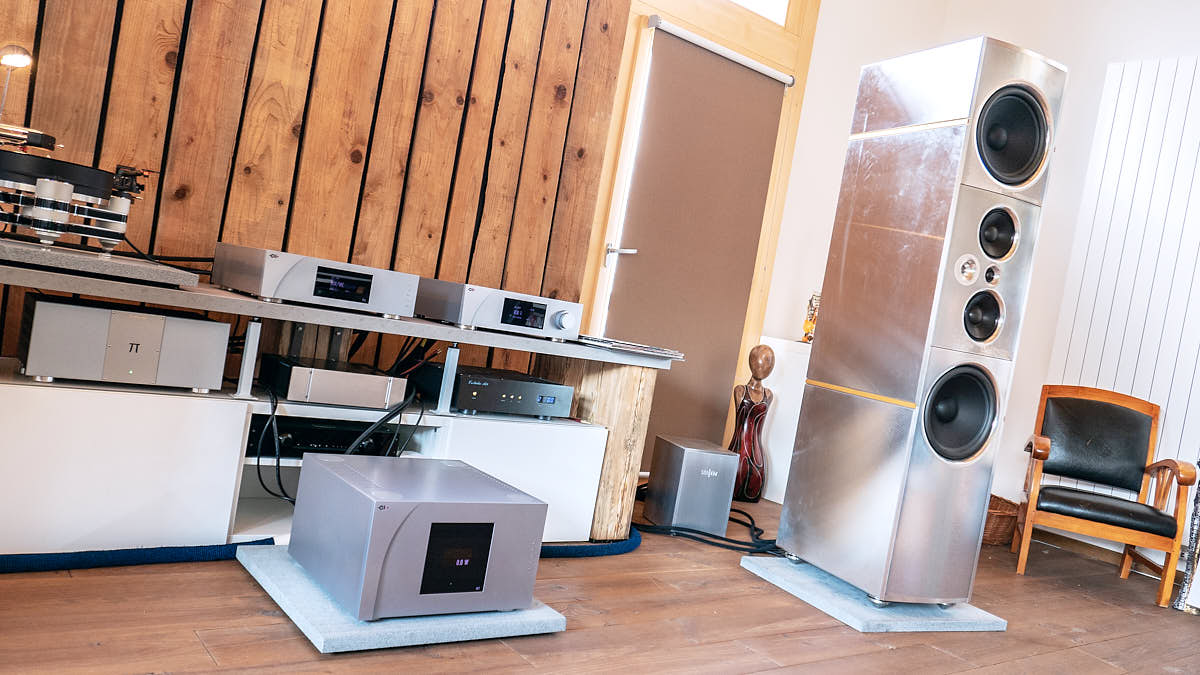 Zeit wird’s, endlich einen genaueren Blick auf die imposante Anlage von Jean-Pascal zu werfen. Da diese schon rein optisch von den riesigen silbrig changierenden Aluminiumsäulen dominiert wird, die zudem der Grund meiner Reise sind, zäumen wir das HiFi-Pferdchen doch einfach mal von hinten auf. Fangen wir mit den mannshohen Lautsprechern von Stenheim an.