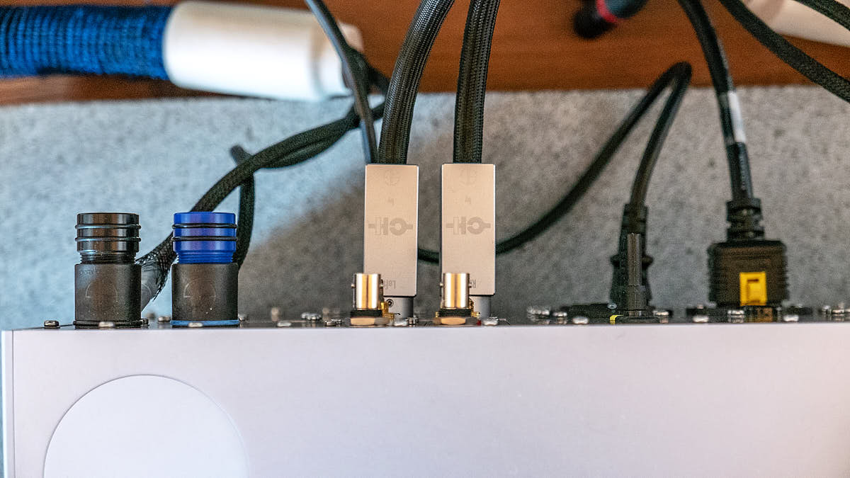Sie werden magnetisch gehalten, verdecken geschickt die Verschraubungen der ineinander verzahnten Gehäusemodule und lassen sich bequem austauschen. Und sie unterstützen den eleganten Eindruck der Ultime noch, deren rundum „roher“ Look verdammt verführerisch wirkt: Es gibt wohl kaum eine Oberfläche, die sich so geschickt an das umgebende Interieur anpasst und zugleich alle Blicke auf sich zieht. Dankbar fängt meine Kamera Licht- und Farbreflexe der geschliffenen Oberflächen ein, die sich hier wie von selbst ergeben und mich mehr als nur ein bisschen an die Elektronikkomponenten von Jeff Rowland erinnern.