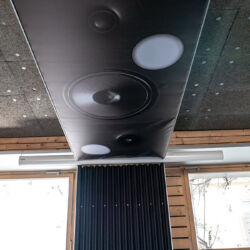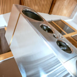 Besonderheiten: Gehäuse komplett aus Aluminium, motorisch einwinkelbare Mittelhochton-Einheit, geschlossene Kammern für jedes Chassis, zum Betrieb zwei Stereo- oder vier Mono-Endstufen pro Paar erforderlich