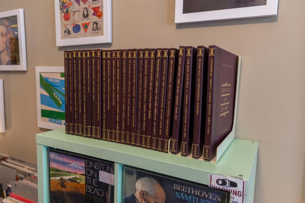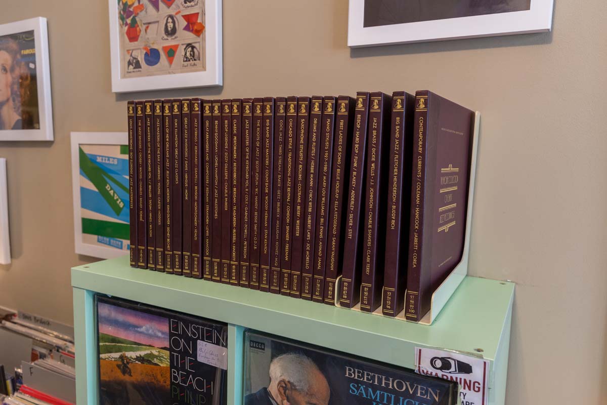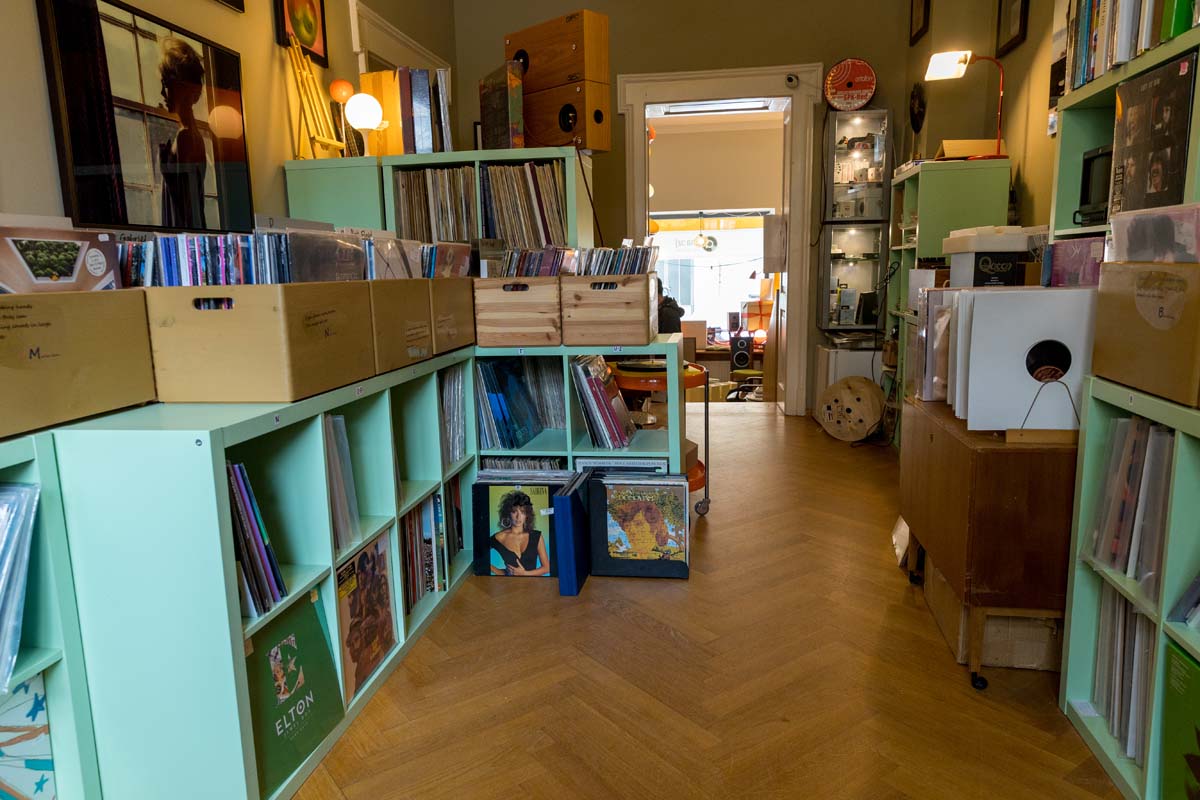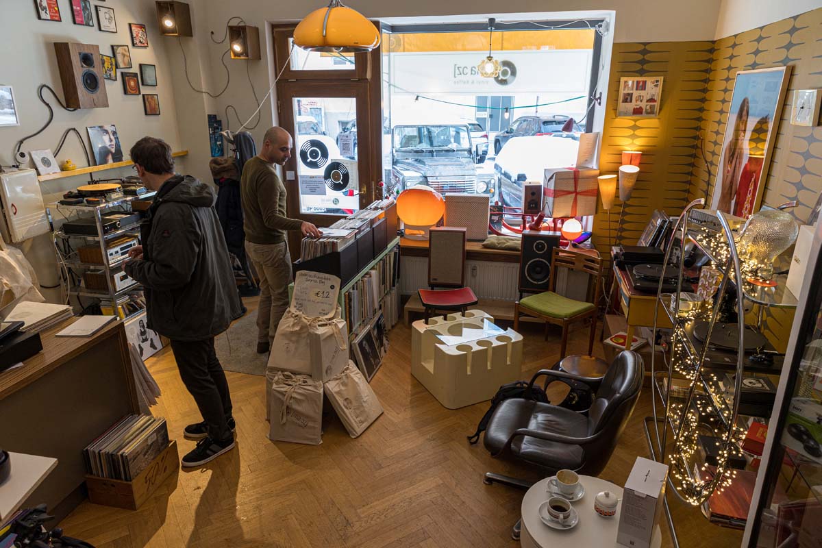 Zunächst wähnt man sich in der Tat eher in einem Café denn in einem Plattengeschäft: Beim Betreten grüßt uns Barista Häppy von der Theke und bietet uns gleich ein Tässchen an, das wir beim Gespräch mit Maoz verköstigen, während wir Fotodrucke bewundern, die alle Wände zieren. Maoz’ eigene Werke reihen sich hier nahtlos neben zugekauften Bildern ein, die Motive unter anderem aus dem Portfolio von Robert Lebeck zeigen. Auch einige der Vintage-Möbel, auf denen das Equipment stilvoll angerichtet ist, hat Maoz selbst restauriert, während er andere auf dem freien Markt ergattert hat.