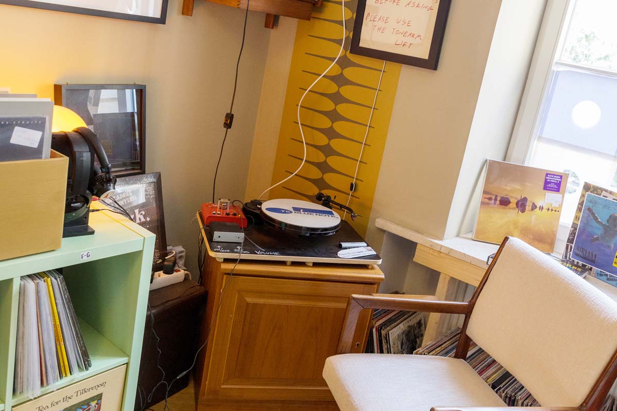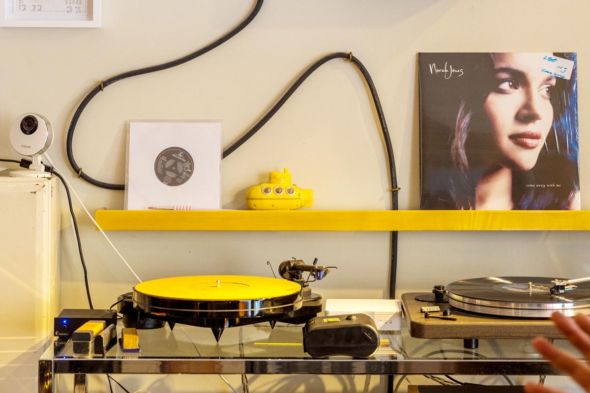 Der Zweck der Übung ist es dabei keineswegs, seinen Kunden das schwarze Gold in Bestform zu präsentieren – tatsächlich kann man sich hier sein komplettes HiFi-System zusammenkaufen, Plattensammlung inklusive. Auch wenn es keinen dedizierten Hörraum gibt, ist das Konzept verblüffend rund: Mit einer Auswahl Vinyl unter dem Arm setzt man sich mit einem Kaffee hin, hört die Platten auf der Anlage seiner Wahl in einer absolut lebensnahen Umgebung durch und entscheidet, was man gerne behalten möchte. Wie uns Maoz erklärt, kam der Verkauf von HiFi-Komponenten zunächst eher organisch als Nebengeschäft dazu, entwickelte sich aber immer mehr zu einem zentralen Standbein. „Wenn ihr in einem Jahr nochmal vorbeikommt, kann es gut sein, dass HiFi das Hauptgeschäft sein wird und ich hier Platten nur nebenher verkaufe“, prophezeit er.