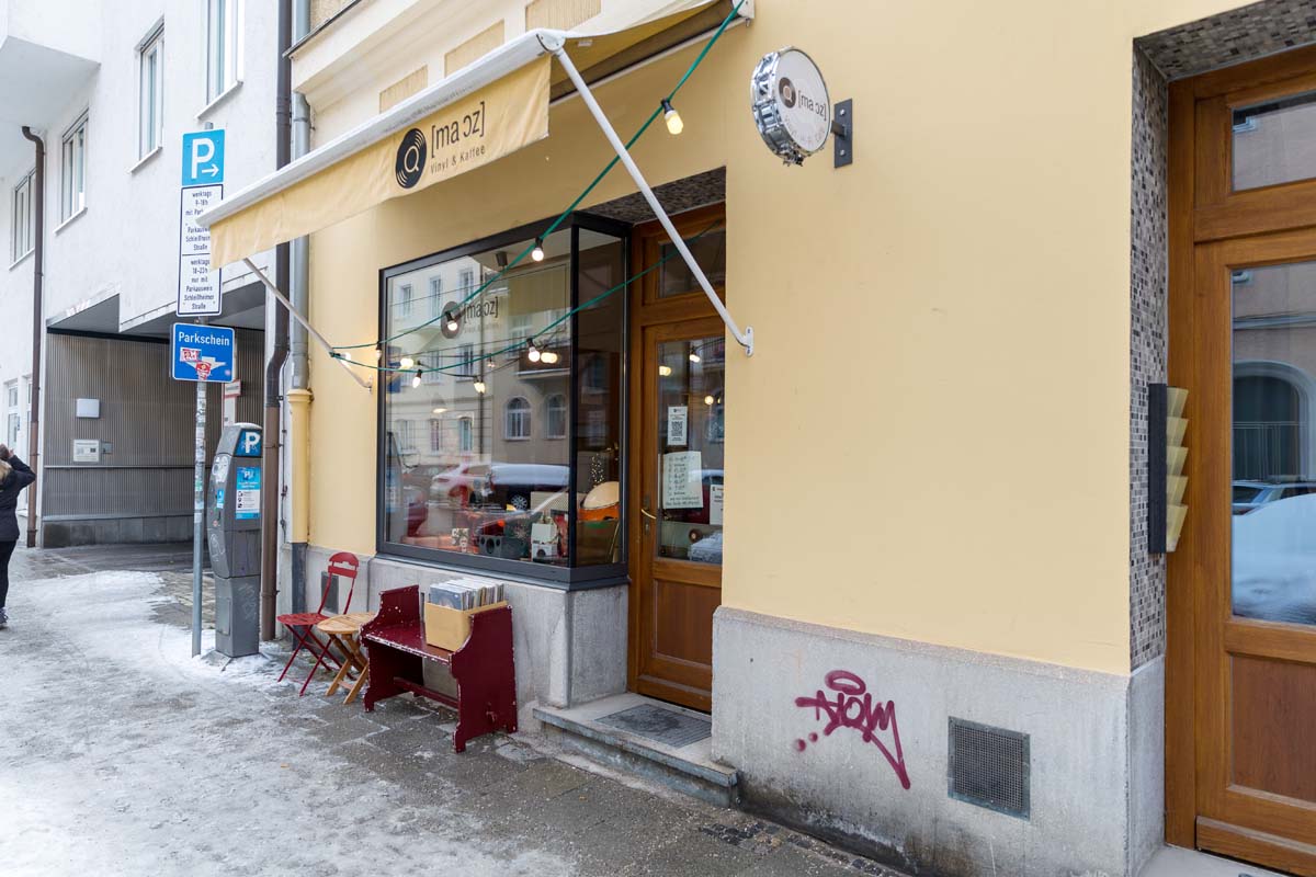 In Deutschland hielt er es in seiner angestammten Branche dementsprechend kaum mehr als zwei Jahre lang aus, ehe er beschloss, den Sprung ins kalte Wasser zu wagen und nicht eine, sondern gleich mehrere seiner im Laufe der Jahre erworbenen Fertigkeiten zu einem Geschäftsmodell zu verdichten. So entstand Ende 2014 das „Maoz Vinyl & Kaffee“, ein kleiner Laden in der wohlangesehenen Münchner Maxvorstadt, in dem man sich wie in vielen anderen Plattenläden auch gemütlich durch die bunt gemischte Schallplattensammlung wühlen kann. Anders als in anderen Plattenläden bietet es sich hier allerdings an, sich im Eingangsraum erstmal einen Espresso zu gönnen und die Einrichtung zu bestaunen.