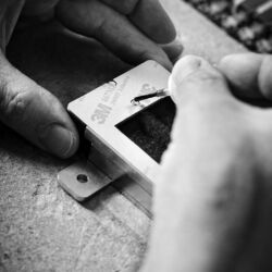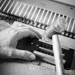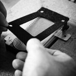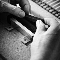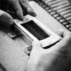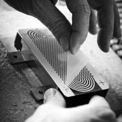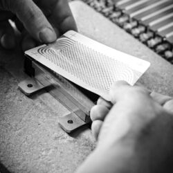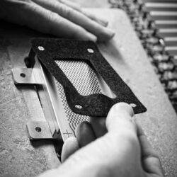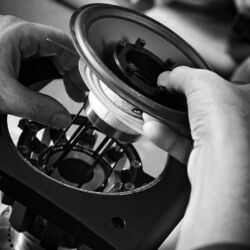 Genau diesen Eindruck vermittelt die Manufaktur bei unserem Besuch. Im ruhigsten Eck der Firma (aber doch nahe genug am Betriebskühlschrank mit den Frem-Cola-Vorräten) entstehen besagte Bändchenhochtöner in konzentrierter Handarbeit. Die bewegte Masse beträgt 0,02 Gramm. Michael zieht zur Verdeutlichung eine der hauchdünnen, feingliedrig geprägten Aluflächen von der Trägerfolie und reicht sie herum – jede Mücke ist dagegen ein Elefant. Die Membranfolie liefert übrigens ein nachbarschaftlicher Spezialbetrieb zu, der einst Mobiltelefone und Mikroantennen baute und auf reichlich Erfahrung mit anspruchsvoller Feinmechanik zurückgreifen kann.