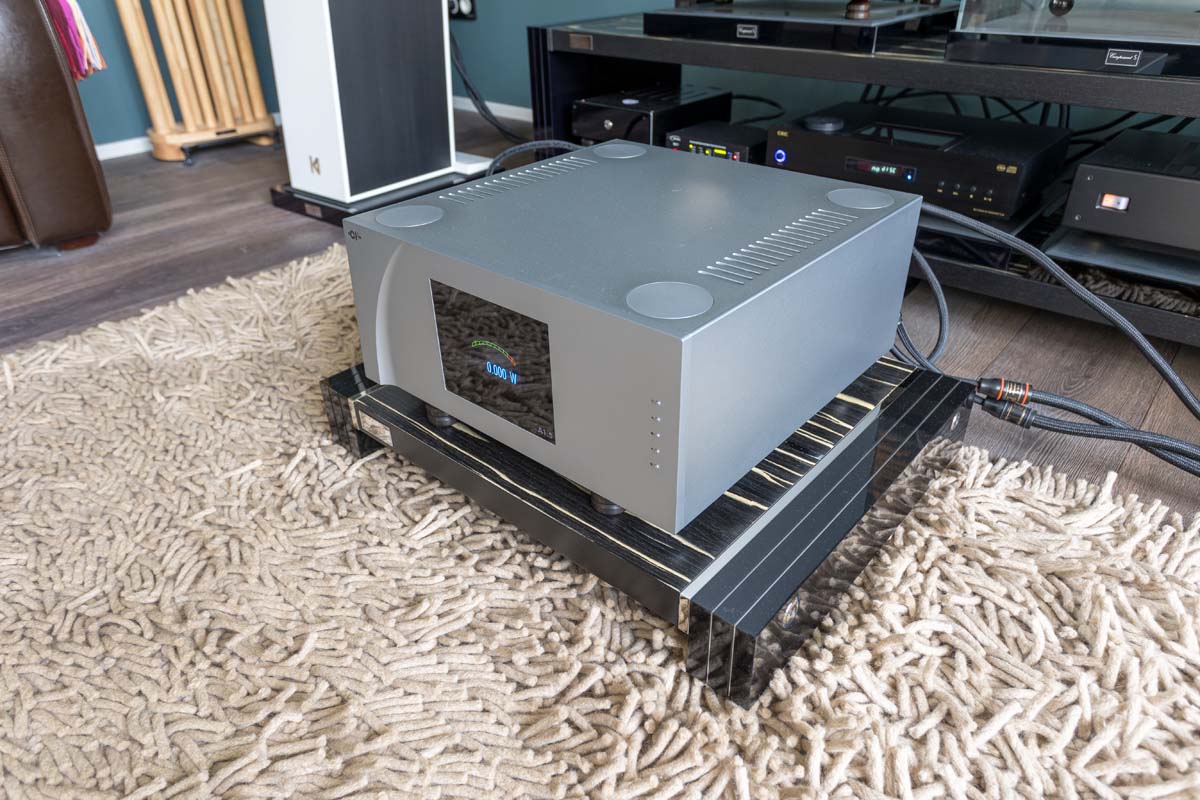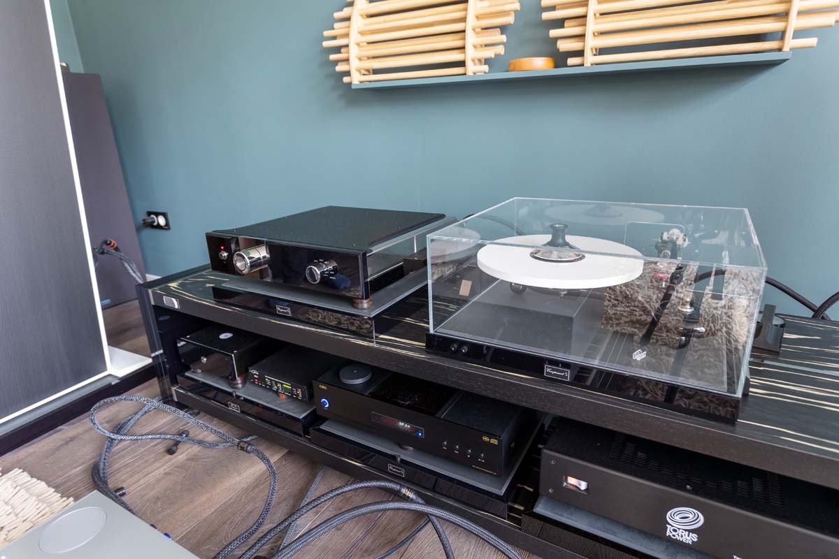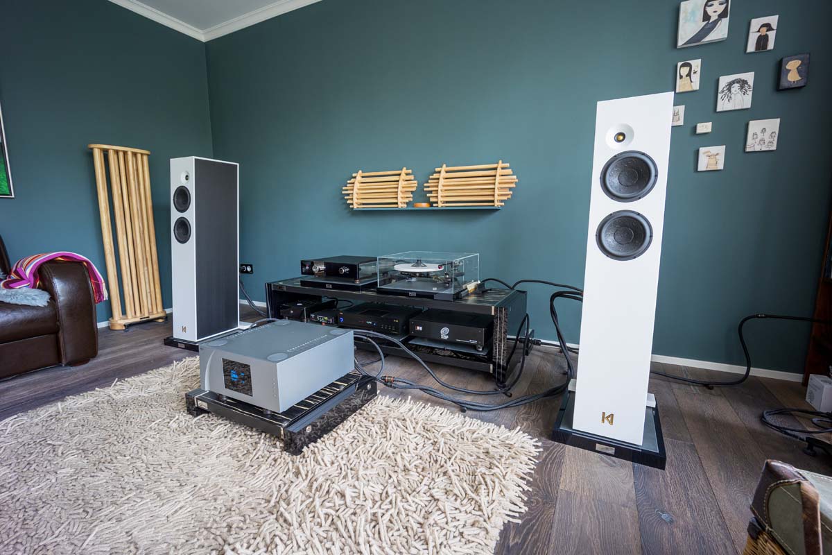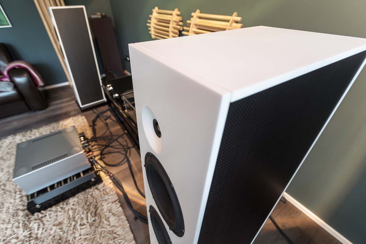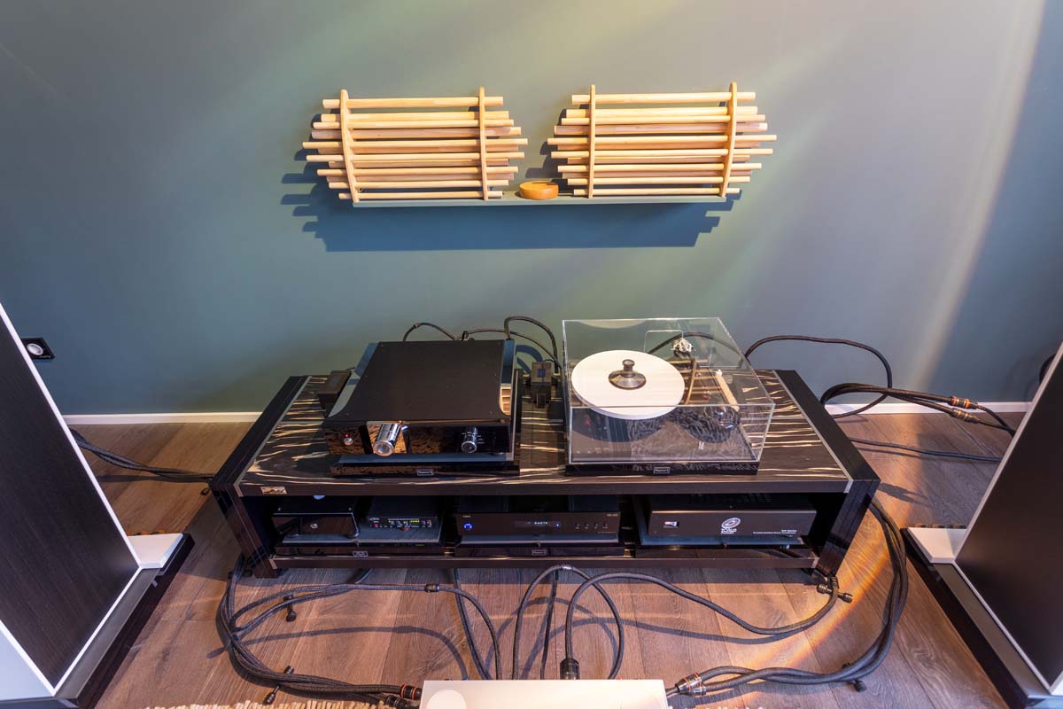 Die Auflistung (beinahe) aller Geräte, Kabel und Akustikelemente finden Sie auf der Homepage von Subbase Audio, weshalb ich mich auf die markantesten Aspekte beschränken will. Schlippers größte Entdeckung ist die Stella von Kroma Audio aus Spanien, wie er mir erzählt. Der Lautsprecher habe ihn nicht nur optisch beeindruckt, sondern verfolge ein Konzept, dass er extrem spannend finde. Die leuchtend weiße Schönheit hat eine klare Formsprache, die zu den Subbase-Komponenten passt, besitzt Seitenwände aus Carbon und besteht größtenteils aus einem Material namens Krion. Ein Kunststein, der so hohe Dichte aufweise, dass er (zumindest in dem Frequenzbereich, der uns interessiert) praktisch keine Resonanzen entstehen lasse. Angetrieben werden die Boxen von einer CH-Precision-Endstufe (A1.4), die über einen Vorverstärker von Tidal Audio geregelt wird. Es versteht sich, dass sämtliche Komponenten auf Basen platziert sind, die ihrerseits in einem Shambala-Rack ruhen. Für sauberen Saft sorgen eine Stromaufbereitung von Torus Power sowie ein Netzverteiler von S.I.N. Audio.