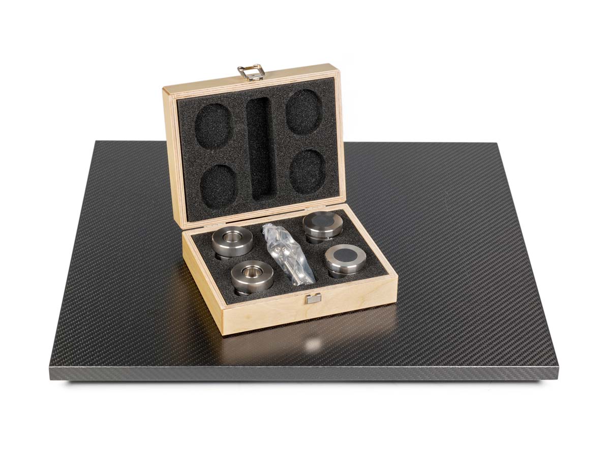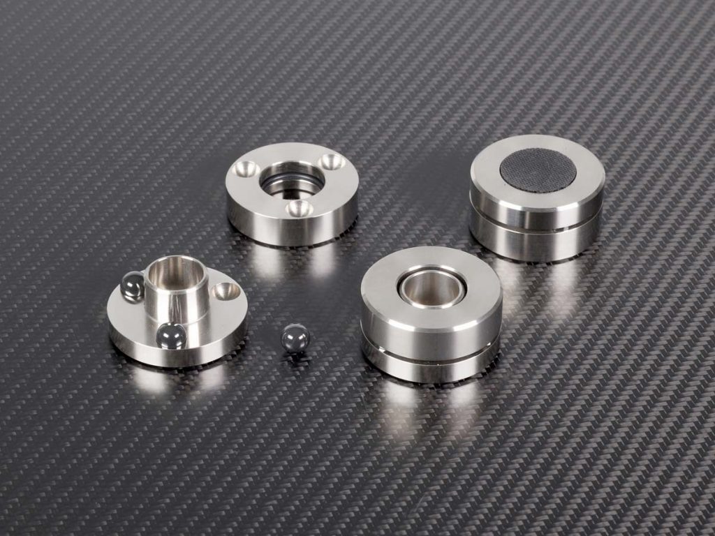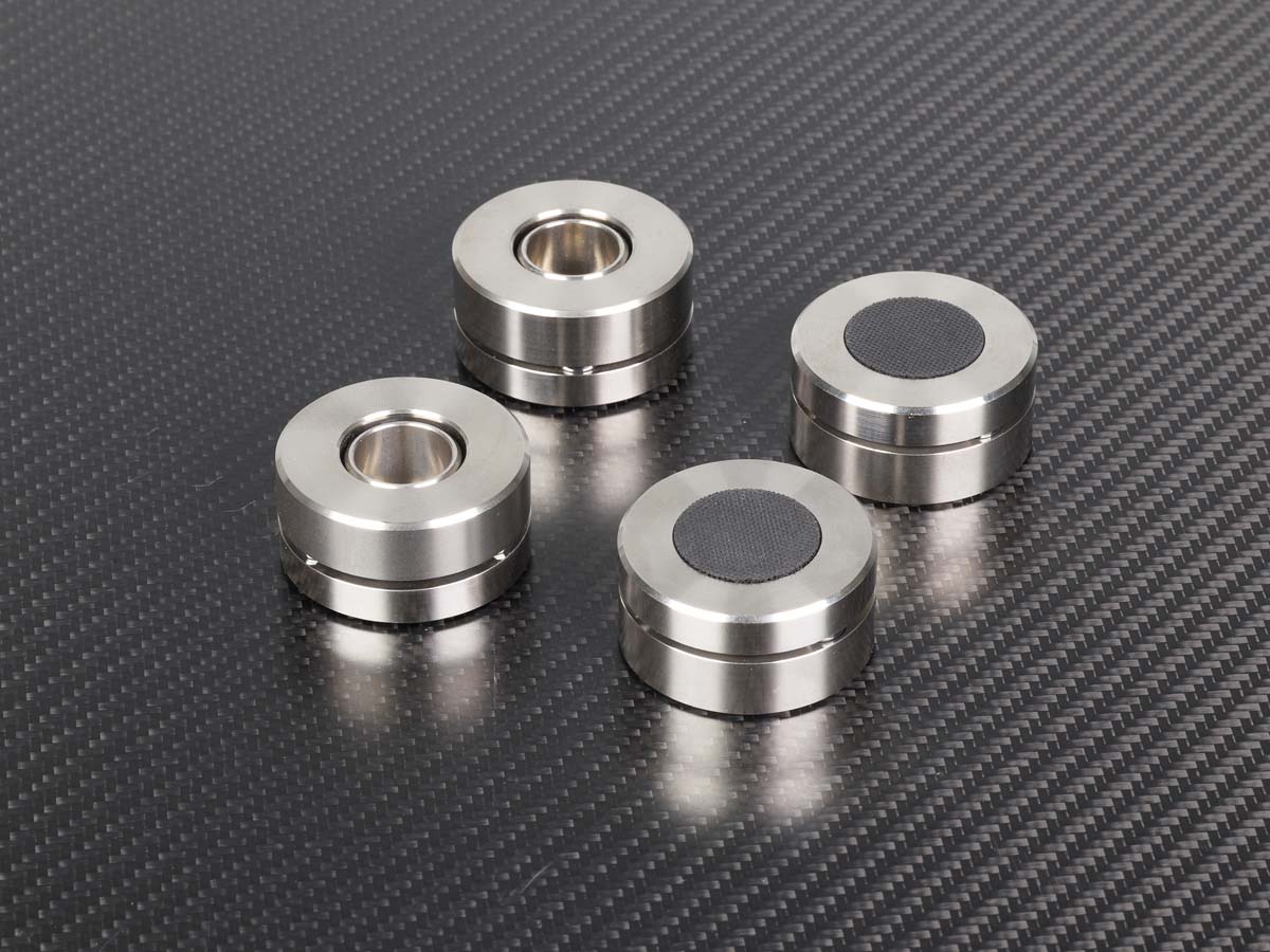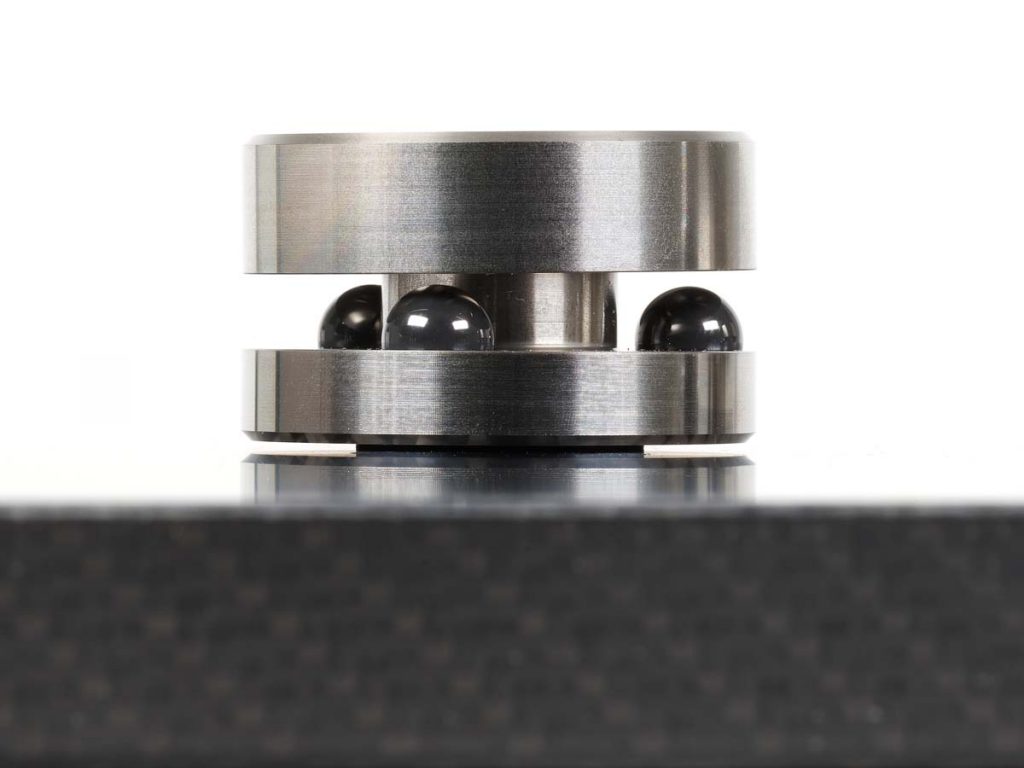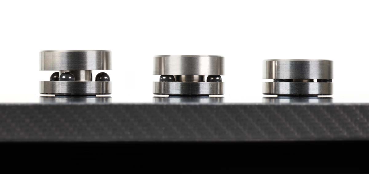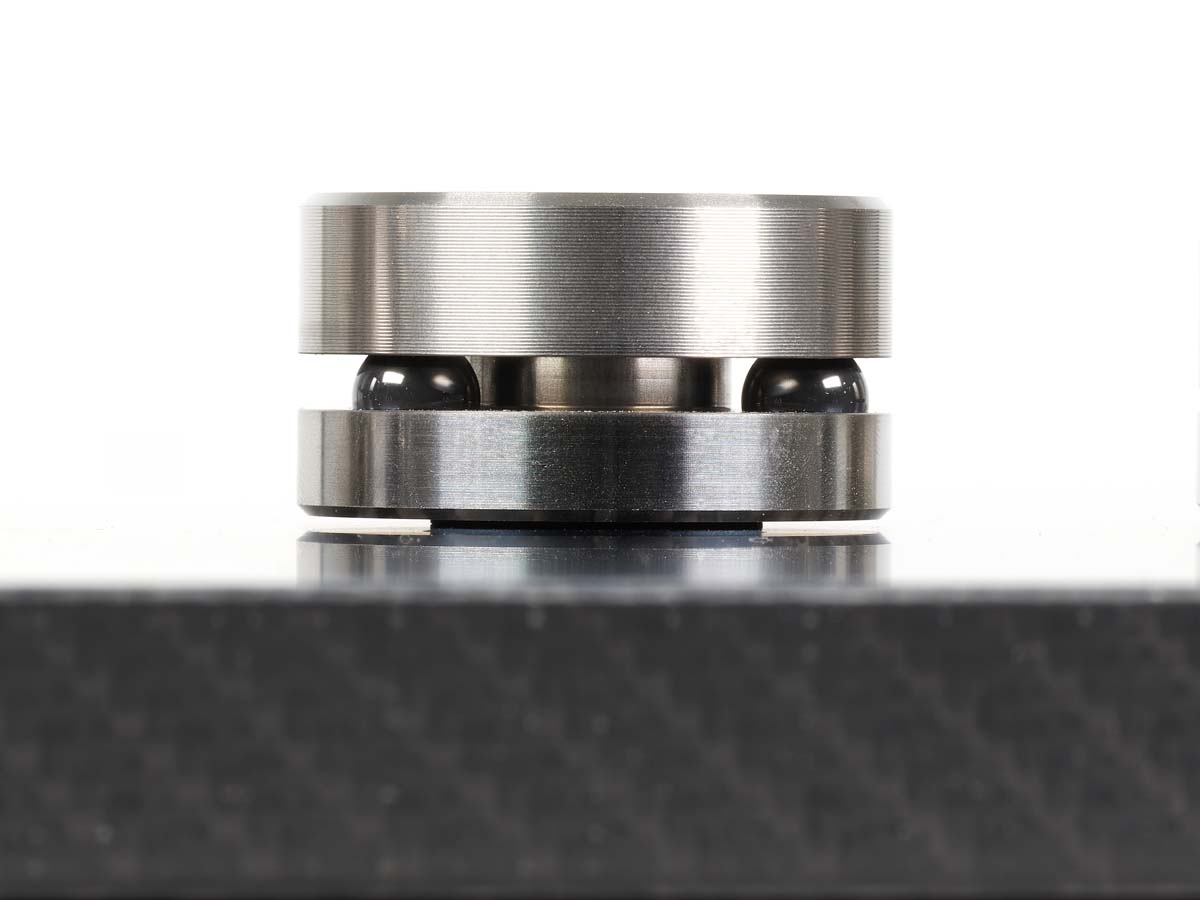 Die Cerabase slimline, die uns zum Test vorlagen, sind in erster Linie für den Austausch von Serien-Gerätefüßen gedacht, deren Güte nicht mit der Maschine mithält, an denen sie angebracht sind. Es gibt freilich noch weitere Varianten der Füße, die auch andere Anwendungsfälle abdecken. Die Cerabase slimline bestehen aus zwei hochpräzise gefertigten Edelstahlscheiben. Zwischen den Hälften sorgen je drei synthetisch hergestellte Keramikkugeln für besagte harte Ankopplung. Die Füße sind schlanke 21,5 Millimeter hoch und haben einen Durchmesser von 45 Millimetern. Tragen kann ein Vierersatz beachtliche 500 Kilo, ein Dreiersatz 375 Kilo. Für ein Füße-Quartett werden 480 Euro fällig.