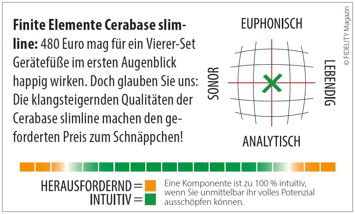 Was gut ist, das hält sich. Auch wenn sich die Welt massiv verändert. Die Firma Finite Elemente gibt es gefühlt so lange, wie High End ein Thema bei Musikhörern ist. Und heute wie einst steht sie für deutlich hörbare Klangverbesserung durch den Einsatz ihrer Racks, Basen und Gerätefüße, wie den Cerabase slimline.