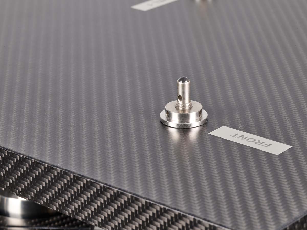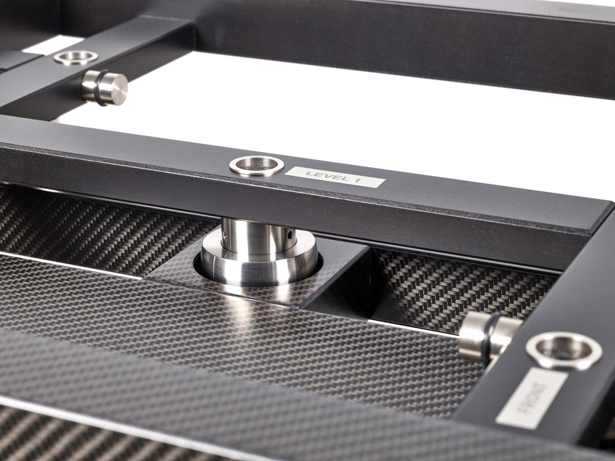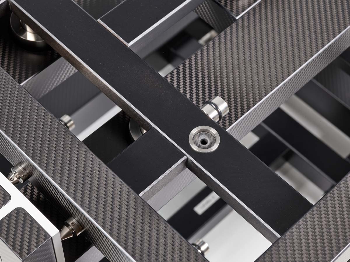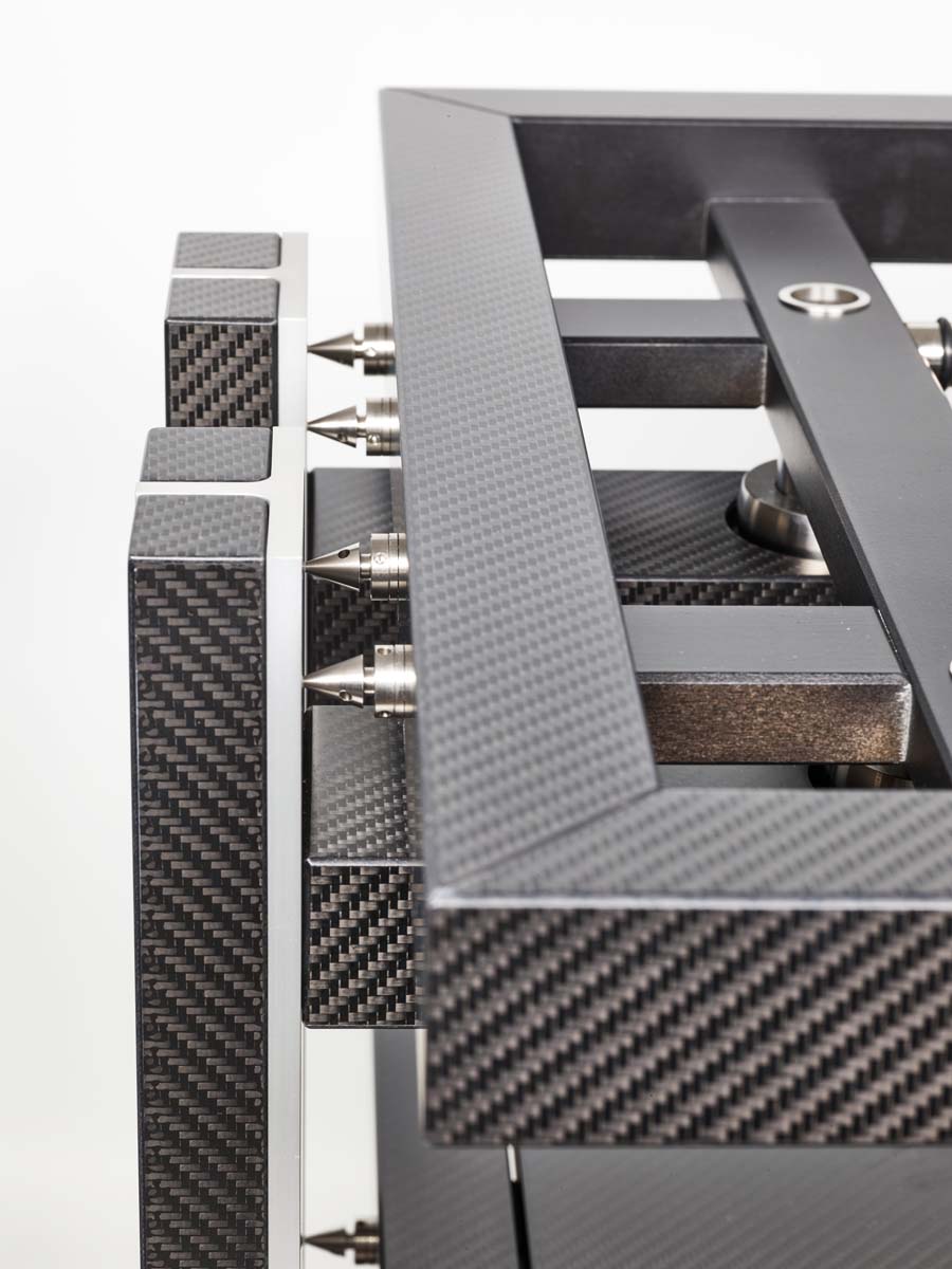 In der Disziplin der Charakterlosigkeit hat uns bereits das Finite Elemente Pagode Edition Mk II begeistert. Mit dem Pagode Carbon Edition legt der Hersteller nun noch einmal nach: Durch die vollständige Verschalung mit Kohlefaser-Verbundwerkstoff erhöht sich die Steifigkeit des Aufbaus nochmals, wodurch das Rack Vibrationsenergie noch effektiver ableiten soll. Am grundlegenden, äußerst aufwendigen Konzept wurde indessen nichts geändert – warum auch, wenn es doch so prächtig funktioniert: Fest mit der Bodenebene verbundene T-Profile aus Aluminium tragen die Tragrahmen der höheren Ebenen, die über Spikes mit der Hauptstruktur verbunden sind. Auf diesen Rahmen wiederum sitzen die leichten Honeycomb-Komponentenböden auf, wobei der Kontakt zu den Tragrahmen über Keramikkugelbolzen hergestellt wird. Die Ankopplung des gesamten Racks zum Boden erfolgt über die Cerabase-Füße von Finite Elemente, bei denen statt der üblichen Spikes pro Fuß je drei Keramikkugeln zum Einsatz kommen, um die richtige Balance zwischen Dämpfung und Ableitung von Vibrationen herzustellen.