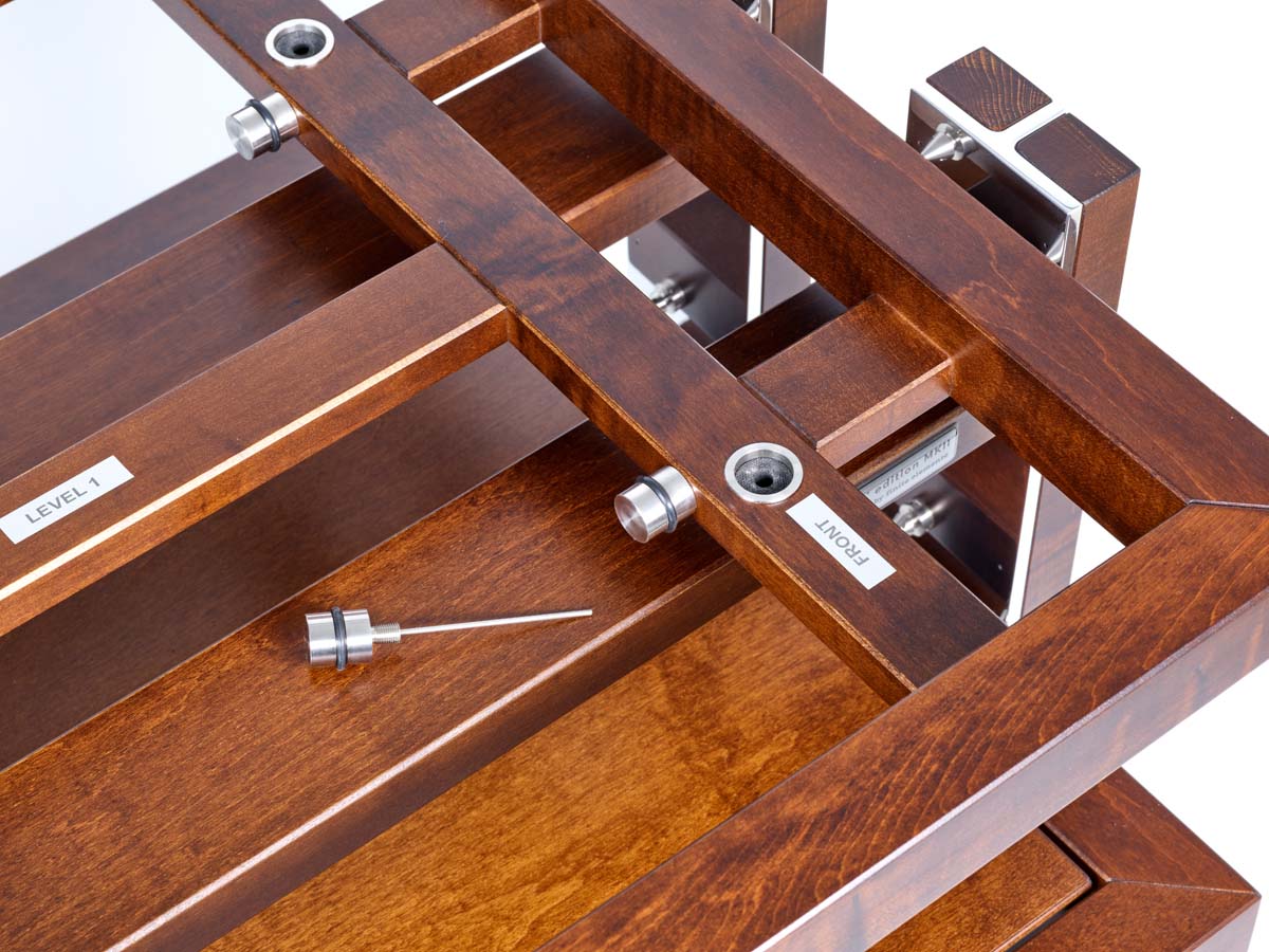 Und genau hier kommt die Finite-Elemente-eigene Resonator-Technologie ins Spiel. In jeder Ebene verbergen sich vier dieser Resonatoren: kleine Metallstifte, die jeweils exakt auf eine definierte Frequenz abgestimmt sind. Sie nehmen die Resonanzschwingungen der Flächen auf, an denen sie montiert sind, und schwingen an deren Stelle. Da sie selbst nur eine sehr geringe Abstrahlfläche aufweisen, geben sie dabei auch nur einen geringen Schalldruck ab, der sich in dem kleinen Hohlraum, in dem der Resonator sitzt, von außen unbemerkt totlaufen kann. Obwohl die Rackebenen an sich identisch sind, unterscheiden sich ihre Resonanzfrequenzen, da sie auf unterschiedlichen Höhen an den Tragrahmen angekoppelt sind: Da die höheren Ebenen weiter von der Bodenebene entfernt sind, hängen sie quasi an einem längeren Pendelarm und sind dementsprechend auf niedrigeren Frequenzen anregbar. Deshalb müssen die Resonatoren für jede Ebene einzeln abgestimmt werden. Um wirklich alle Resonanzen abzufangen, sind dabei auch innerhalb einer Ebene die vier Resonatoren unterschiedlich getunt. Als Besitzer muss man sich auf all die Komplexität zum Glück allenfalls aus reiner Neugier auseinandersetzen: Unterschiede im Komponentengewicht wirken sich im Grunde nur auf die Amplitude der Resonanzen aus, die Frequenz an sich wird hierdurch kaum beeinflusst, jedes Rack ist damit ein geschlossenes System, bei dem auch bei wechselnden Geräten kein Austausch von Resonatoren nötig ist. Der Abstimmung der Resonatoren wird eine Belastung der Ebenen von jeweils 50% zugrunde gelegt. Etwaige geringfügige Frequenzschwankungen werden problemlos von der Bandbreite der Resonatoren aufgefangen, die Abweichungen bis etwa 10% ihrer Tuningfrequenz tolerieren.