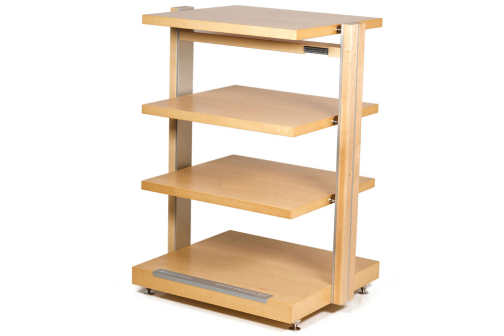 So verzichtet das „kleine“ Finite Elemente auf die aufwendigen keramikkugelgelagerten Einlegeböden und die proprietäre Resonatortechnologie, behält gleichwohl die guten Grundanlagen: Der Aufbau aus T-förmigen Aluminiumprofilen und Geräteebenen mit ultraleichtem Wabenkern sorgt getreu der Herstellerphilosophie für eine gezielte Dämpfung und Ableitung von Schwingungsenergie, statt sie unkontrolliert zu speichern. Die starre Ankopplung der einzelnen Ebenen über Sidespikes folgt demselben Ansatz, woraus sich der ungemein offen-kontrollierte Nicht-Charakter des Racks erschließt – ein Finite Elemente durch und durch.