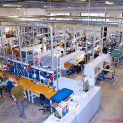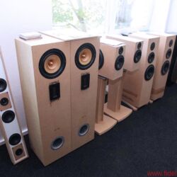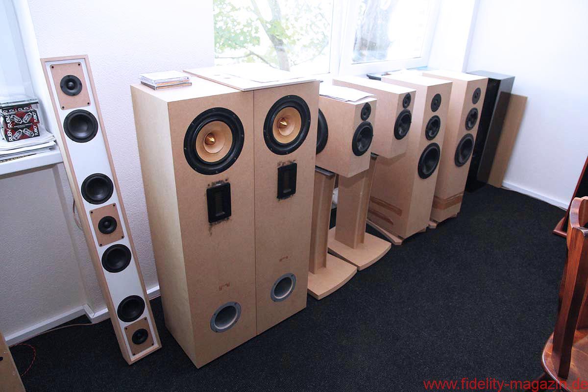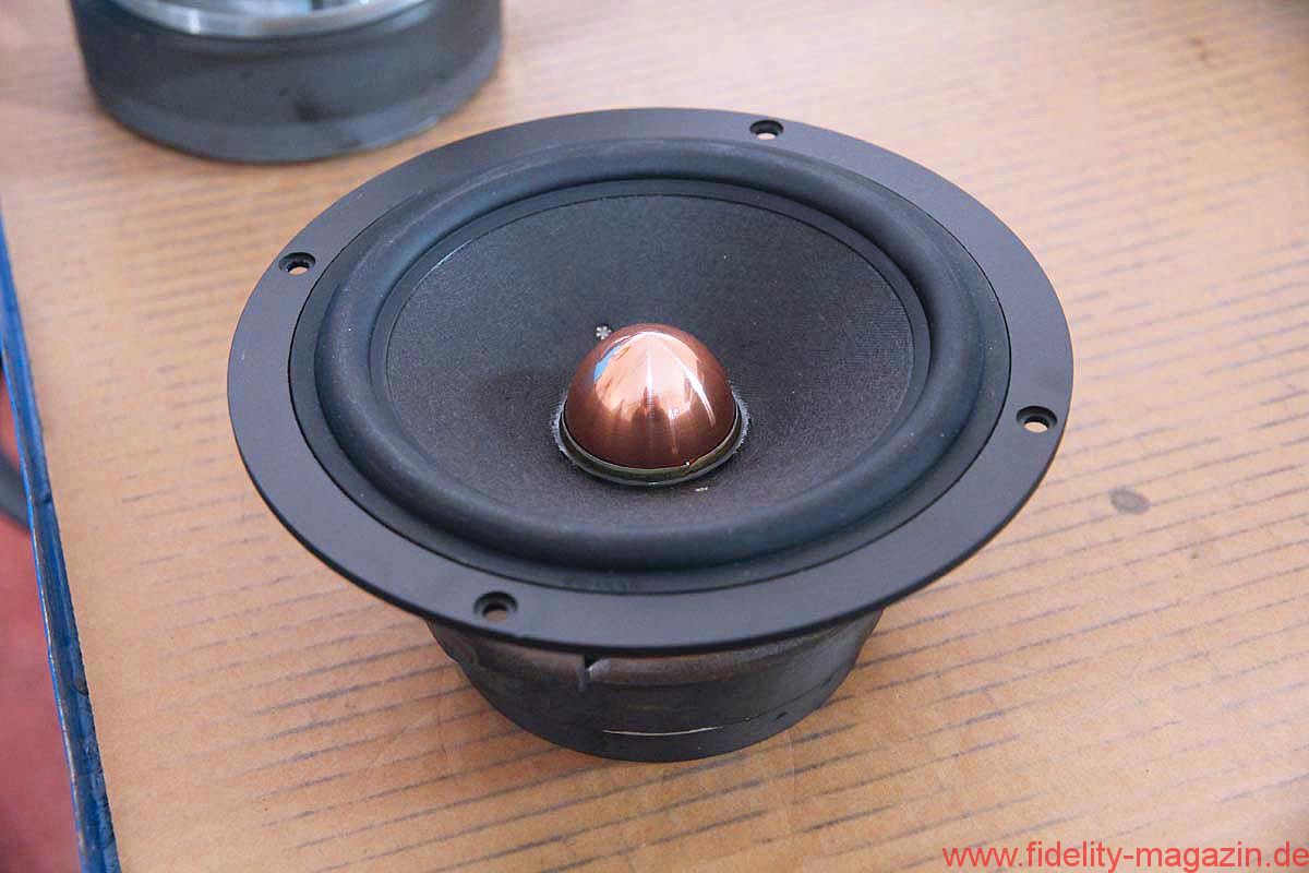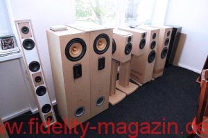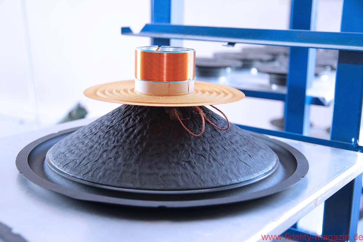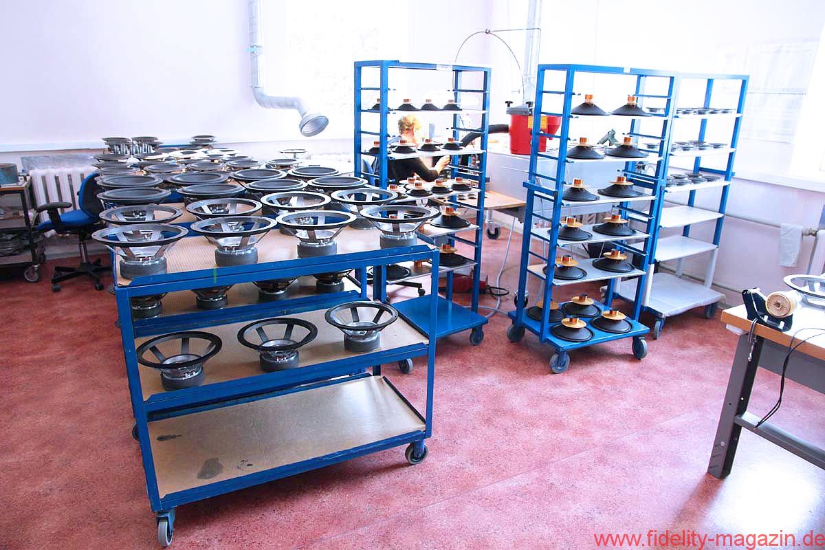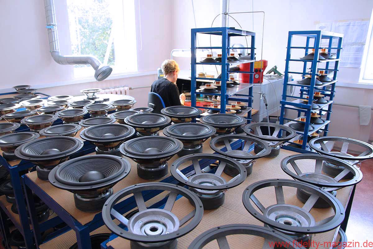 Ein Durchgang führt in eine mittelgroße Halle, vielleicht 300 Quadratmeter groß, in der verschiedenste Lautsprechergehäuse entstehen, für den Eigenbedarf, aber auch für diverse Auftraggeber. Und so mancher OEM-Kunde legt auch hier keinen gesteigerten Wert darauf, in Wort oder Bild zu erscheinen. Auf einem langen Transportband werden gerade flache Lautsprecher mit sehr vielen Chassis bestückt: