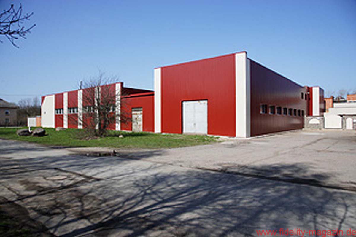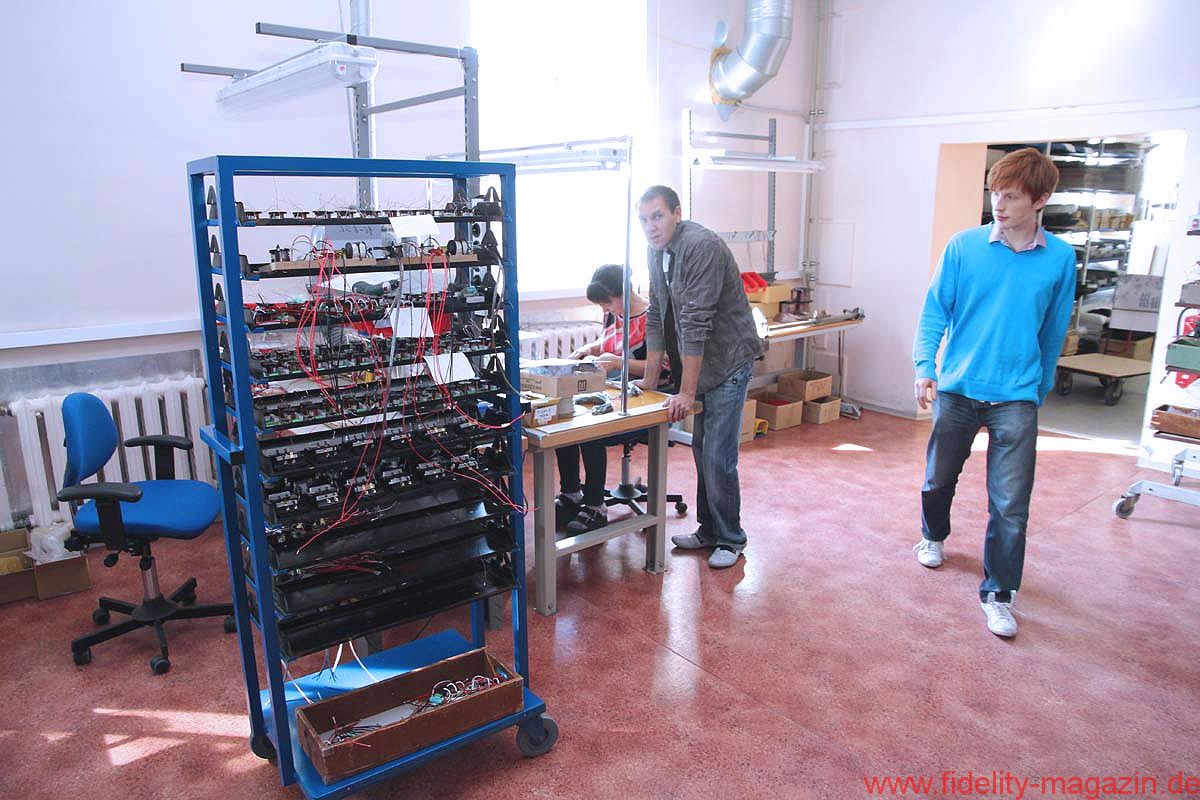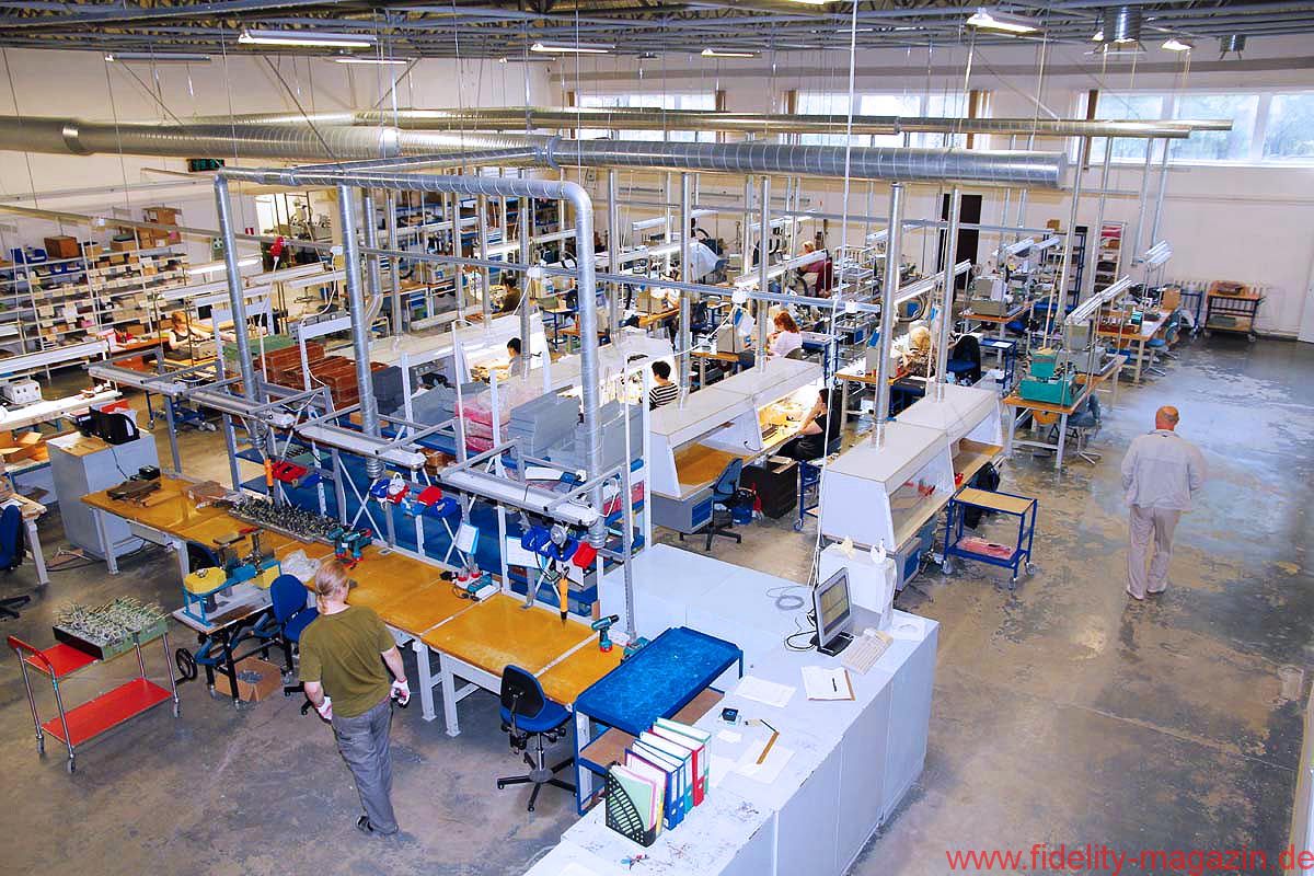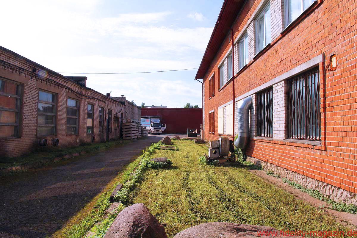 Vom Konferenzraum, wo ganz nebenbei auch ein paar interessante Lautsprecher- und Röhrenverstärker-Prototypen stehen, schreiten wir durch lange Flure mit nüchternem Linoleum-Charme, biegen um etliche leicht bröckelnde, aber auch um frisch verputzte Ecken, winken kurz den Damen in der Buchhaltung zu, trippeln eine Treppe hinunter und überqueren schließlich den Hof bei skandinavisch-sommerlicher Sonne, hinüber zu einer der Produktionshallen.