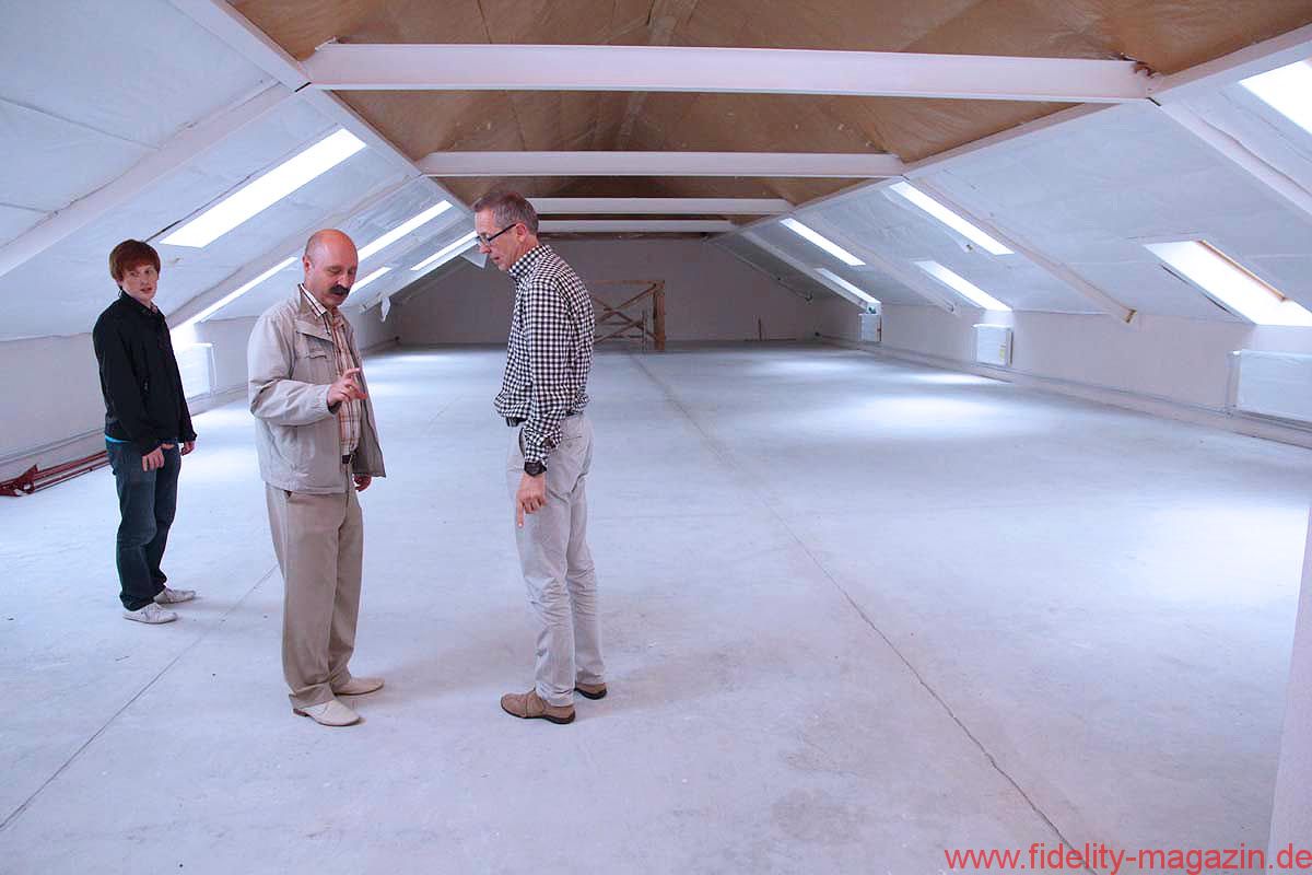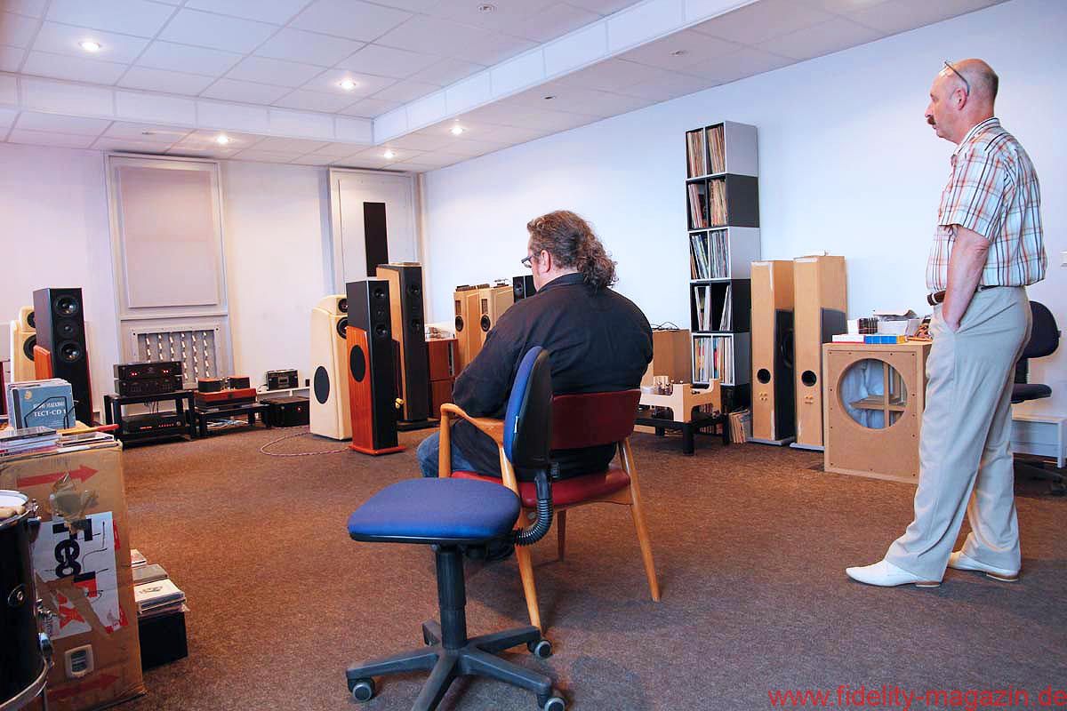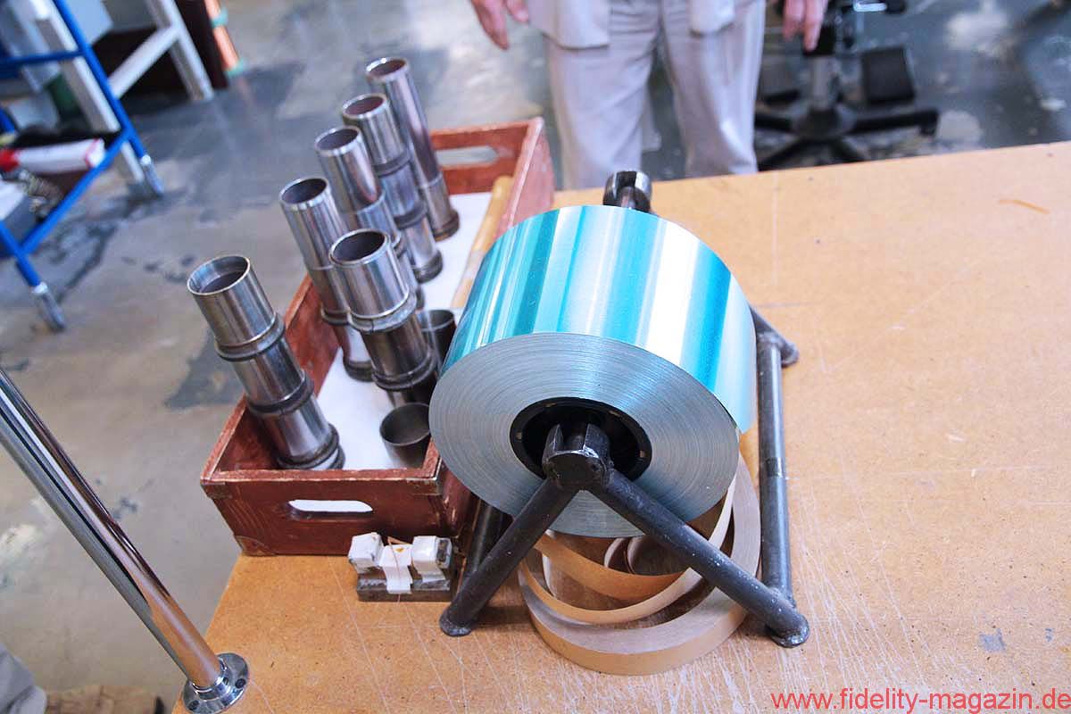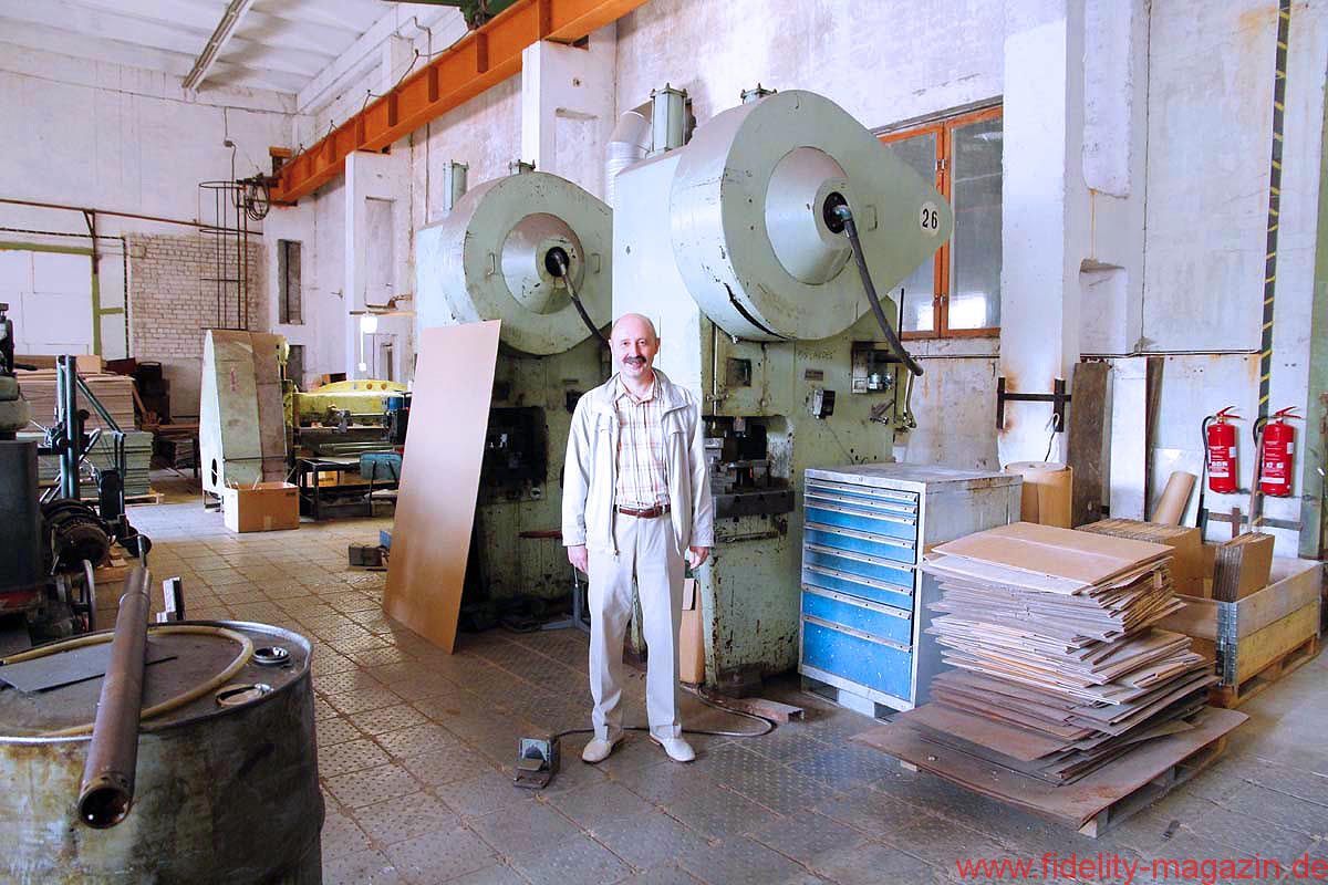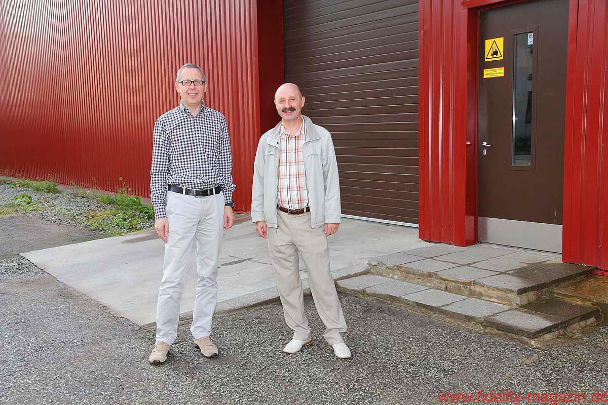 Vom Konferenzraum, wo ganz nebenbei auch ein paar interessante Lautsprecher- und Röhrenverstärker-Prototypen stehen, schreiten wir durch lange Flure mit nüchternem Linoleum-Charme, biegen um etliche leicht bröckelnde, aber auch um frisch verputzte Ecken, winken kurz den Damen in der Buchhaltung zu, trippeln eine Treppe hinunter und überqueren schließlich den Hof bei skandinavisch-sommerlicher Sonne, hinüber zu einer der Produktionshallen.