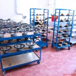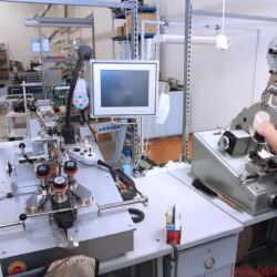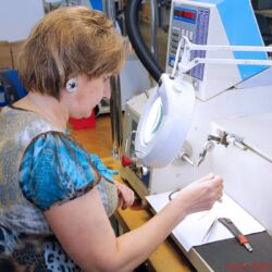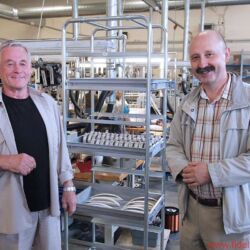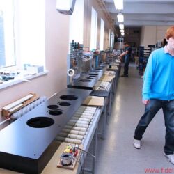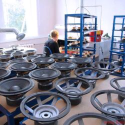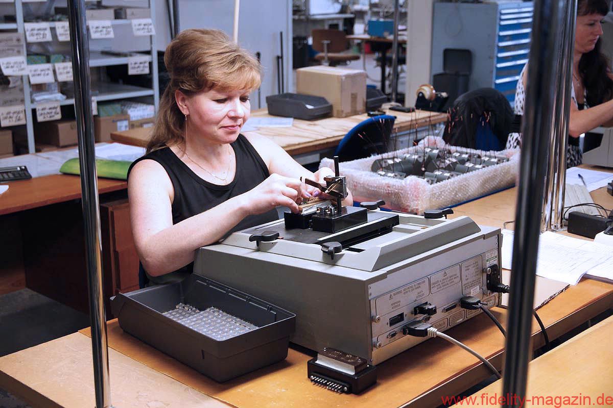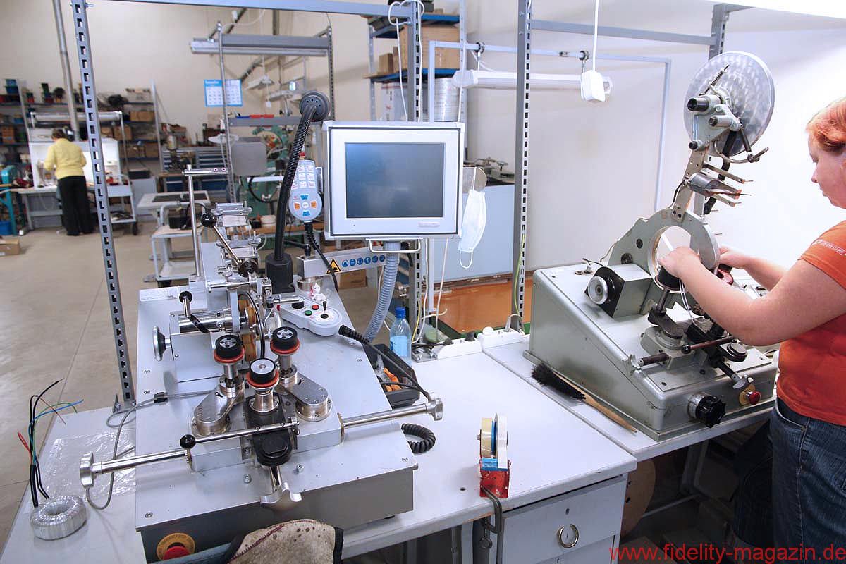 Zurück in der Trafohalle: Erkennbar werden hier die unterschiedlichsten Größen von Spezial- und Schwingspulen, von Übertragern und Transformatoren sorgfältig gewickelt und bearbeitet: von winzigen Spülchen über Drucksensoren mit Magnetventil bis zu einer Art „Trafozilla“, den ich mir kaum in einer üblichen HiFi-Anwendung vorstellen kann. Oder ist das extremes High End? Igor lächelt verschmitzt. Na, dann wohl eher nicht. Völlig eindeutig hingegen ist das fertige Bauteil zuortbar, das eine robuste Dame mit Schutzkittel und Schutzbrille gerade aus einer rechnergesteuerten Drehbank herausschraubt: Hier entstehen Lautsprecher-Körbe und -Magnete in feinster Qualität, die später in einer sehr renommierten Marke eingesetzt werden – dann sicherlich als Eigenentwicklung und „aus eigener Fertigung“ gepriesen, das kennen wir ja schon. Ich werde schweigen können. Und fotografiere nicht.