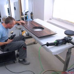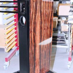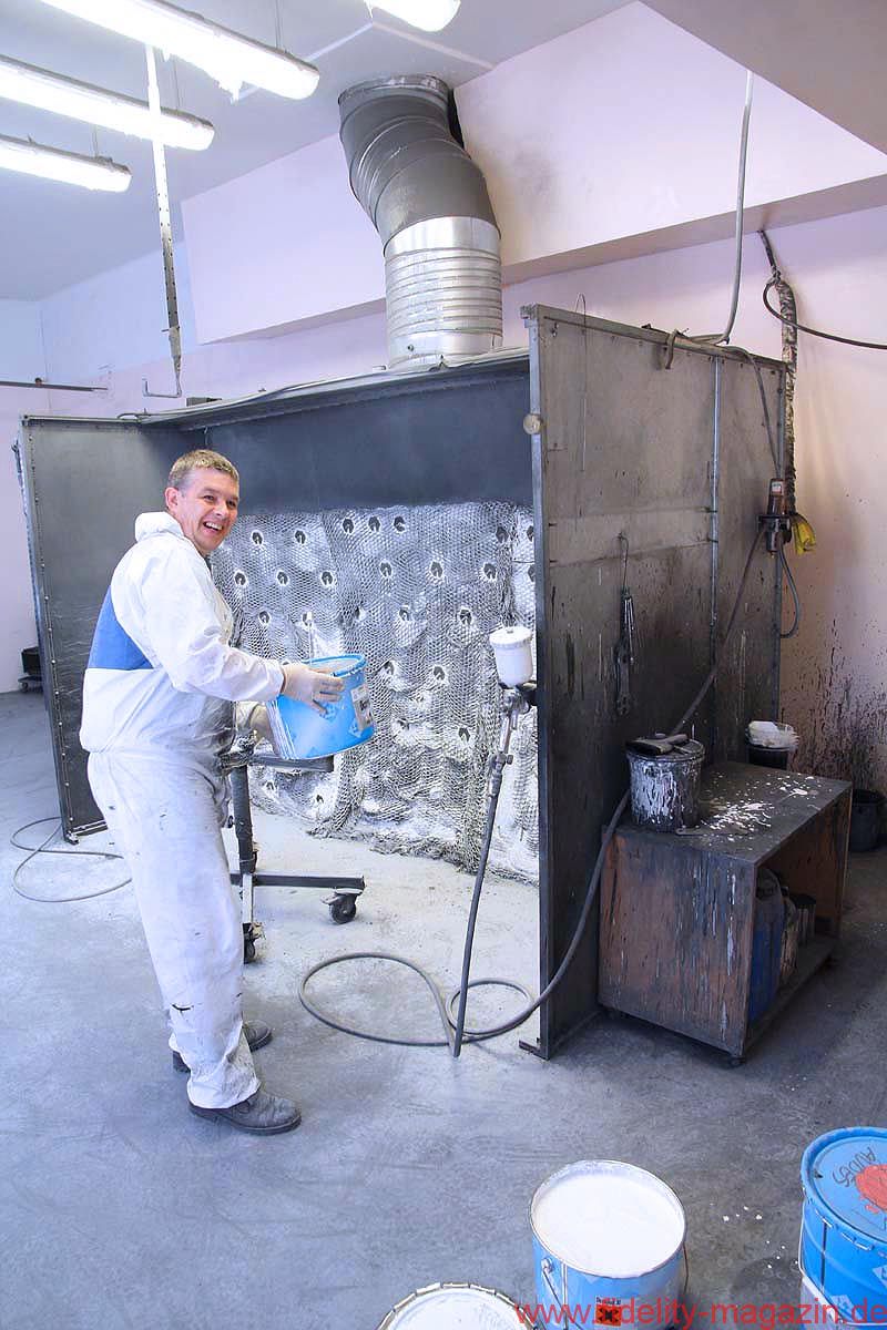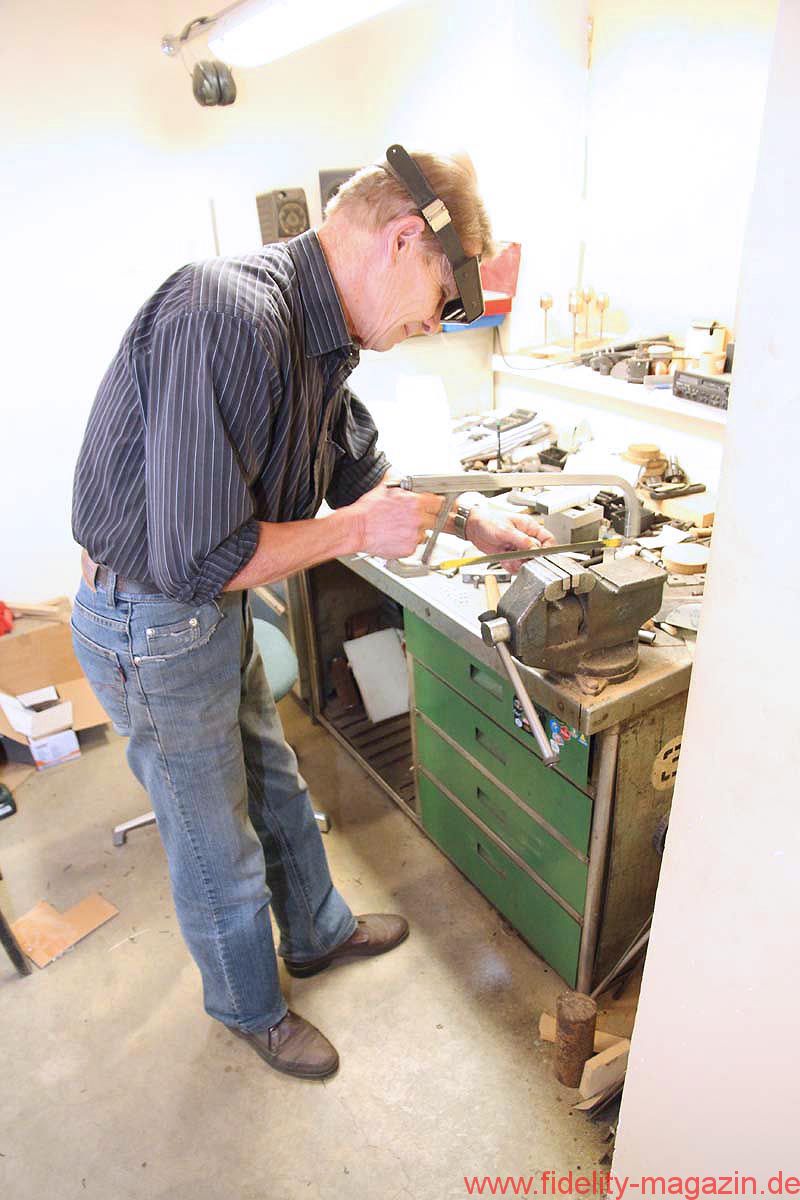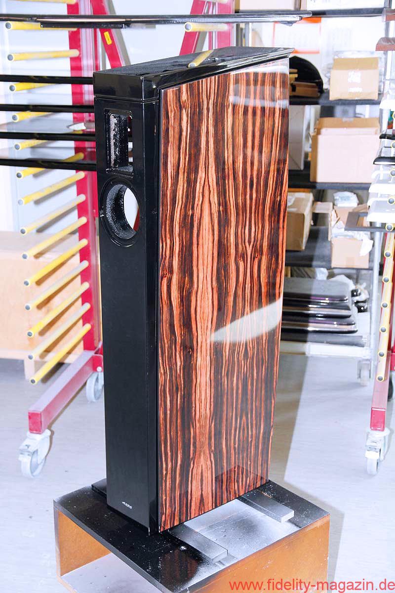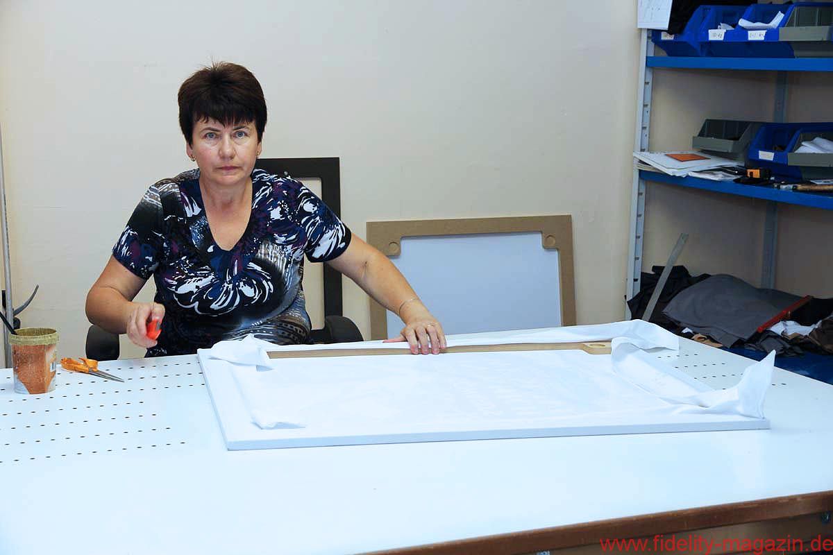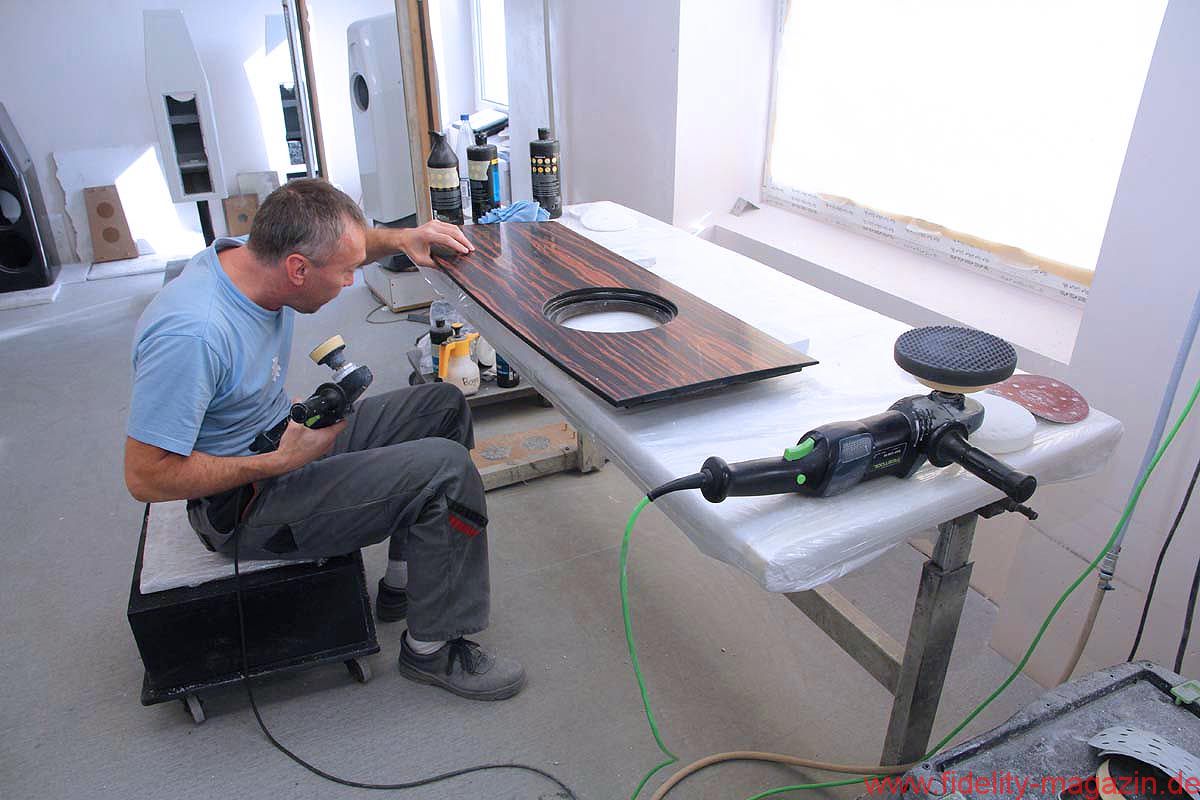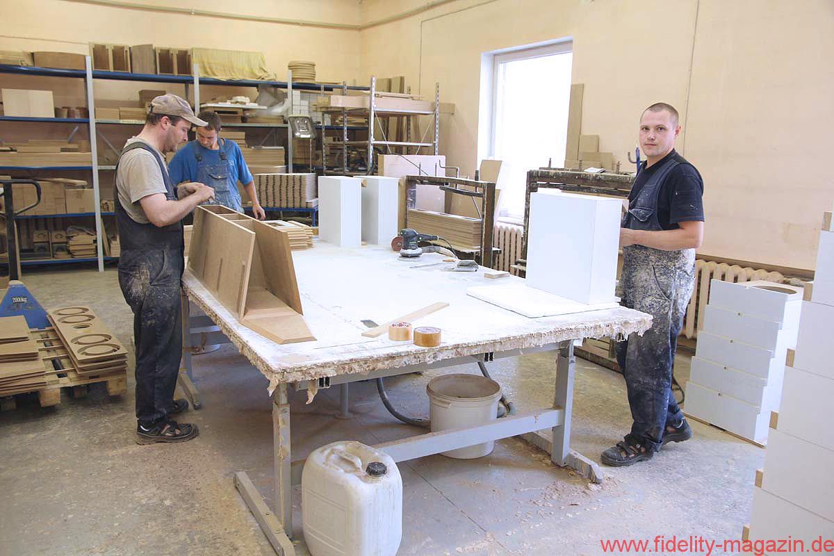 Ein echtes Glanzstück von Audes ist, im wahrsten Sinne des Wortes, die hauseigene Lackiererei. Insbesondere die Spezialisten für die Hochglanzveredelung genießen ein ruhiges Arbeitsklima und polieren tagaus, tagein an wunderschönen Holzgehäusen herum, bis auch der kritischste Blick nichts mehr zu meckern hat. Und, hey, das da hinten sind doch die Gehäuse von, ääh … – Ja, genau, unterbricht Igor verschmitzt. Fotografierverbot? Yep.
