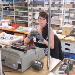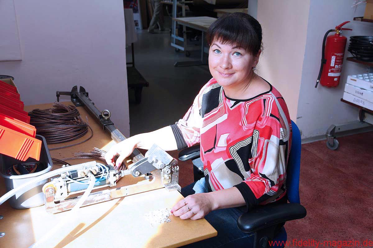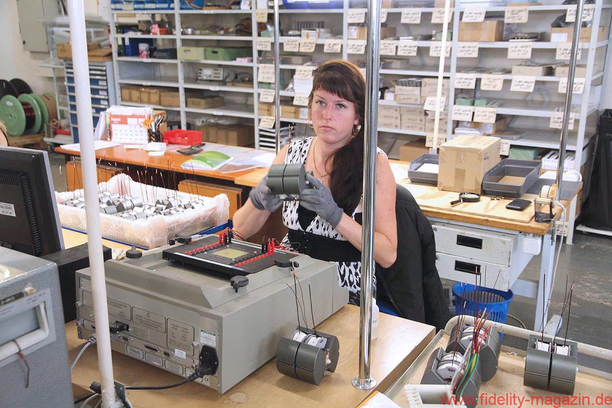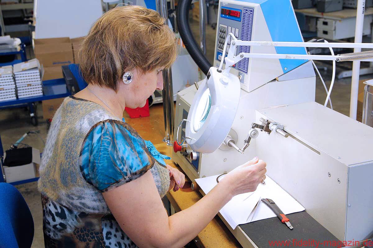 Vorbei an einem ganzen Raum voller vorgefertigter Frequenzweichen landen wir schließlich bei einer jungen Dame, die – weitläufig umgeben von diversen Lautsprecherkörben, Membranen und Phaseplugs – ihrer Montagearbeit nachgeht. Sie schaut nicht einmal hoch, als ich den Kamerablitz quäle, so konzentriert ist sie bei der Sache. Am anderen Ende des Raumes sitzt eine fröhliche Kollegin an einem weißen Tisch und crimpt Lautsprecherkabelstücke. Und auch deren Werkstücke sehen tadellos aus.