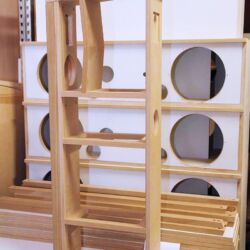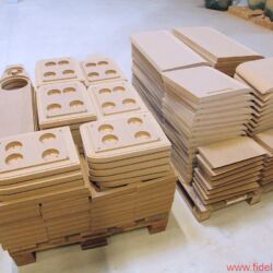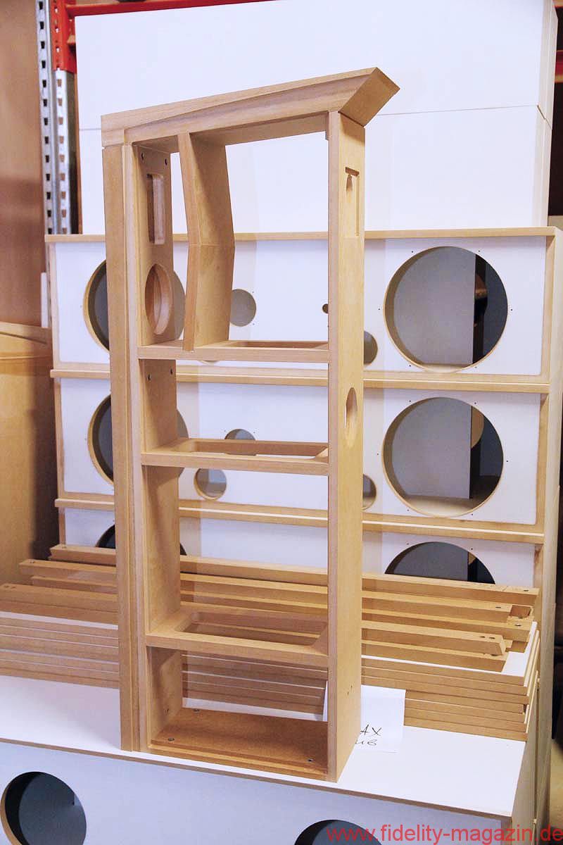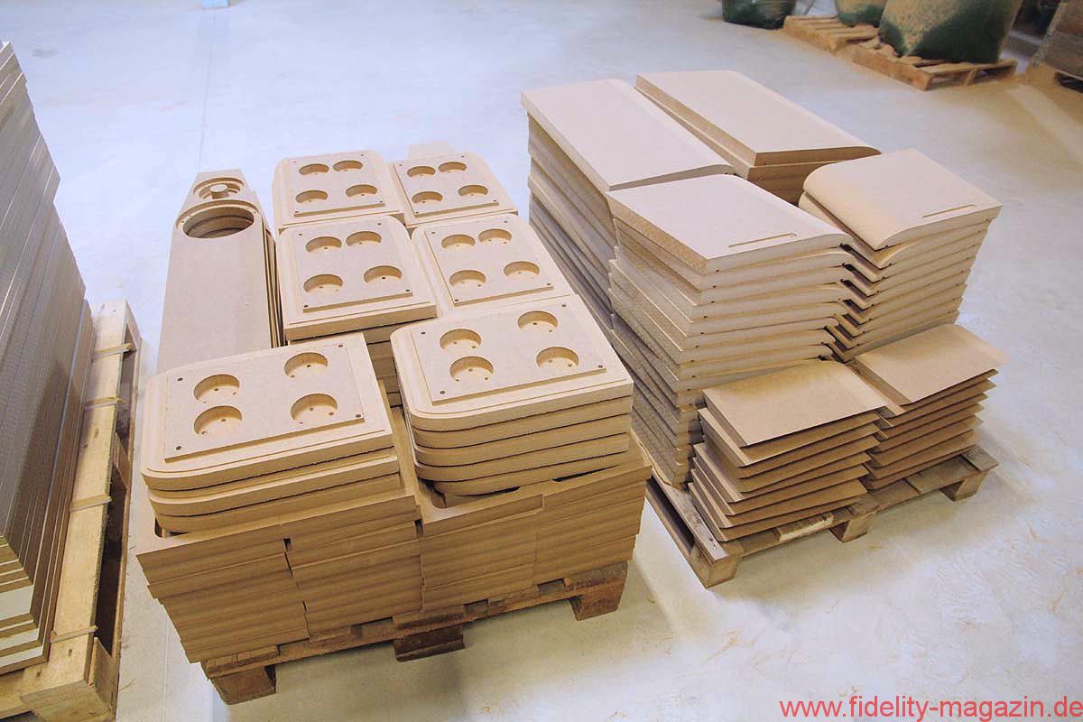 Ein paar Meter weiter links sind einige sichtbare Ergebnisse der professionellen Präzisionsmaschine gestapelt. Elegant angephaste MDF-Teile warten auf den baldigen Weitertransport. Noch kann sich der zuständige Gabelstapler hier recht frei bewegen, rundherum ist in dieser Halle genügend Platz für kommende Erweiterungen. Ein hohes Schwerlastregal, das mit reisefertigen Lautsprechergehäusen gefüllt ist, weist schon mal in die richtige Richtung.
