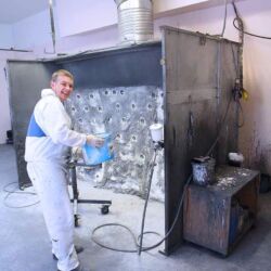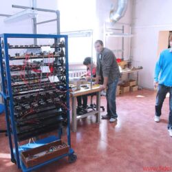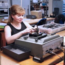 Anderswo auf dem Firmengelände steht nicht (mehr) ganz so viel Platz zur Verfügung. In der hausei-genen Spulenwicklung zum Beispiel – Audes verfügt über eine bisweilen verblüffende Fertigungstiefe – stehen die Maschinen schon deutlich dichter gedrängt. Hier herrscht geschäftiges Treiben. In der hintersten Ecke, in seiner eigenen kleinen Werkstatt, feilt ein großer dünner Mann im blauen Arbeitskittel an einem eingespannten Aluminiumstück. Ja, sagt Igor, Audes ist auch für die eigene Metallverarbeitung wohlbekannt. Und sein Mann in der kleinen Werkstatt, mit der Vergrößerungsbrille auf dem Kopf und der Feile in der Hand, der ist für Sonderanfertigungen und Prototypen zuständig. In einer Art Nebenhalle scheint die Zeit aber ein wenig stehen geblieben zu sein. Die hellgrünen, übermannshohen Stanz-, Falz- und Pressmaschinen – viele noch aus sowjetischen Zeiten – stehen heutzutage eher still, werden nur noch selten angeworfen, funktionieren aber bestens.