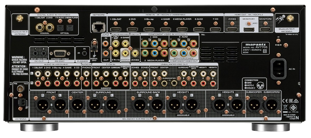 Unter Audiophilen ist es schon lange übliche Praxis, Vorverstärker- und Endstufen-Sektionen auf diese Weise voneinander zu trennen. Dies ermöglichte die Optimierung der Leistungsaufnahme und der Schaltkreise für ihren jeweiligen Zweck. Obwohl der AV7705 mit der neuesten und umfangreichsten Heimkino- und Audiotechnik ausgestattet ist, bietet er auch ein absolut puristisches Design, wobei seine Ausgänge über 11.2 Kanäle konventioneller Phono- und symmetrischer XLR-Buchsen verteilt sind.