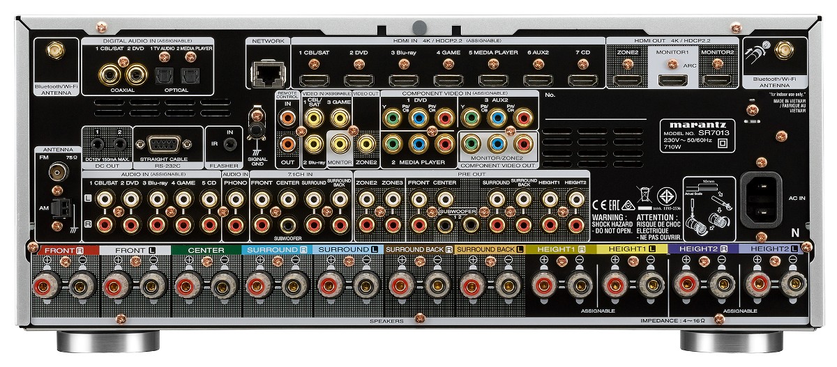 Mit acht HDMI-Eingängen, einer davon befindet sich auf der Vorderseite, und drei HDMI-Ausgängen kann der SR7013 aktuelle und künftige 4K-Videoformate verarbeiten: 4K/60 Hz Full-Rate-Passthrough, 4:4:4-Farbauflösung, HDR, BT.2020 und Hybrid Log Gamma. Der Receiver ist kompatibel mit Dolby Vision und ist in der Lage auch ältere Videoformate auf 1080p und 4K Ultra HD (60 Hz) anzuheben, indem analoge Video-Eingänge auf HDMI konvertiert werden. Außerdem wird eARC unterstützt, um die Wiedergabe von hoch aufgelöstem Heimkinosound zu vereinfachen.