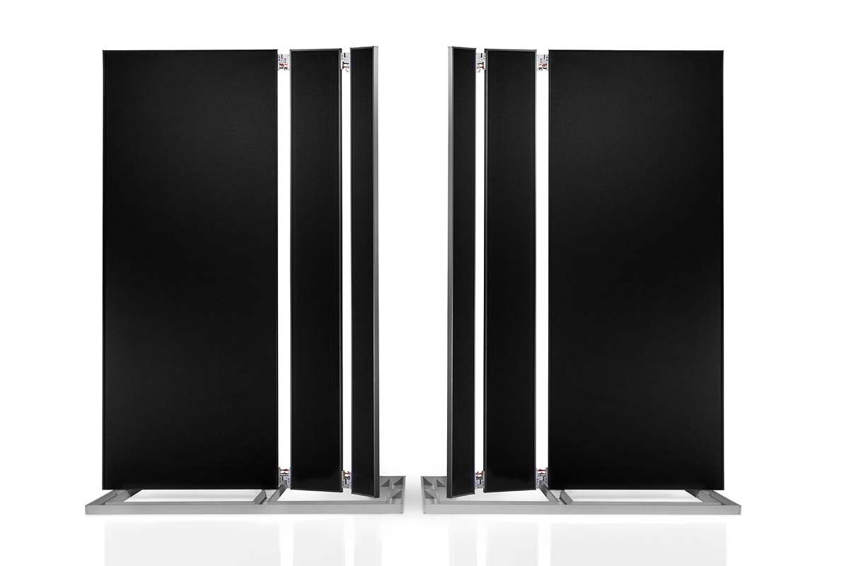 Das Besondere dabei ist, dass die Neodym-Stabmagnete zwischen den beiden Folien liegen, eine Membran davor, die andere dahinter. Auf diese Weise wirkt auf beide Folien an jedem Ort in Summe die gleiche Kraft, was maßgeblich zu einer drastischen Reduzierung der Verzerrungen durch ansonsten unvermeidbare Nichtlinearitäten führt. Die beiden hauchdünnen Folien bestehen aus dem Kunststoff Mylar 6µ. Das Resultat ist ein flächiger Antrieb der gesamten Membranfolie – und hier liegt auch einer der Vorteile von Magnetostaten gegenüber konventionellen Lautsprechern begründet. Im Gegensatz zum eher punktuellen Antrieb durch die Schwingspule eines konventionellen Lautsprechers verhindert der flächige Antrieb Partialschwingungen, also ein unkontrolliertes Eigenleben der Membran.