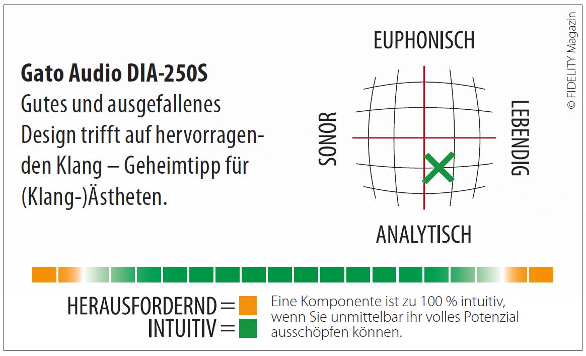 Überflüssig zu erwähnen, dass der Verstärker von Gato Audio so richtig Spaß macht, wenn es um Krawall und Remmidemmi geht – ob Queens Of The Stone Age oder Karajan, John Zorn oder System Of A Down, ist da einerlei. Der DIA-250S verhält sich so unauffällig und neutral, wie man es von einem Verstärker erwartet. Was er aber zweifelsohne hat, ist tatsächlich so etwas wie Seele: Er sticht wohltuend aus dem unendlich scheinenden Angebot von Verstärkern heraus, die unterschiedliche Konzepte und Ausstattungsmerkmale haben mögen, aber sich klanglich immer stärker aneinander angleichen. Der DIA-250S verfärbt nicht und betreibt auch keine Schönmalerei, hat aber eine eigene Nuance, ja: Persönlichkeit. Er unterscheidet sich angenehm vom ausnivellierten Mainstream und verschafft für unter 4000 Euro ein eindrucksvolles Hörerlebnis – das wesentlich teurer klingt.
